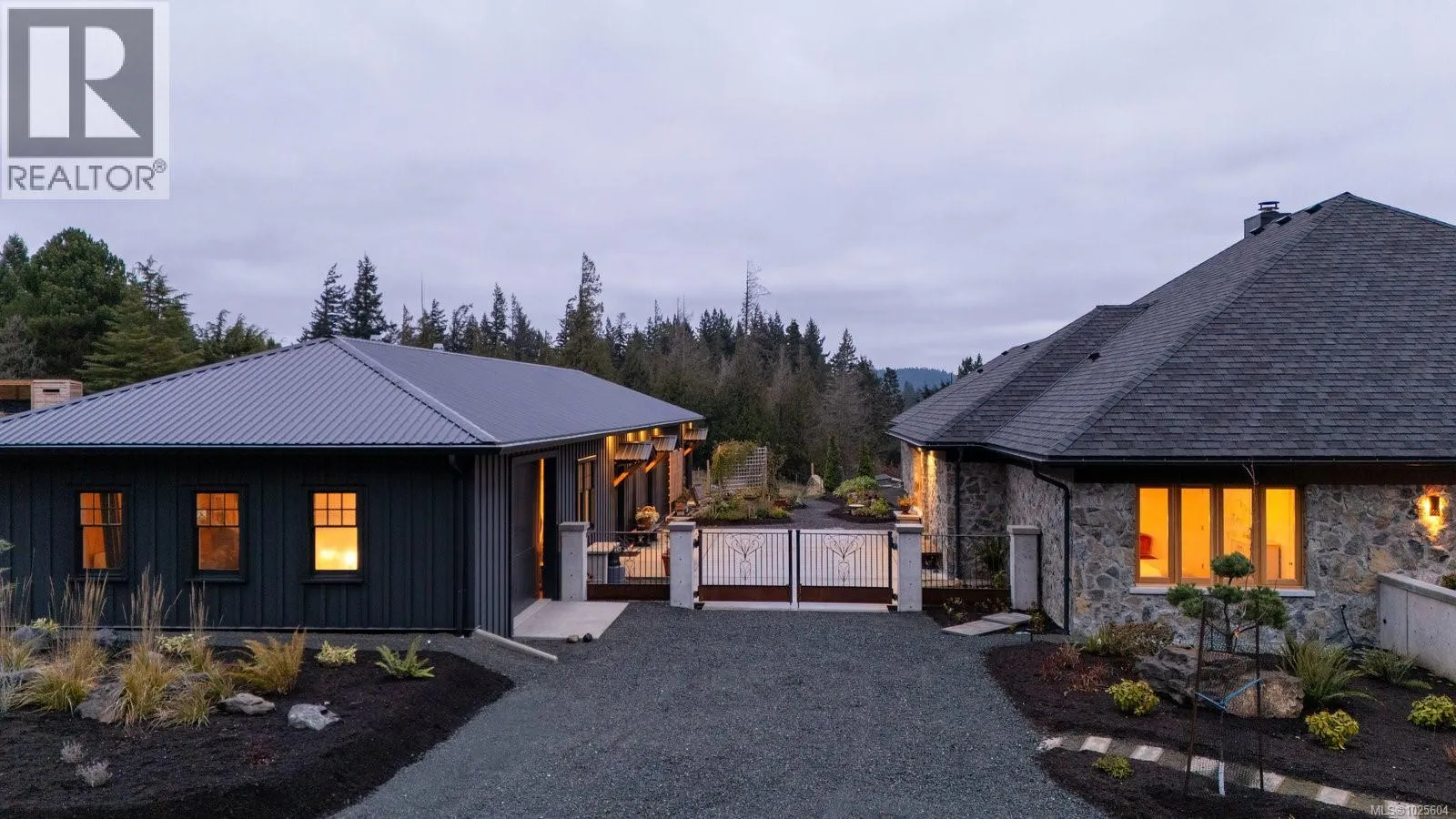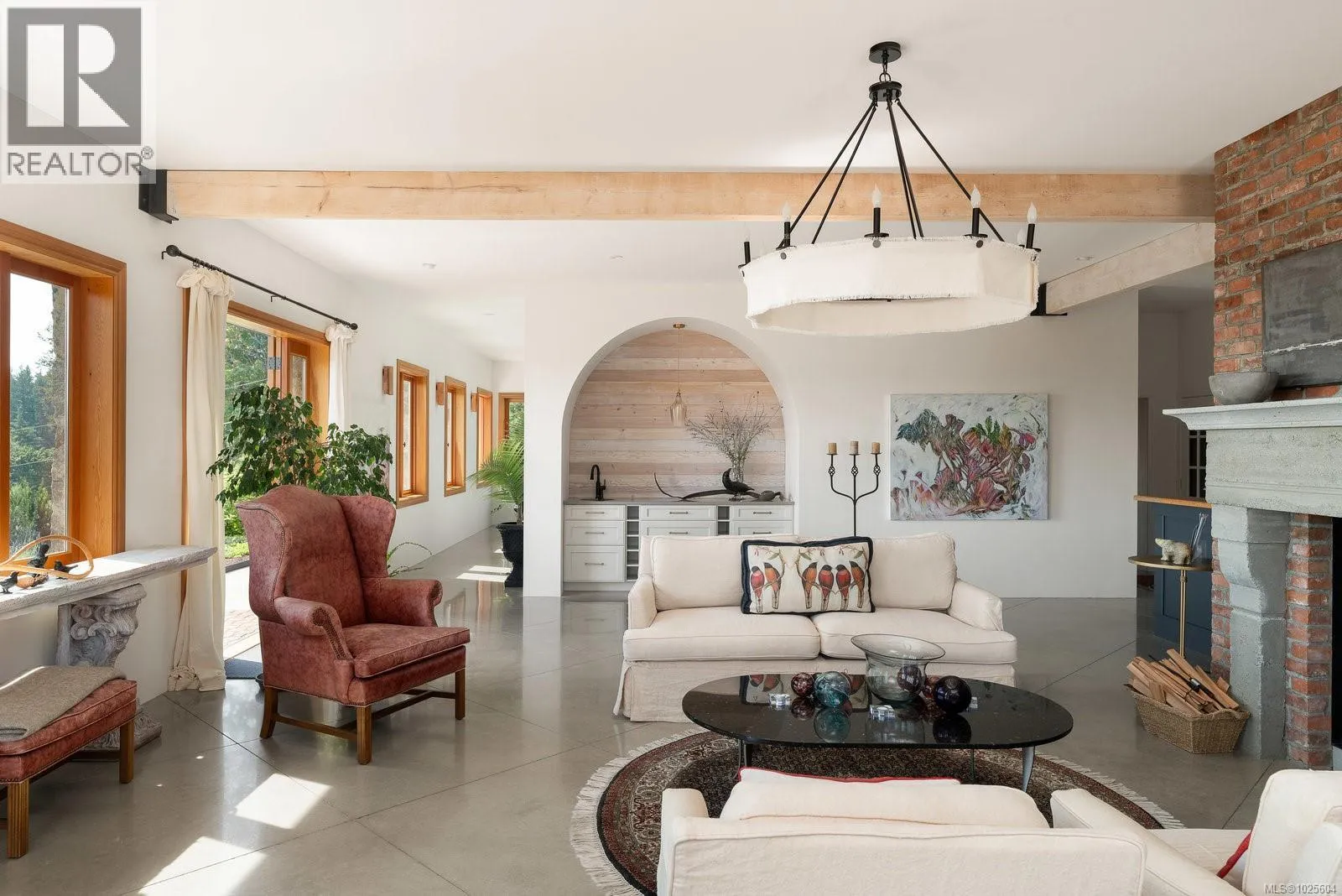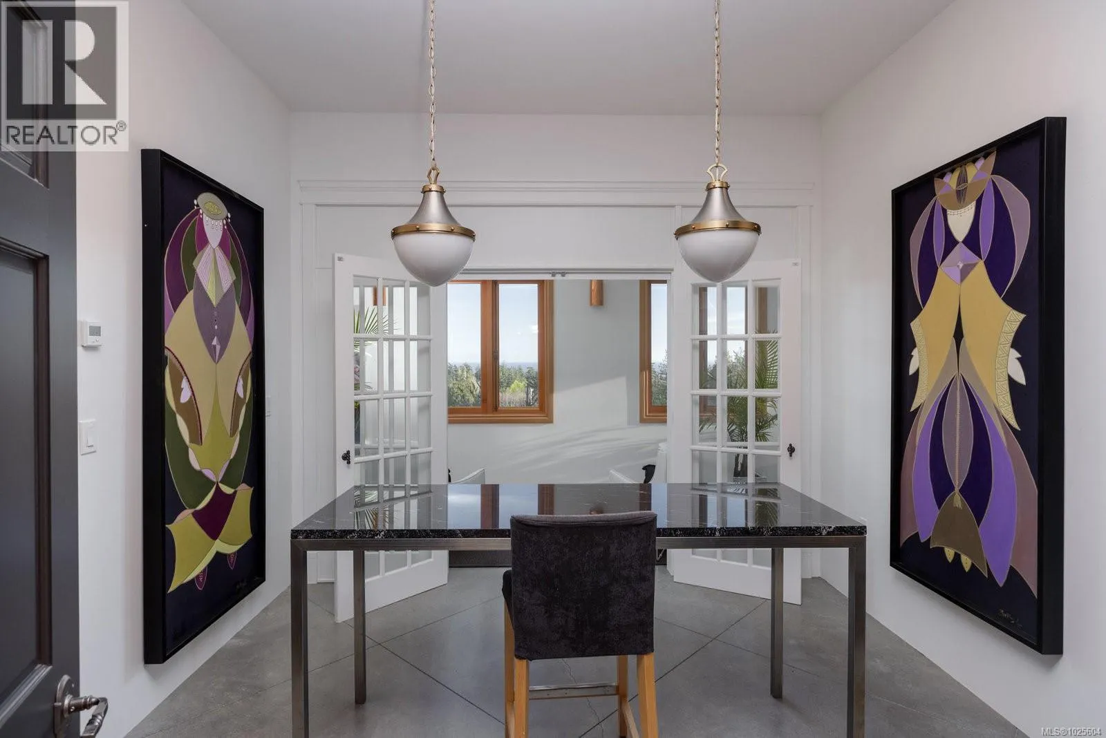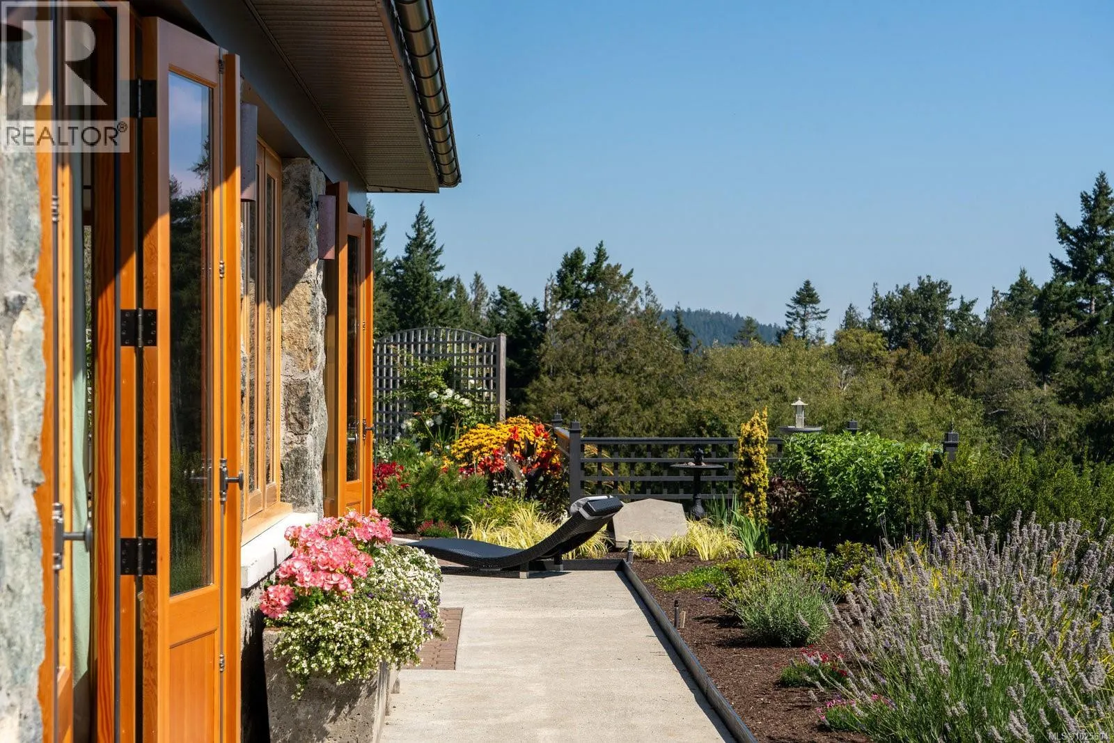 Nestled on 2.4 acres of gently rolling hillside, this exceptional Metchosin estate combines a spacious 4,000 plus square foot single-level home with a 1,380 square foot detached building featuring an art studio complete with its own bathroom, plus a workshop and garage. The exterior reflects timeless French provincial elegance, with a granite façade, wrought iron detailing, and a concrete water feature that immediately signals the level of craftsmanship inside. Inside, the home blends warmth with artistry. Polished concrete floors, exposed ceiling beams, reclaimed brick accents, and inlaid wood detailing create a layered, inviting atmosphere rarely seen in modern construction. The expansive great room is centered around a bespoke fireplace and opens to the patio through multiple custom French doors, making it ideal for both entertaining and everyday living. The kitchen is thoughtfully designed, featuring a dedicated prep area that complements the main cooking space for convenience and functionality. The primary suite provides a serene retreat, offering comfort and privacy for even the most discerning homeowner. Geothermal heating enhances energy efficiency and lowers the homeâs environmental impact. From every vantage point, the property offers sweeping vistas across Haro Strait to the Olympic Mountains, providing a dramatic and inspiring natural backdrop to this one-of-a-kind estate. (id:27476)