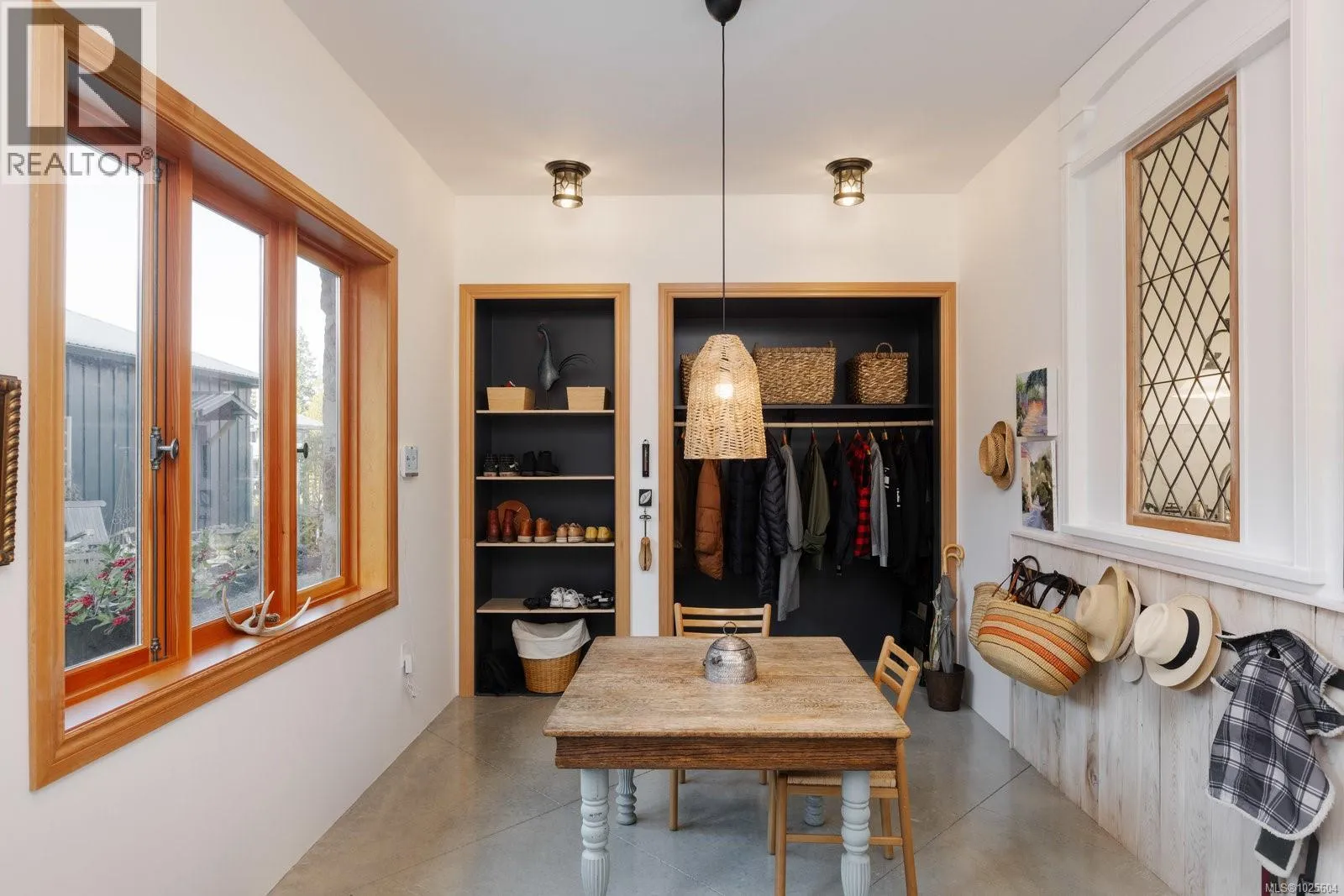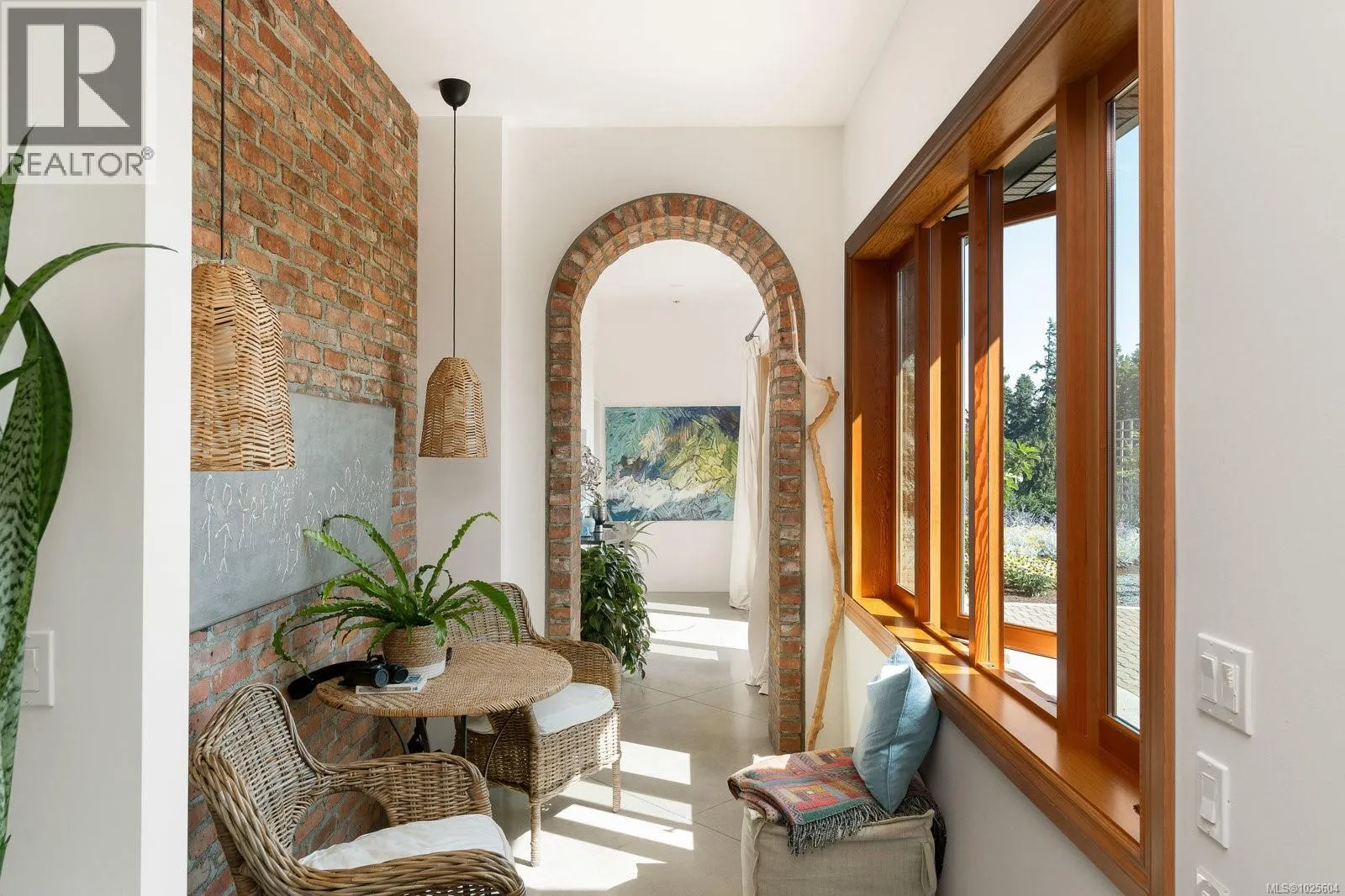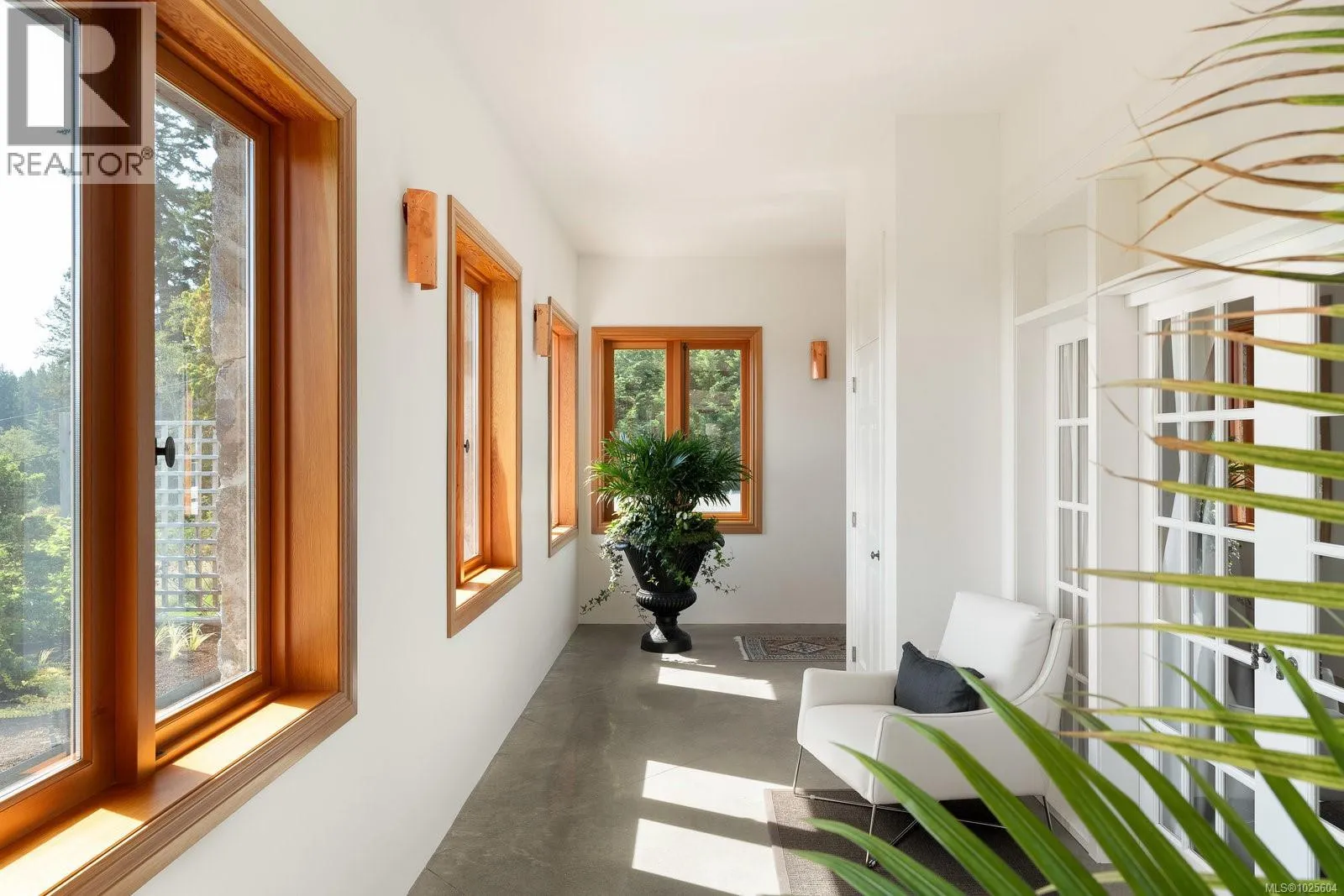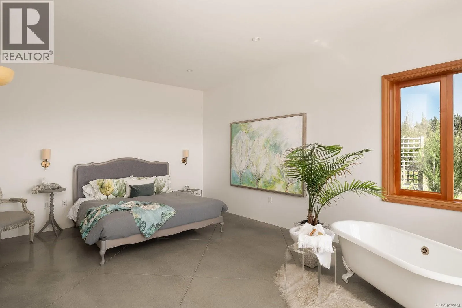 Nestled on 2.4 acres of gently rolling hillside, this exceptional Metchosin estate combines a spacious 4,000 plus square foot single-level home with a 1,380 square foot detached building featuring an art studio complete with its own bathroom, plus a workshop and garage. The exterior reflects timeless French provincial elegance, with a granite façade, wrought iron detailing, and a concrete water feature that immediately signals the level of craftsmanship inside. Inside, the home blends warmth with artistry. Polished concrete floors, exposed ceiling beams, reclaimed brick accents, and inlaid wood detailing create a layered, inviting atmosphere rarely seen in modern construction. The expansive great room is centered around a bespoke fireplace and opens to the patio through multiple custom French doors, making it ideal for both entertaining and everyday living. The kitchen is thoughtfully designed, featuring a dedicated prep area that complements the main cooking space for convenience and functionality. The primary suite provides a serene retreat, offering comfort and privacy for even the most discerning homeowner. Geothermal heating enhances energy efficiency and lowers the homeâs environmental impact. From every vantage point, the property offers sweeping vistas across Haro Strait to the Olympic Mountains, providing a dramatic and inspiring natural backdrop to this one-of-a-kind estate. (id:27476)