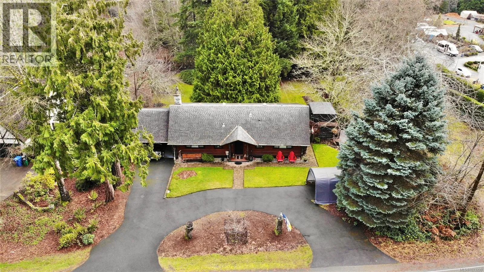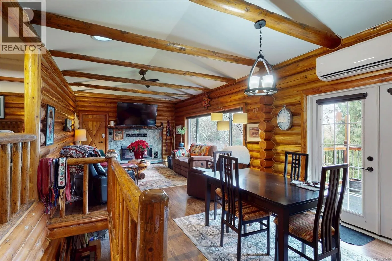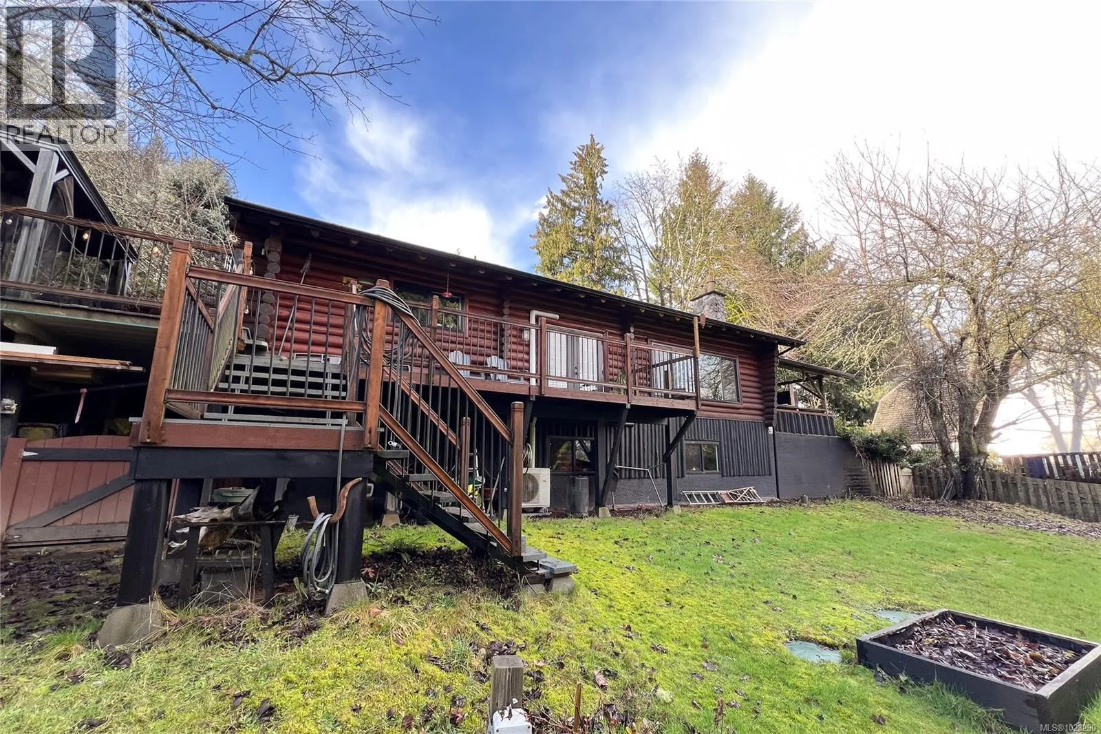 Discover the charm of this rustic log home in South Mill Bay, nestled on a tranquil half-acre lot at the end of a quiet no-thru roadâjust 17 minutes from Langford. This inviting three-bedroom rancher features the warmth of wood throughout and a full walkout lower level. The living and dining area exudes cozy ambience with a wood-burning fireplace and new French doors opening to a spacious deck overlooking a fenced backyard with plum and apple trees. Recent upgrades include a stunning new kitchen with heated floors, a new ensuite and refreshed second bathroom, new vinyl windows and doors, a heat pump, pellet stove, and improvements to both the septic system and well. Downstairs offers a family room, third bedroom, bathroom, and a large unfinished space perfect for a workshop, hobby room, wine-making area, or more living space? Outside, enjoy the expansive yard and a charming log outbuilding with windows and a concrete floorâideal for an artistâs studio. The home also features a high-producing well, beautifully refinished exterior logs, a roomy attached carport, and a circular driveway for easy access and parking. (id:27476)