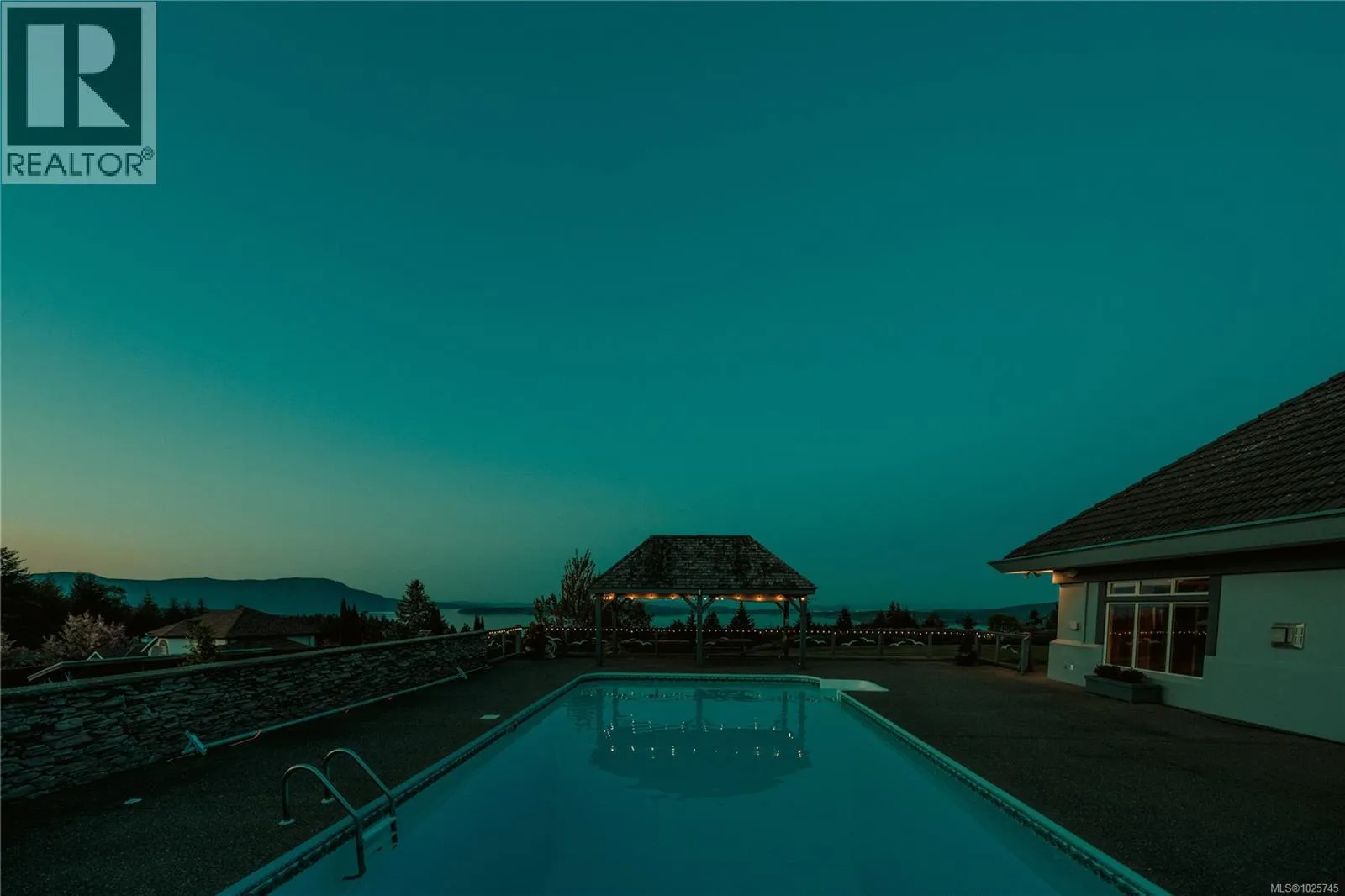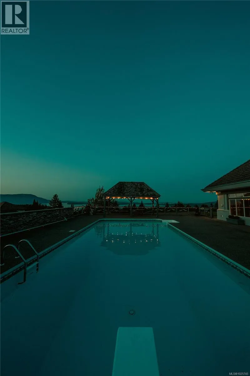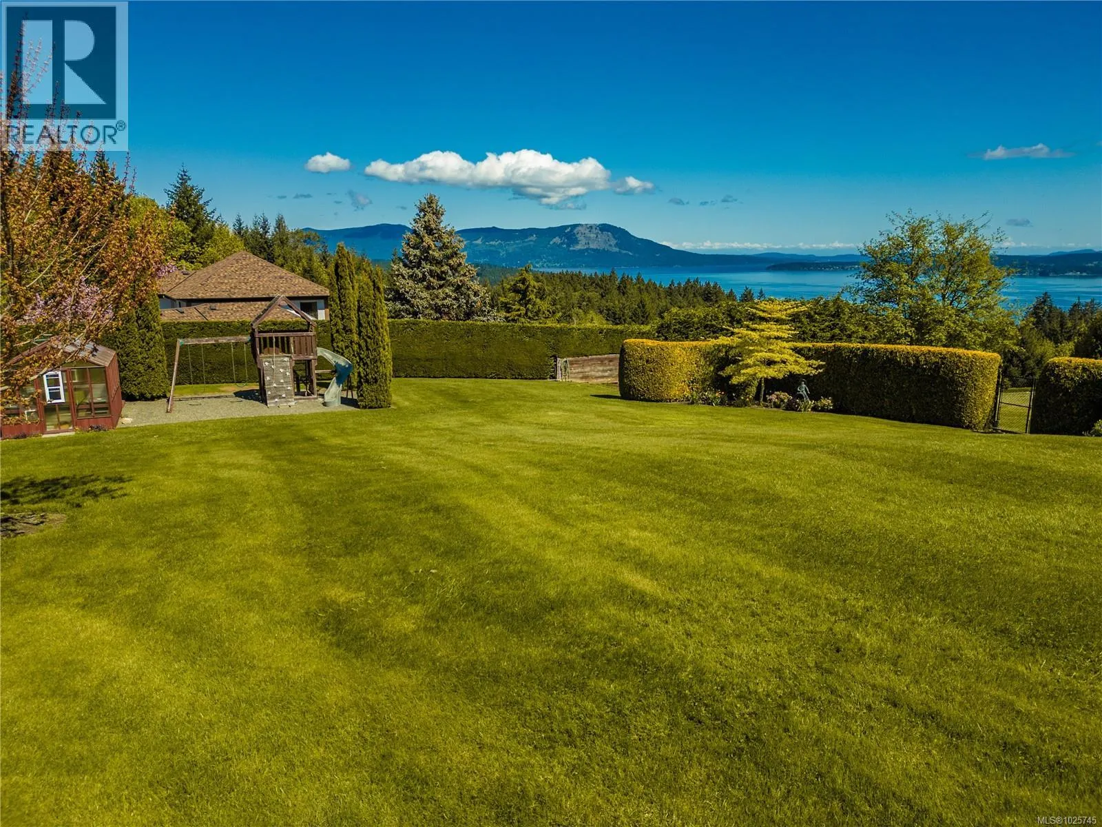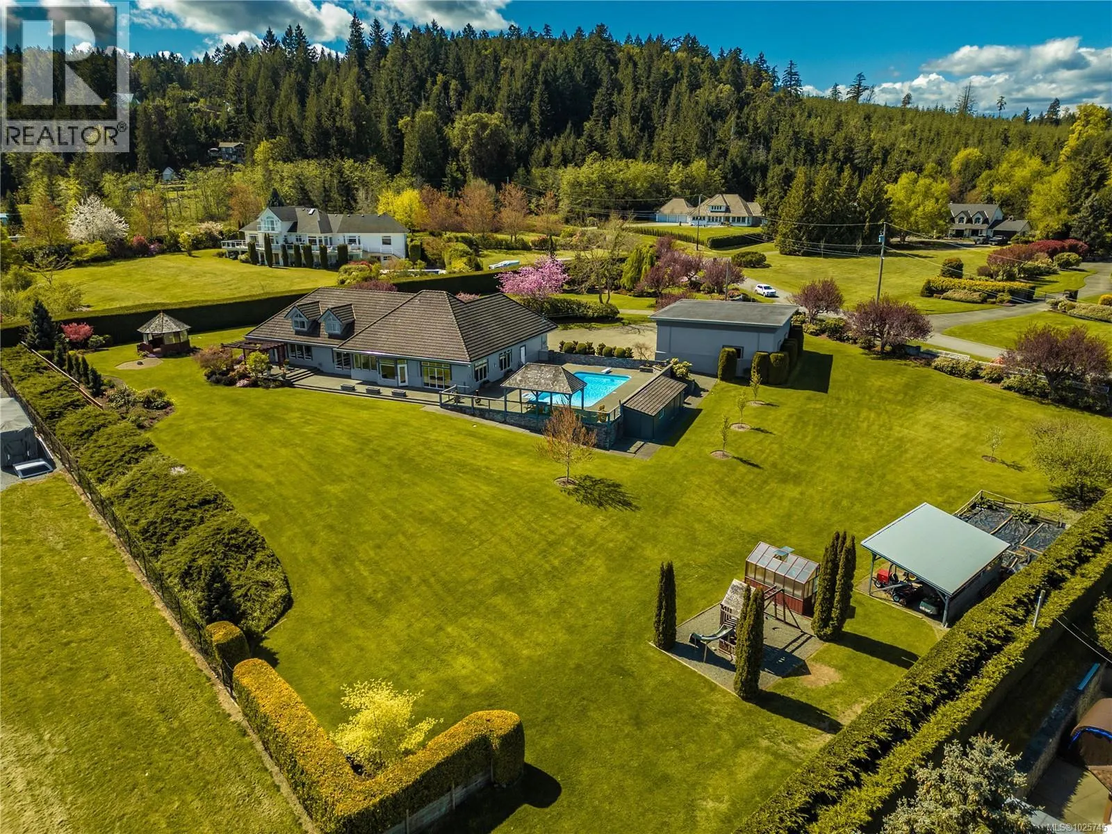 Presenting an extraordinary opportunity to own a custom-built high-efficiency home, looking for its second owners, nestled on two acres of perfectly landscaped grounds, offering sweeping, unobstructed ocean views. Meticulously maintained, this private estate is a rare find, combining luxury living with the tranquillity of nature. This exceptional four-bedroom, three-bathroom residence features soaring 15-foot vaulted ceilings, rich oak flooring, and two stylish propane fireplaces, creating a warm and inviting atmosphere. The gourmet kitchen is a chefâs dream, equipped with top-tier appliances and exquisite finishes. A custom wine room adds a touch of sophistication, perfect for the discerning collector. The property also includes an attached garage, along with a spacious oversized double detached garage, offering ample room for vehicles, storage, or a potential workshop. Outdoors, this property truly shines with a resort-inspired setting featuring a sparkling saltwater pool, an inviting cabana, and a picturesque gazeboâall set amidst a fully irrigated, landscaped oasis bordered by mature privacy hedges. A dedicated greenhouse and thoughtfully designed childrenâs playground offer versatility and family-friendly charm. A ride-on lawn mower is included for added convenience, making upkeep of the expansive grounds effortless. Ideally located near Brentwood and Shawnigan, with nearby shops, schools, and amenities. This home offers an exceptional lifestyle and seamlessly blends upscale living with everyday ease and comfort. (id:27476)