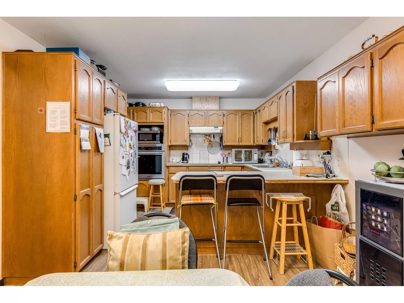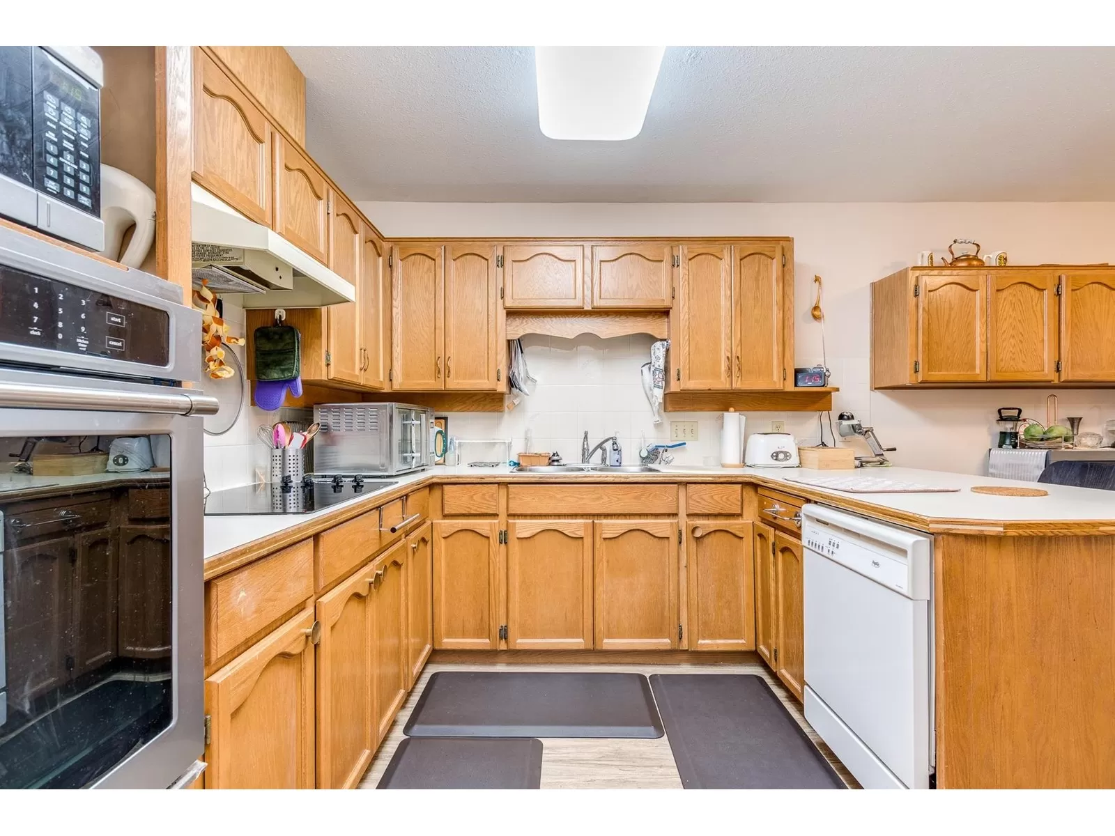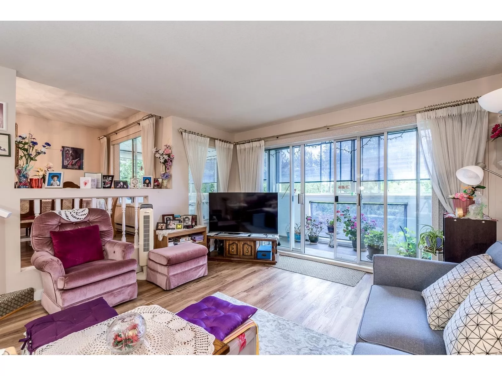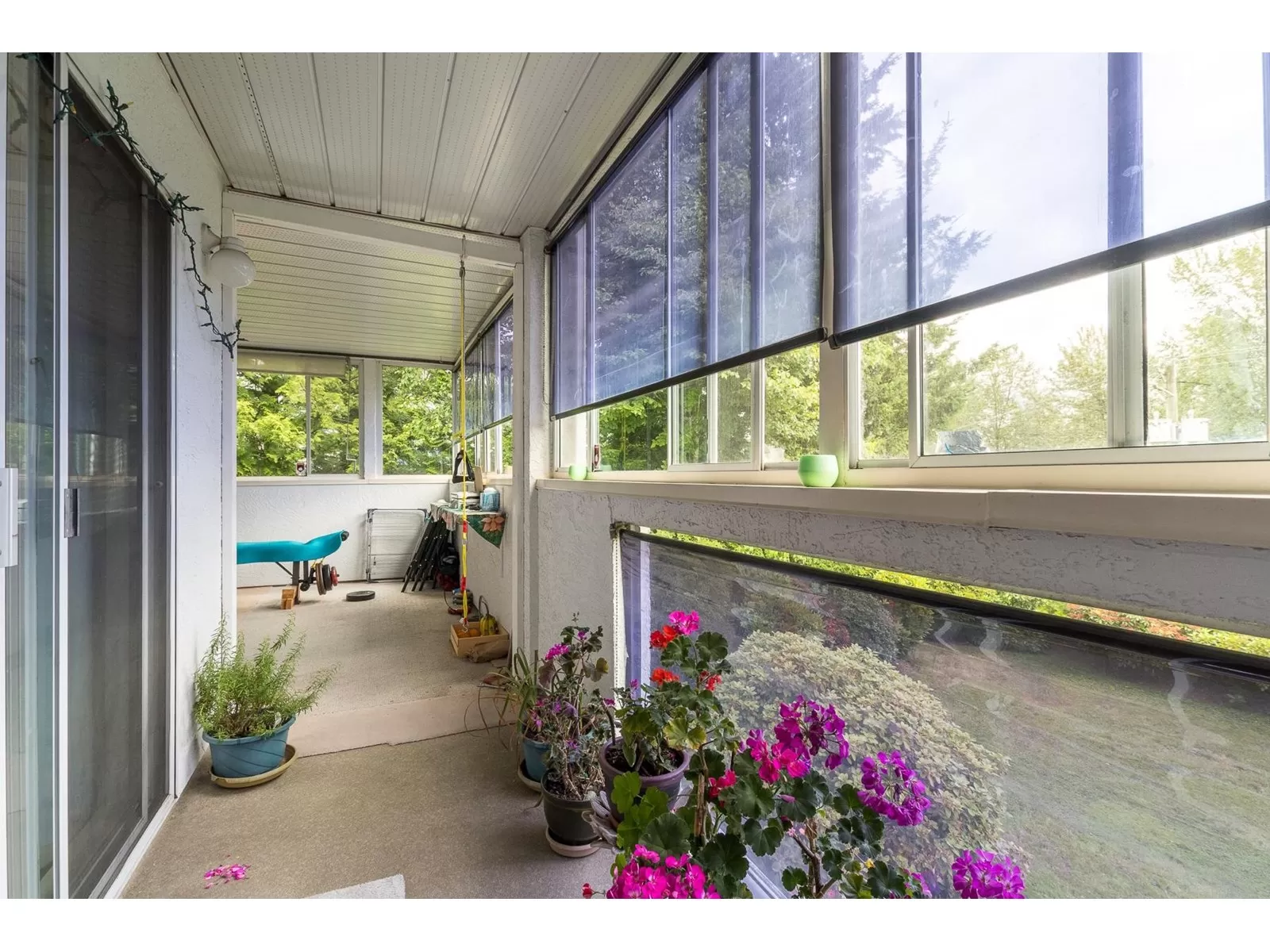 Located in a quiet, gated, 55+ adult-oriented complex at the end of a cul-de-sac. This ground floor entry end unit is spacious and bright with 3 bedrooms, 2 bathrooms, and over 1,400 sqft of living space. Huge oak kitchen with wall oven, stove top, breakfast bar, lots of cupboards, and open eating area. Formal dining room next to sunken living room with access to large solarium sundeck with southern view. Primary bedroom with walk-through closet and private 3 piece ensuite. 2 additional good size bedrooms, 4 piece main bath, and huge laundry room. Well maintained building with lush gardens. Walking distance of shopping, transit, and amenities. Bonus 2 parking - 1 open and 1 private garage, roof replaced in 2021. (id:27476)