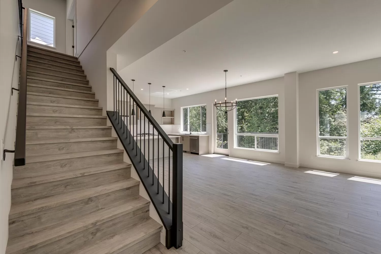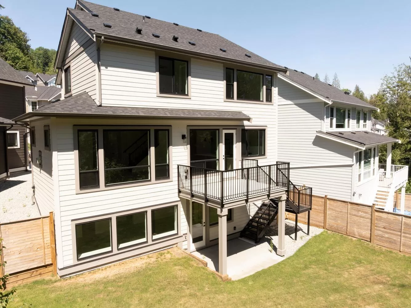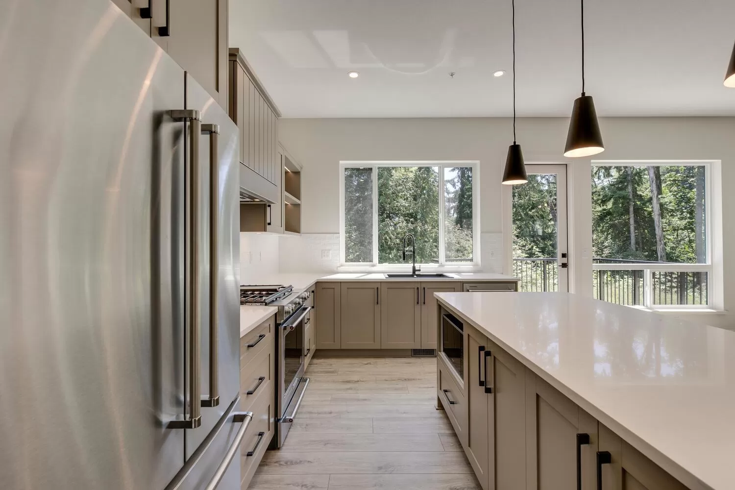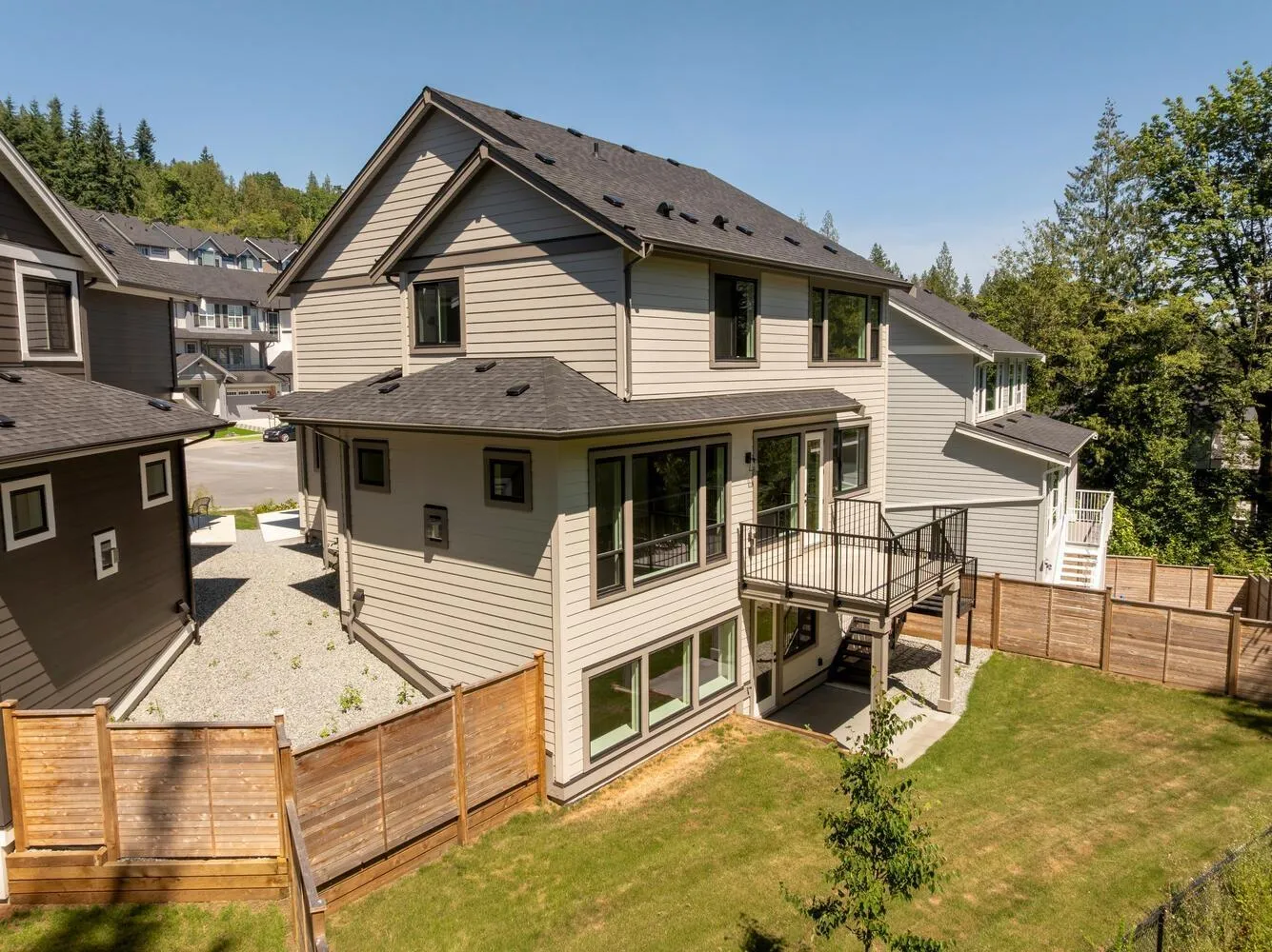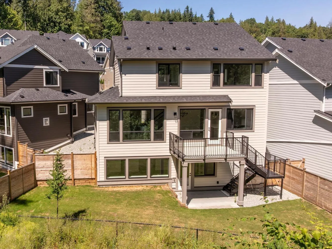Step into luxury living at Nelson & Grove, where this beautifully crafted 6-bedroom, 4-bathroom home blends comfort, elegance, and function. Nestled at the end of a quiet cul-de-sac on a rare pie-shaped lot, it backs onto a tranquil greenbelt-offering privacy and peaceful views. Inside, vaulted ceilings, wide plank floors, quartz surfaces, and sleek tile define the space. The chef's kitchen features stainless steel appliances, custom cabinetry, and a large quartz island. Expansive windows flood the home with natural light. Upstairs includes four bedrooms, including a serene primary suite with a spa-style 5-piece ensuite, walk-in shower, heated floors, and generous closet. The bright, walk-out basement offers two more bedrooms, a full bath, and a wet bar-perfect for entertaining! (id:27476)