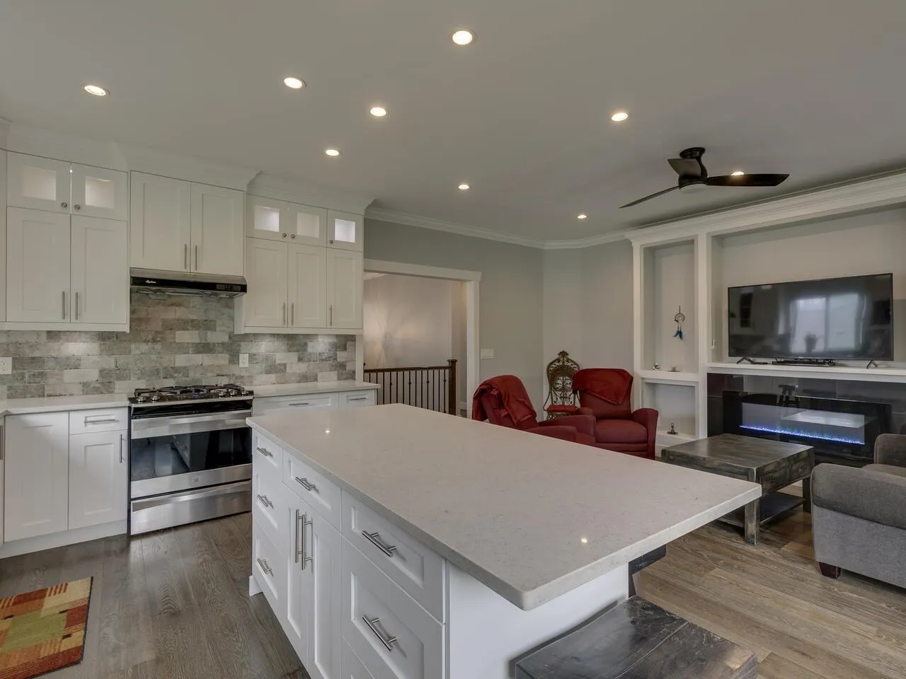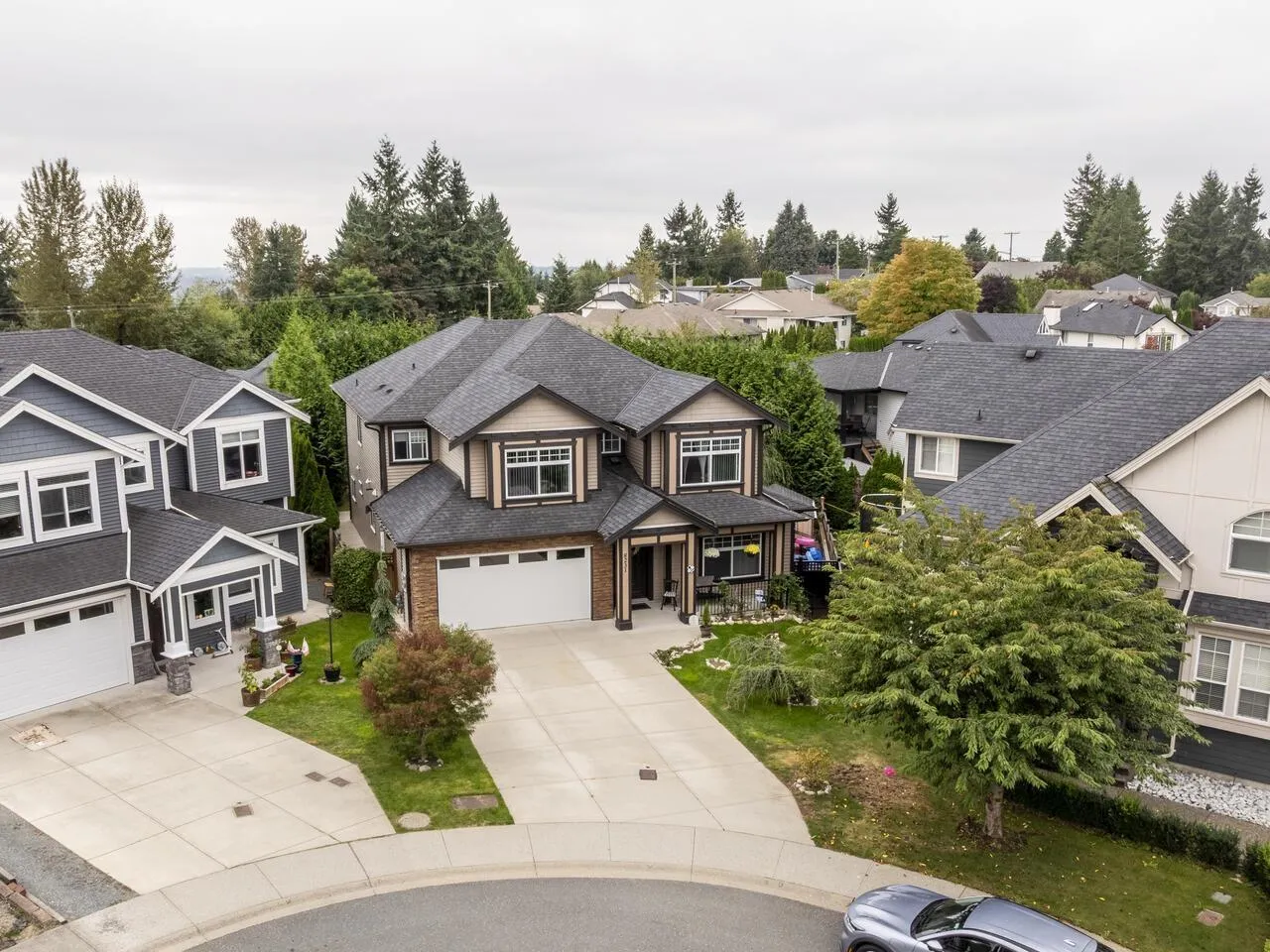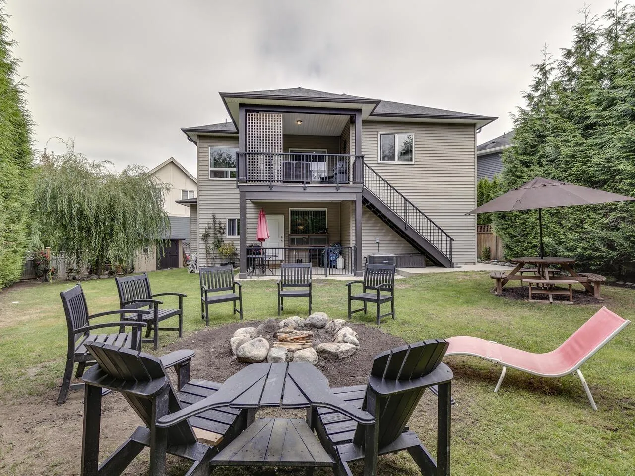 Spacious family home with mortgage helper or in-law suite on a quiet cul-de-sac. Main floor offers 9' ceilings, separate living and dining rooms with gas fireplace and built-in hutch. Bright kitchen with upper cabinet lighting, gas range hookup, and adjoining family room with electric fireplace. Covered deck off the kitchen is perfect for year-round use. Three bedrooms up, including a generous primary suite with walk-in closet and 5-piece ensuite. Basement features a large rec room with wet bar, full bathroom, and extra bedroom for main floor use. Plus a self-contained 2-bedroom suite-ideal for extended family or rental income. Large, private lot with mature hedging, fire pit area, and backyard retreat. (id:27476)