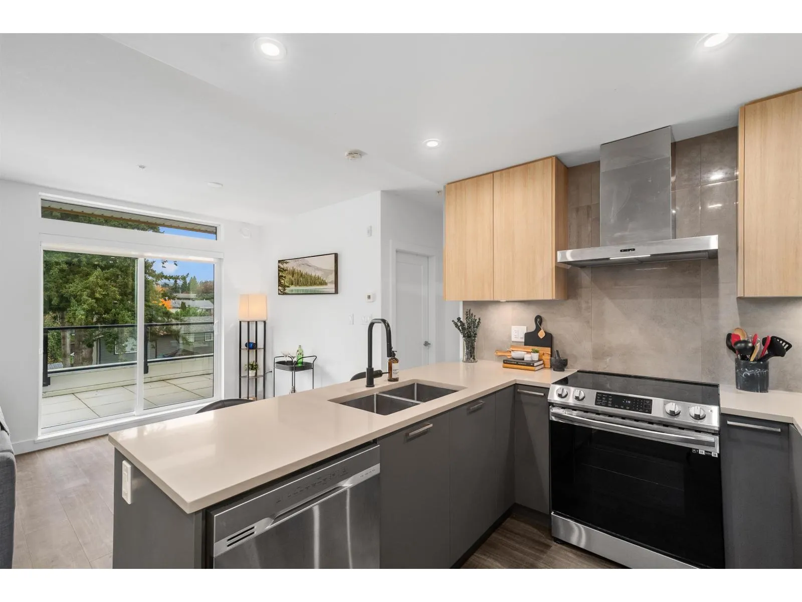 LIKE NEW 2 BEDROOM + DEN at WREN AND RAVEN. This TOP FLOOR, CORNER HOME offers a fantastic, modern, open-concept and BRIGHT layout. The spacious kitchen features S+S appliances, quartz countertops and breakfast bar. The primary bedroom is BIG, with walk through closet leading to a beautifully finished ensuite, while both bathrooms are generously sized with great storage. The den provides PERFECT flexibility for a home office/nursery or guest space. Step out and entertain on the HUGE 250sqft patio with peeking views of the Fraser. Additional highlights include FULL SIZED laundry, TWO underground parking stalls AND a storage locker. A perfect combination of style, convenience, and comfort in one of Mission's most desirable developments. OPEN HOUSE SUNDAY NOV 2nd 2-4! (id:27476)