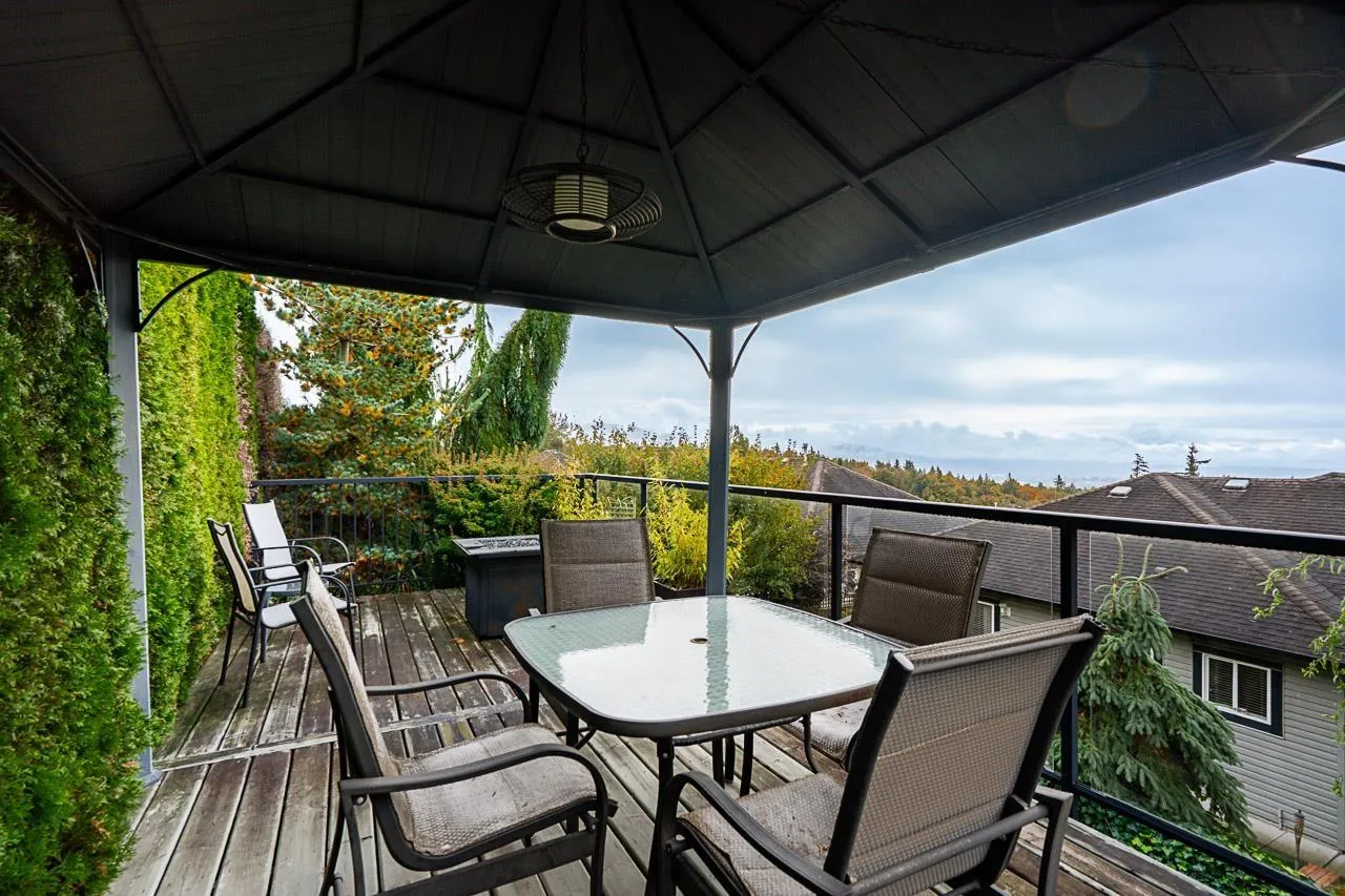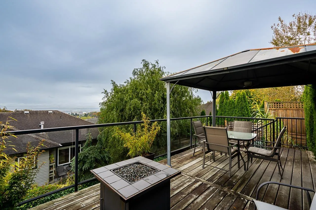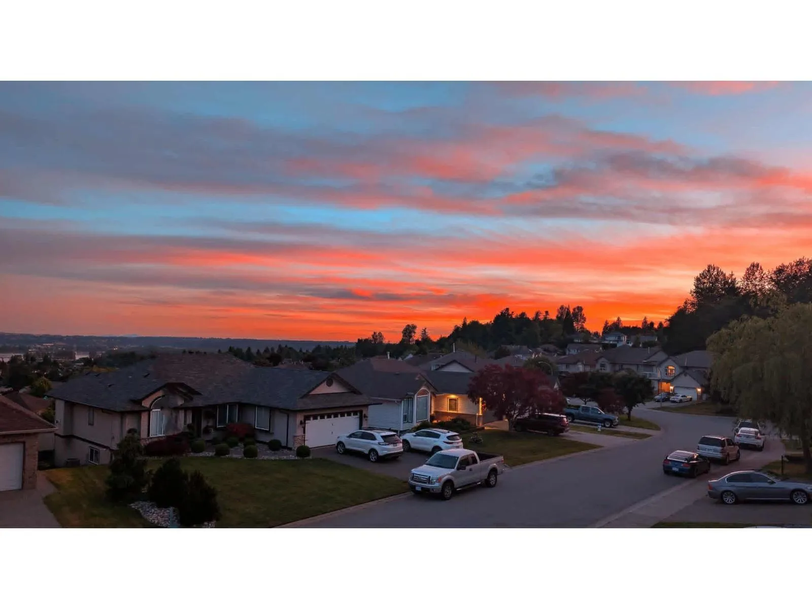 This 4-bed plus den, 3-bath home radiates island vibes, perched high above Grewal Cres. with sweeping views that make every day feel like a retreat. The open-concept layout, vaulted ceilings, and sun-filled spaces create a breezy, treehouse-like atmosphere. The main level features hardwood and heated tile in the kitchen, while the dining area opens to a large deck with 180° panoramic views, perfect for relaxing and watching the world go by. Upstairs, you'll find two bedrooms, including a hotel-inspired primary with a spa-like ensuite and heated floors. Downstairs offers a versatile den that could double as an extra bedroom, plus a bright one-bed self-contained suite. The tropical charm continues outdoors with lush landscaping and an upper deck designed for soaking in more of those views!!! (id:27476)