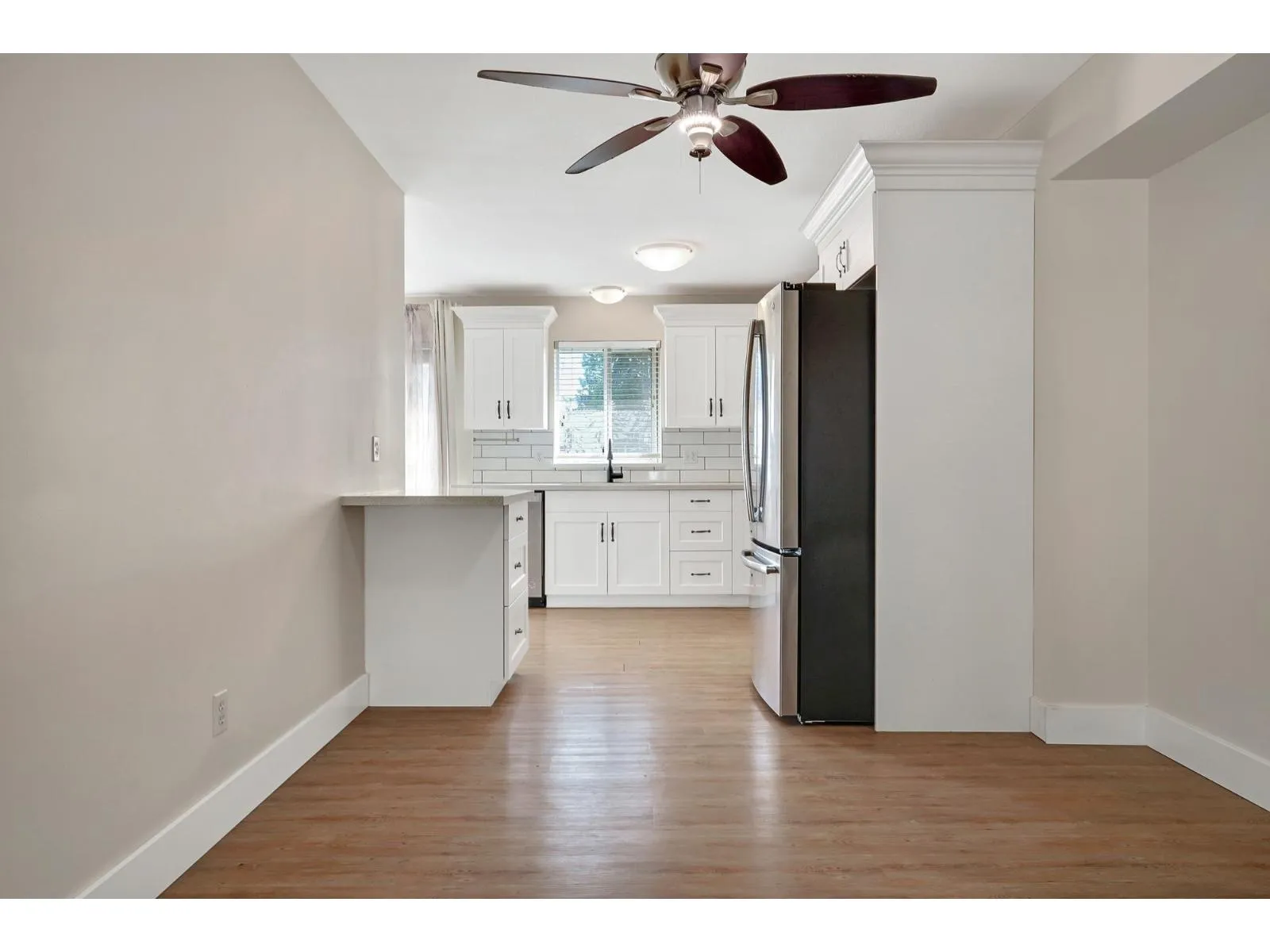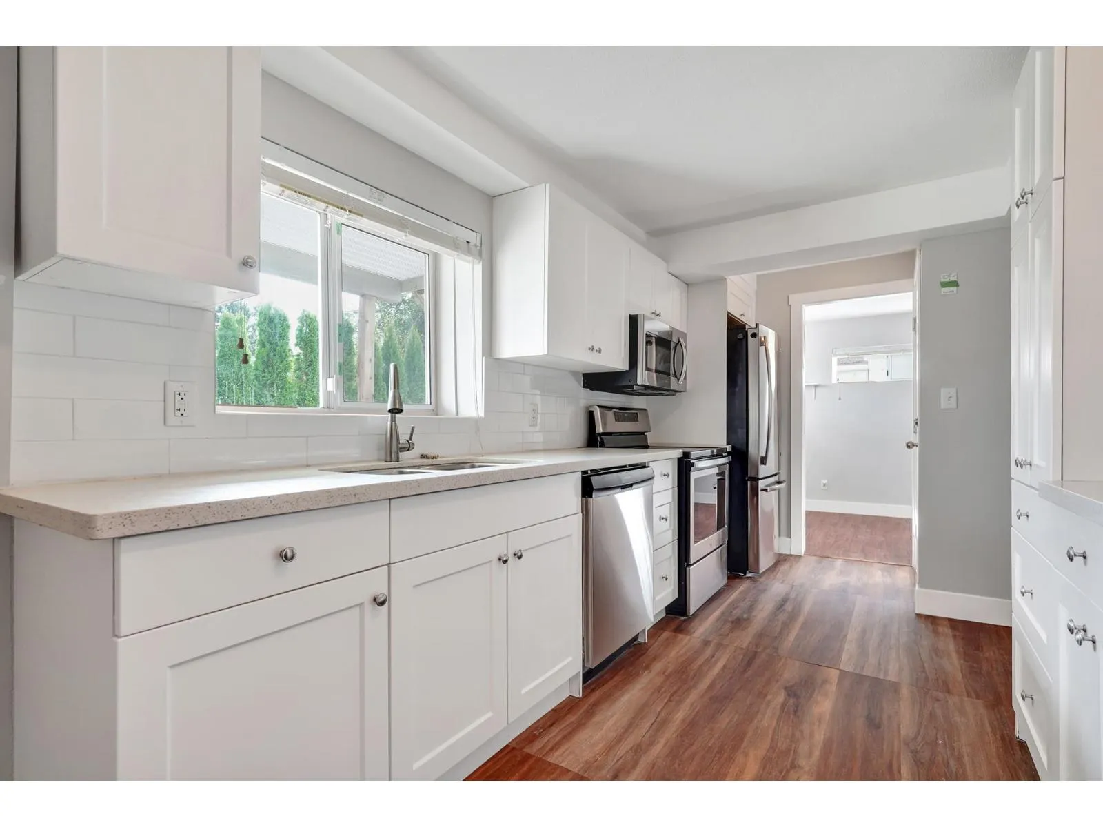 This spacious and updated RANCHER WITH FULLY FINISHED BASEMENT offers versatility and comfort for multi-generational living or investment potential. The main level features 3 bedrooms and 2 bathrooms, including renovated kitchen with quartz countertops, new cabinetry, and stainless steel appliances. New blinds and laminate flooring throughout, complemented by large windows and a gas fireplace in the living room. Mud room has newer washer/dryer, leading to balcony. The double garage and expansive driveway provide ample parking for multiple vehicles. Downstairs is a self-contained 2-bedroom suite with its own updated kitchen, full bathroom, separate entrance, and dedicated washer/dryer-perfect as a mortgage helper or in-law accommodation. (id:27476)