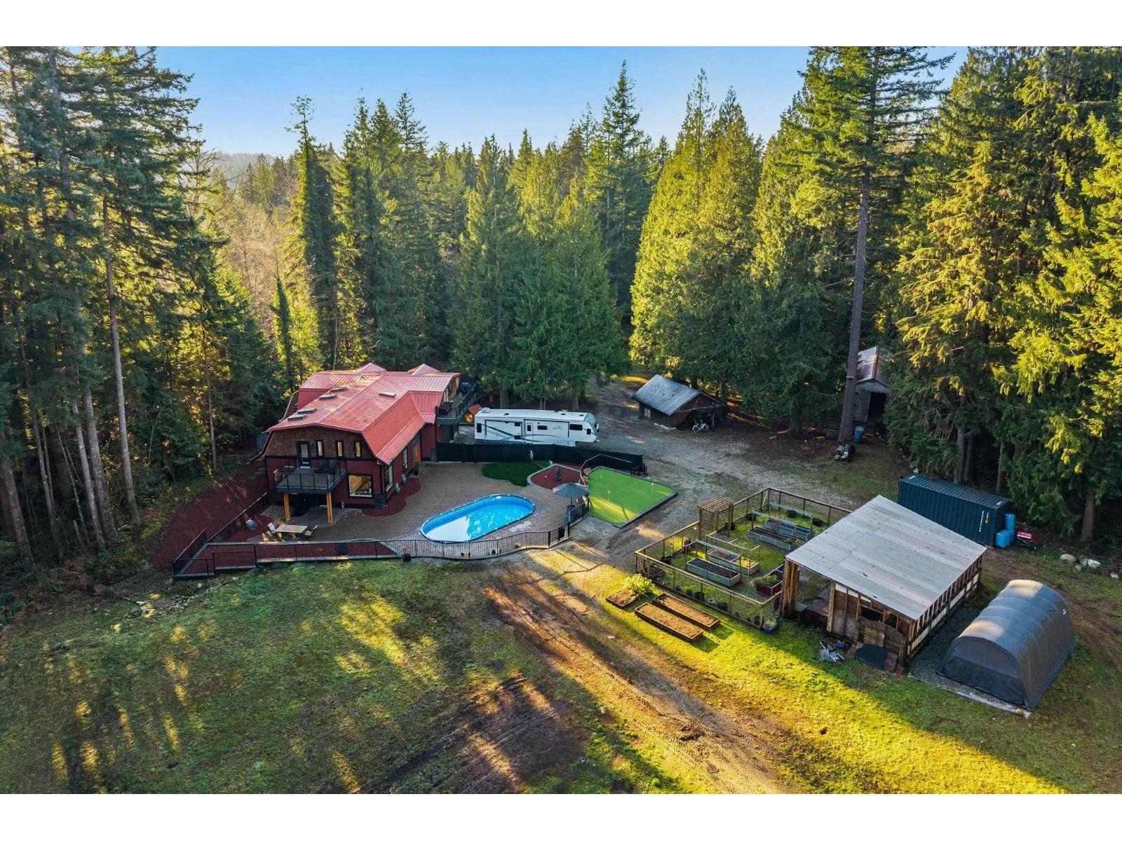 Multi generational living in Stave Falls! Discover true serenity and privacy on this rare 5-acre estate, offering exceptional flexibility for extended families or those seeking independent living while staying connected on one beautiful property. The homes feature thoughtfully updated living spaces with quality finishes throughout, providing modern comfort and functionality. Enjoy spacious floor plans, updated kitchens and bathrooms, and well-appointed living and family areas designed for everyday living. Set on a picturesque, treed acreage with large road frontage, this property feels like a private retreat. Outdoor amenities include a resort-style setting with a pool, putting green, patio spaces, expansive decks, and usable green space. There's also room for farming, horses, & your toys! (id:27476)