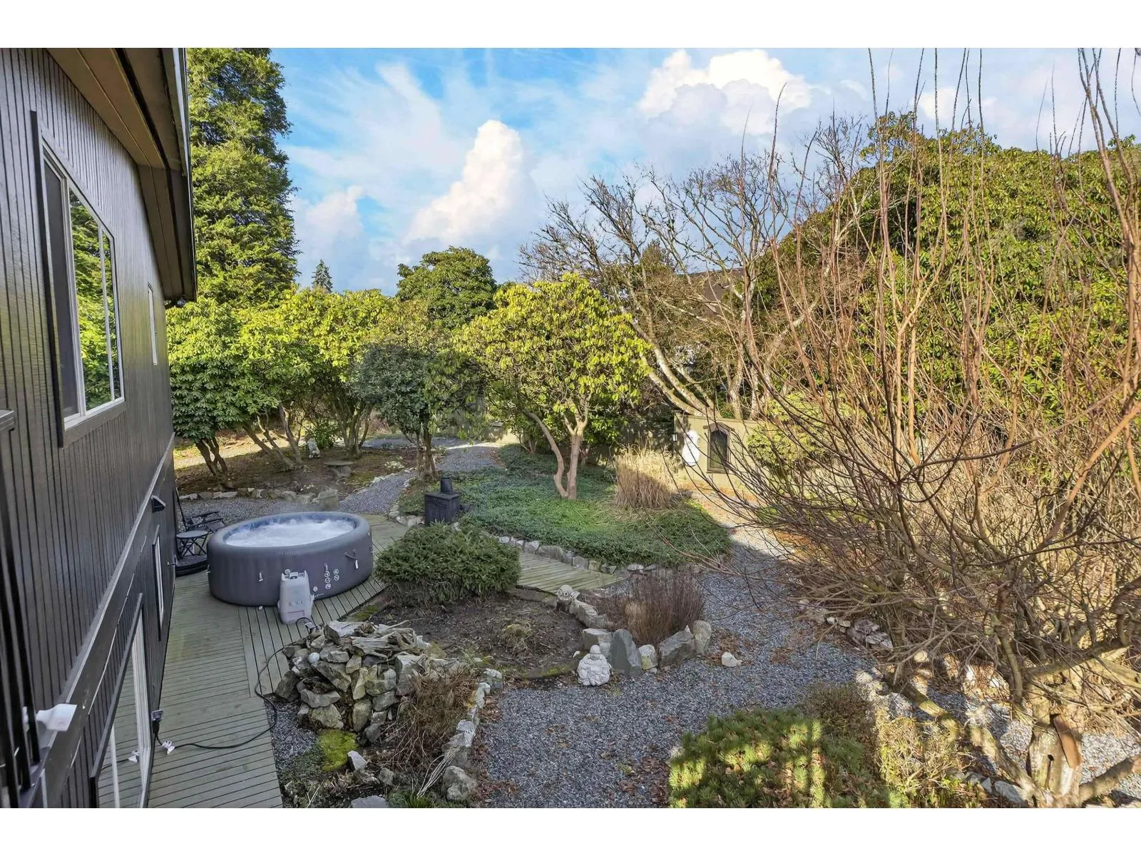 Welcome to this West Coast-inspired home tucked away in a private cul-de-sac just steps from sought-after HERITAGE PARK. Situated on over 1/4 acre, this rare offering provides exceptional space, privacy & breathtaking valley views from the sundeck & all principal rooms. The open layout features a stunning cedar vaulted ceiling w/ seamless indoor-outdoor flow. Extensively updated throughout, the bright living & dining areas showcase a striking concrete fireplace w/ gas insert & connect to the chef's kitchen w/ newer cabinetry, quartz countertops & stainless steel appliances. Updates include exterior & interior paint, fully renovated bathrooms, new doors, modern lighting, abundant parking & a double garage. Enjoy a private yard offering space, privacy & a peaceful outdoor setting (id:27476)