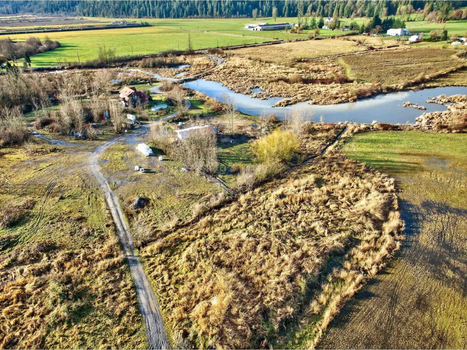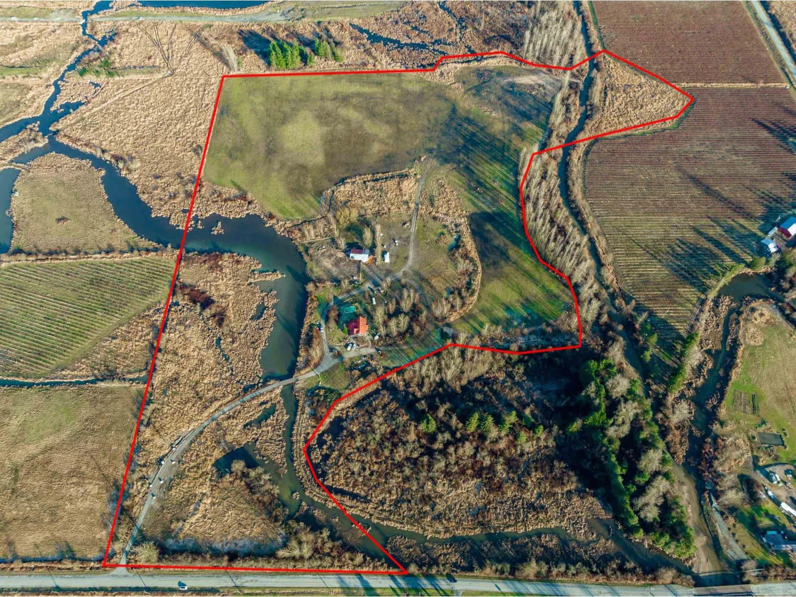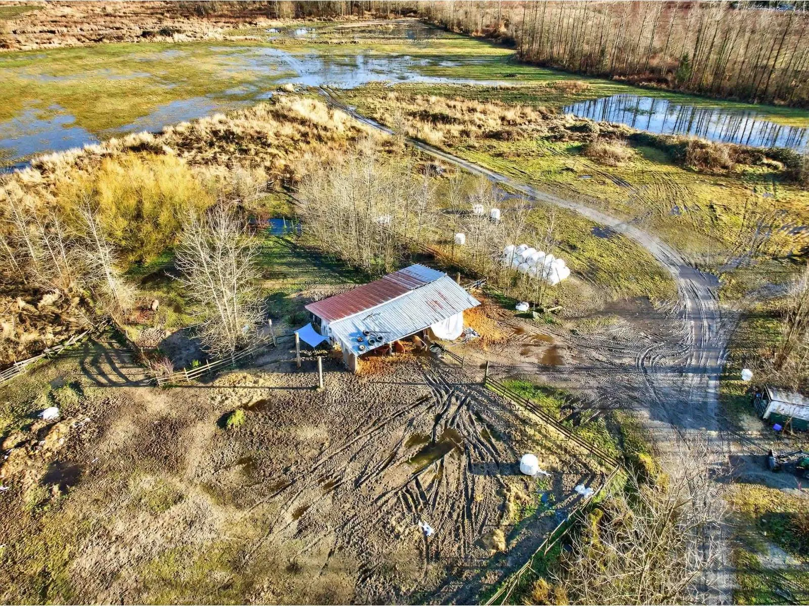 Exceptional 40-acre property featuring flat, usable land with CITY WATER, approximately 25 acres of productive hay fields, two horse paddocks, and a 45' x 30' outbuilding with hay storage and run-in stalls. The expansive acreage offers outstanding versatility and long-term value. Complementing the land is a custom-built 5-bedroom log home showcasing fir log construction, soaring 22-foot cathedral ceilings, and warm ashwood flooring throughout. Ceramic tile finishes the living room and kitchen, both with radiant in-floor heating, extending into the bathrooms for added comfort. The upper bathroom features marble tile and a classic cast iron clawfoot tub (id:27476)