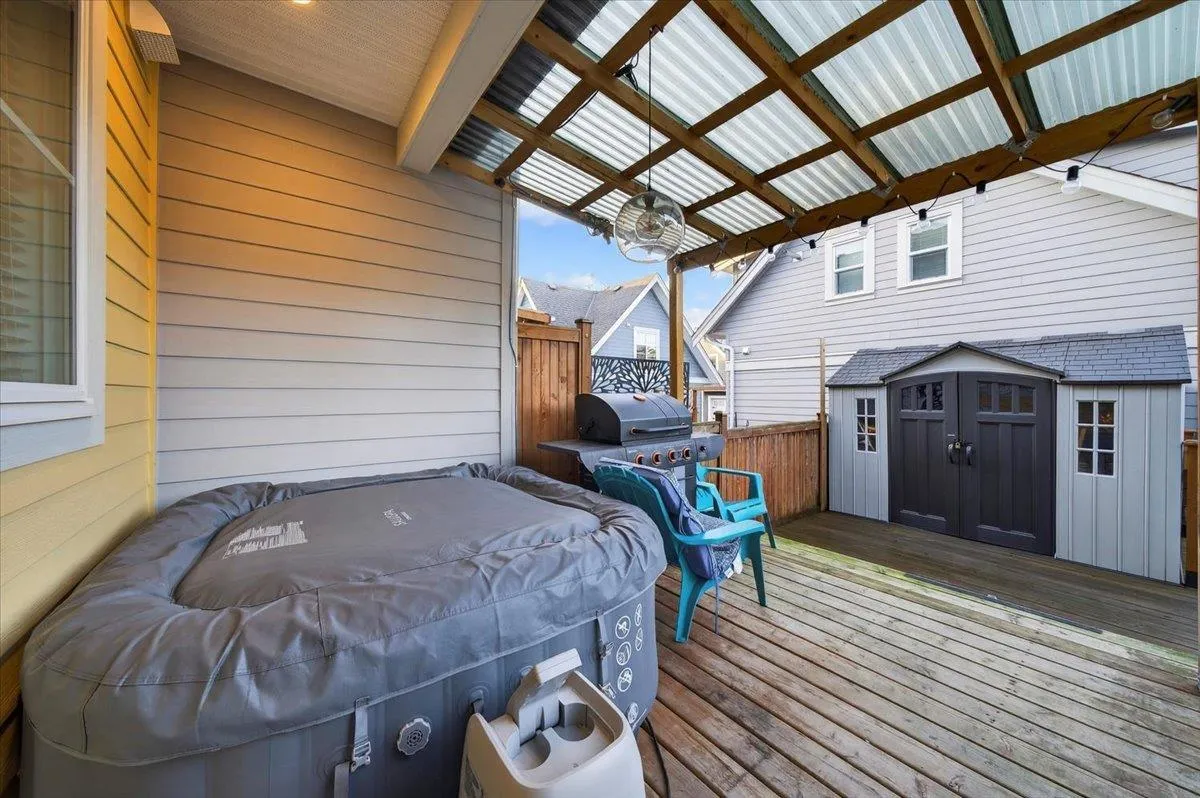 NO STRATA end unit Rowhome with a detached garage and Coach House/Mortgage Helper. This beautiful home has 3 bedrooms upstairs including master bedroom with walk in closet and ensuite. Main floor has large kitchen with stainless steel appliances, quartz countertops and under cabinet lighting. Opens up to your fully fenced backyard with beautifully professional installed artificial turf, patio and hot tub. Basement has large rec room and bathroom. Above your detached garage is a coach house with its own laundry. Plenty of parking, air conditioning, central vacuum, 8x10 storage unit, gas BBQ hook up (id:27476)