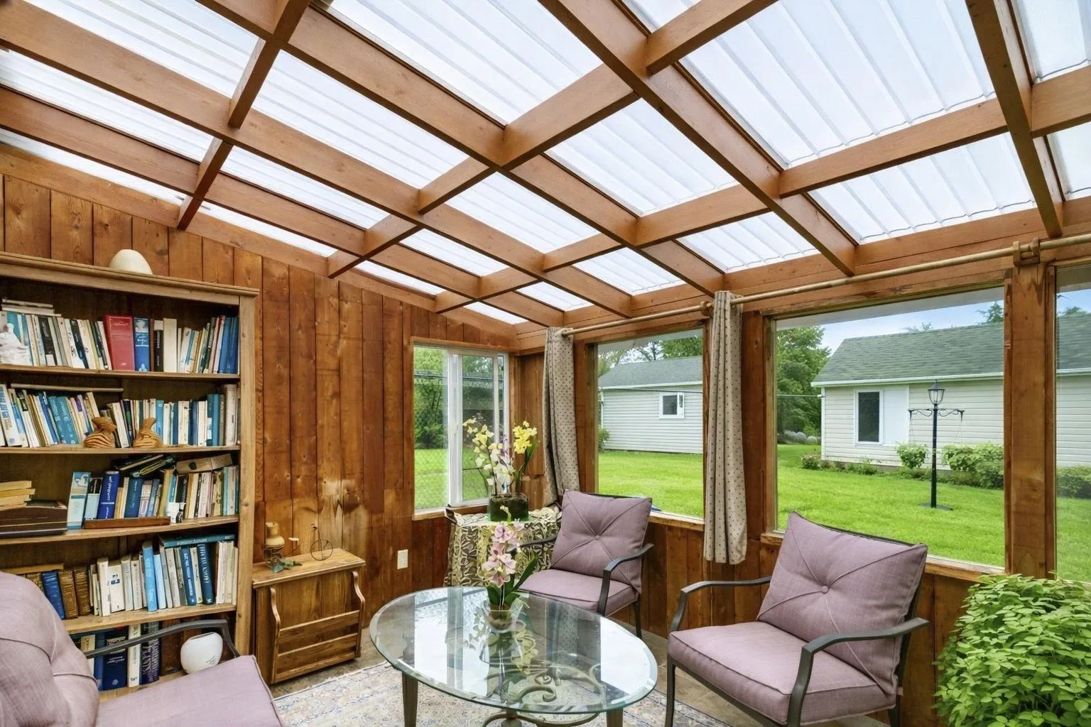 Bright, cozy & quiet 3-bedroom, 1-bath home set on a flat & private lot. The 3rd bedroom or flex/family room offers versatility to match your needs. This well-kept home features an inviting cast iron wood fireplace, 3 separate entrances, a solarium & plenty of storage throughout. Enjoy the large private yard which includes an XL storage shed/workshop, different varieties of fruit trees & space to entertain, relax or garden. Updates include a newer roof & windows. New furnace & central air conditioning (2017). Renovations in 2023 include custom kitchen shelves, appliances, deck canopies, bathroom renovation & freshly painted inside & out. Ideally located close to schools, parks & all amenities with quick highway access for an easy commute-combining comfort, convenience and outdoor enjoyment (id:27476)