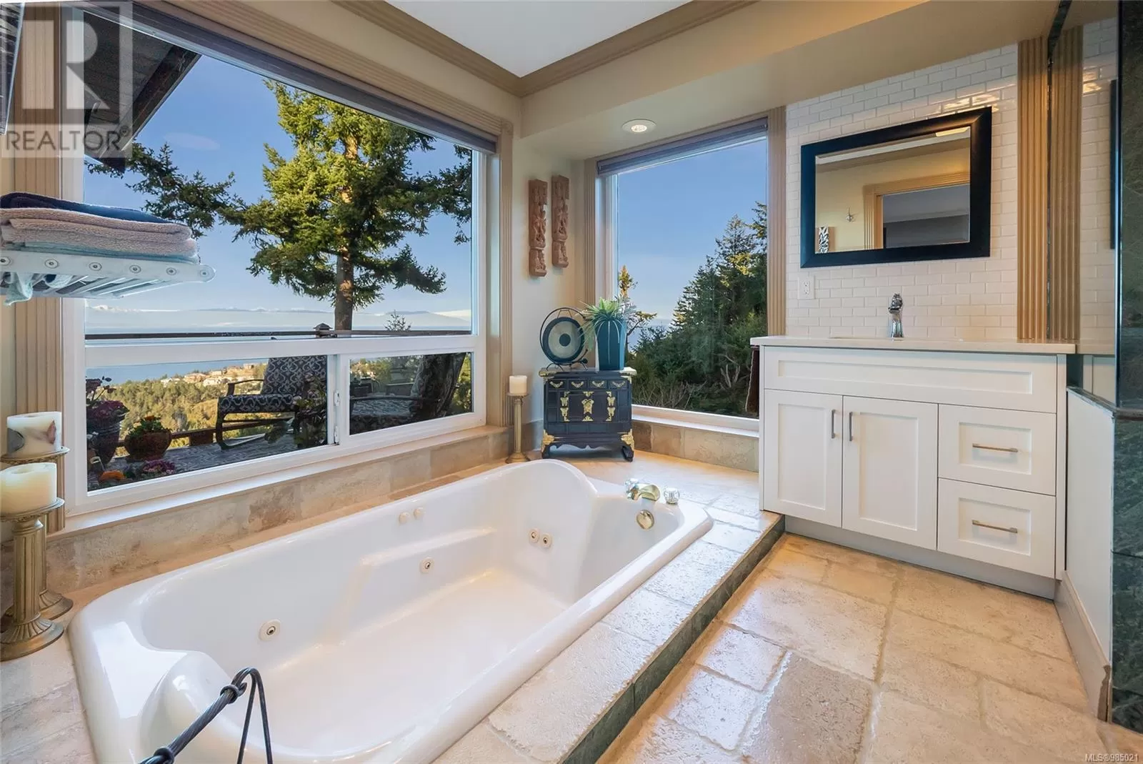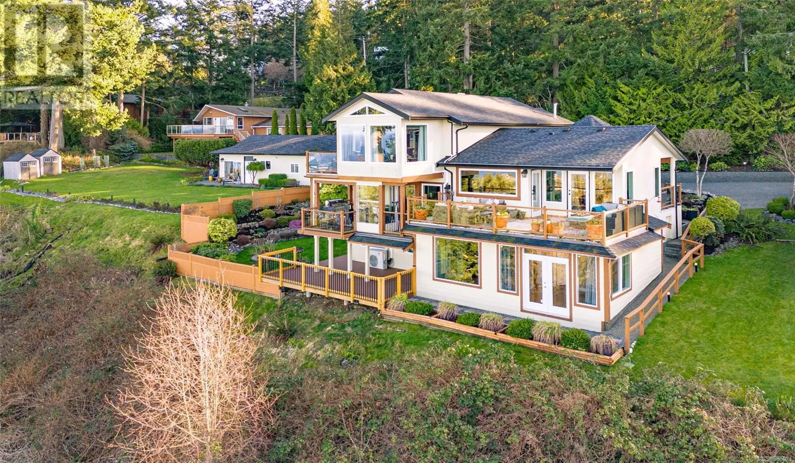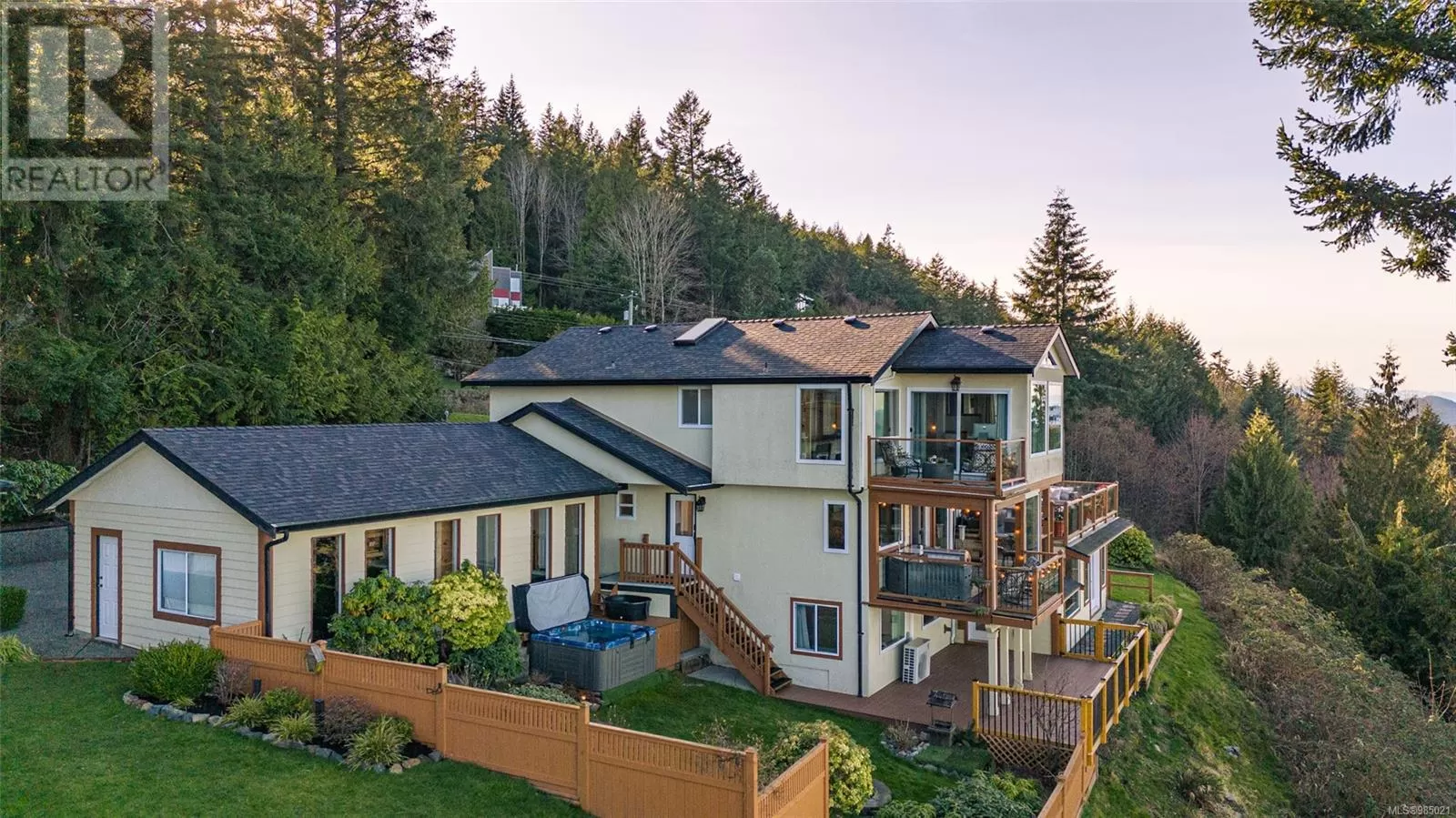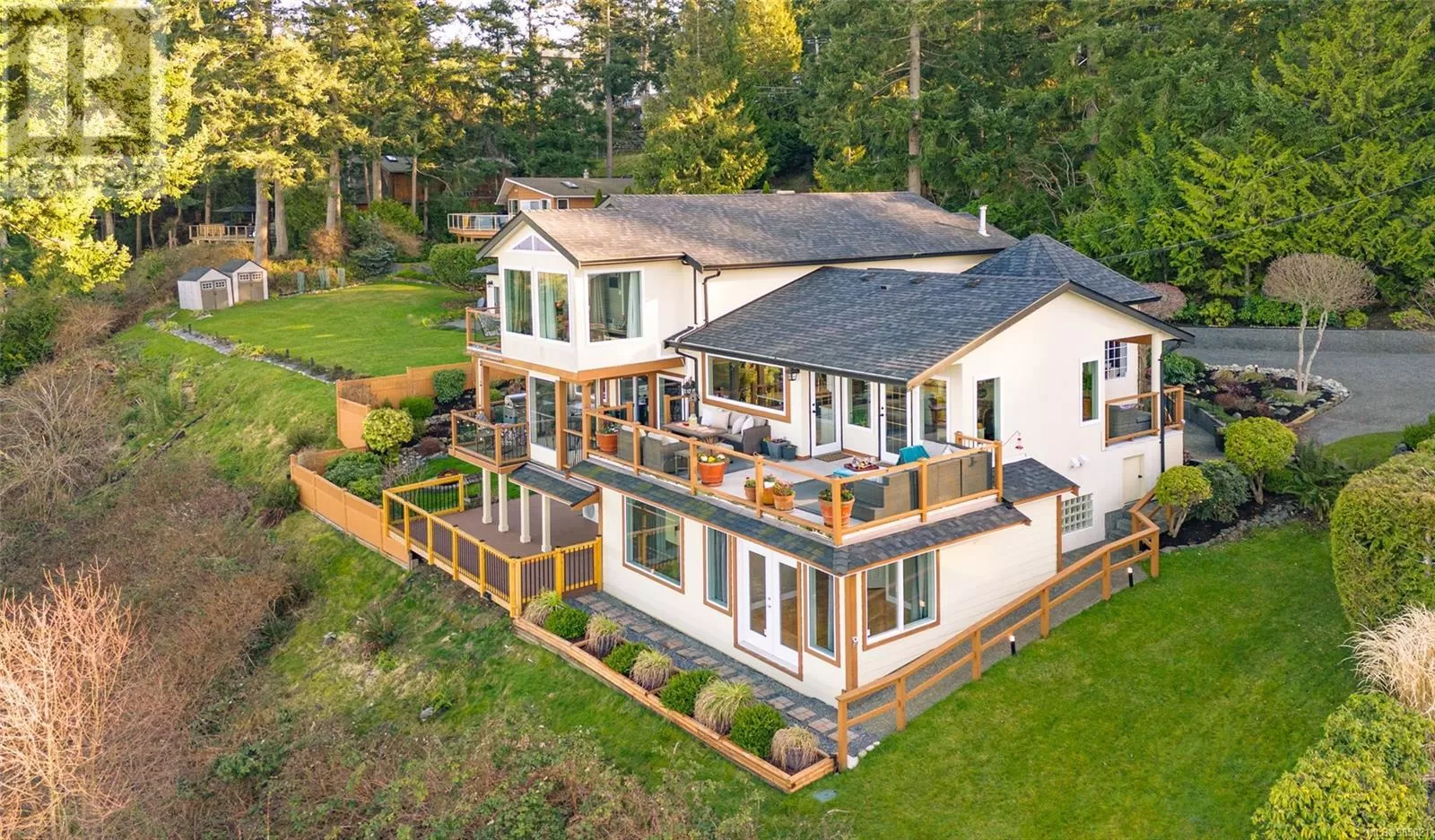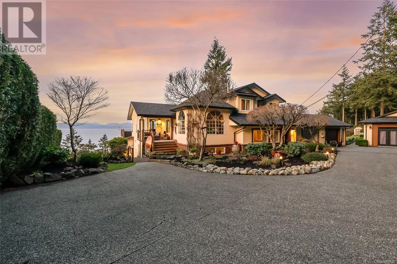 Welcome to one of the most breathtaking properties Vancouver Island has to offer at a fraction of the price a similar property would have in Metro Vancouver! This spectacular 1.18-acre estate features a stunning 4281 sq.ft. main home plus a 1235 sq.ft. guest house, all perched to capture panoramic, breath-taking, world-class ocean views. Step through the front door and be greeted by gleaming hardwood floors and a bright, open dining area framed by windows showcasing the endless ocean vistas. Off to the side, a cozy sitting room invites you to curl up by the fireplace and take in the serenity of your surroundings. Thoughtful design and quality craftsmanship are evident throughout this immaculate home. The chefâs kitchen is perfectly positioned to make the most of the view, with windows that span the entire front of the house, ensuring the ocean is always in sight. Upstairs, the primary bedroom suite offers a luxurious retreat with a spa-like Jacuzzi tub, ideal for unwinding as you watch the sun set in brilliant colour. The main residence is currently configured with 3 separate living areas: a spacious 3-bedroom upper residence (2693 sq.ft.), & 1-bedroom studio suite. A freshly renovated, self contained, 2-bedroom suite (1588 sq.ft.) on the lower level. The home can easily be reconfigured back into one expansive living space if desired. The separate 1235 sq.ft. guest house features a kitchen, 4-piece bathroom, 2 bedrooms, and two living areas. Plenty of parking for all your guests and toys. The property offers development potential or leave it intact and benefit from having a gorgeous estate property . All trees directly in front of the home are on the property, ensuring your incredible views will remain unobstructed for years to come. Donât miss this rare opportunity to own a truly remarkable estate where peace, privacy, and panoramic beauty converge. This is a home that must be experienced in person to truly appreciate its magic. (id:27476)