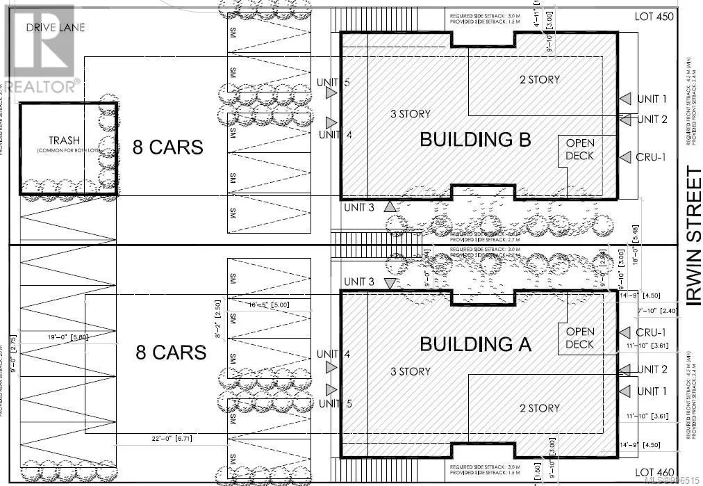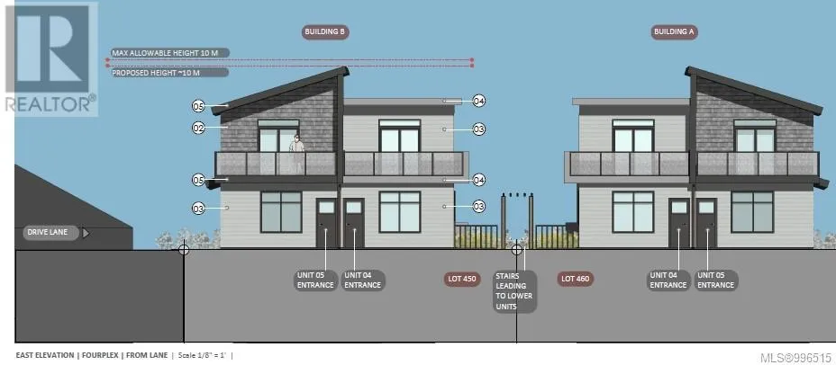 Approved Development Opportunity â South Nanaimo 10 Townhouse like condos + 2 Commercial Units. Located in vibrant South Nanaimo, 450 & 460 Irwin Street offer a rare and ready-to-go development opportunity. Centrally positioned within walking distance to the scenic seawall and convenient shopping, this property combines an excellent location with an already-approved vision for the future. The project has a Development Permit approved by the City of Nanaimo for two multi-family buildings, each thoughtfully designed with five residential units + one CRU. Building A and Building B are mirror images, and the layout includes Unit 1: 1,000 sf + balcony (2 bedrooms), Unit 2: 758 sf + balcony (1 bedroom), Unit 3: 485 sf (1 bedroom), Unit 4: 660 sf + balcony, Unit 5: 660 sq ft + balcony + commercial space. The innovative design ensures appropriate parking for residents and supports much-needed ''missing middle'' housing â a critical type of housing that bridges the gap between single-family homes and larger apartment complexes. This is a prime opportunity to step into a project that aligns with Nanaimoâs growing demand for diverse, attainable housing. (id:27476)