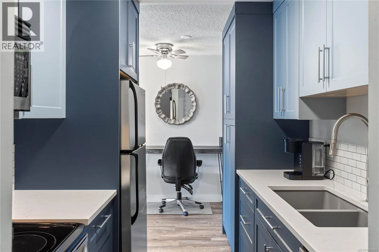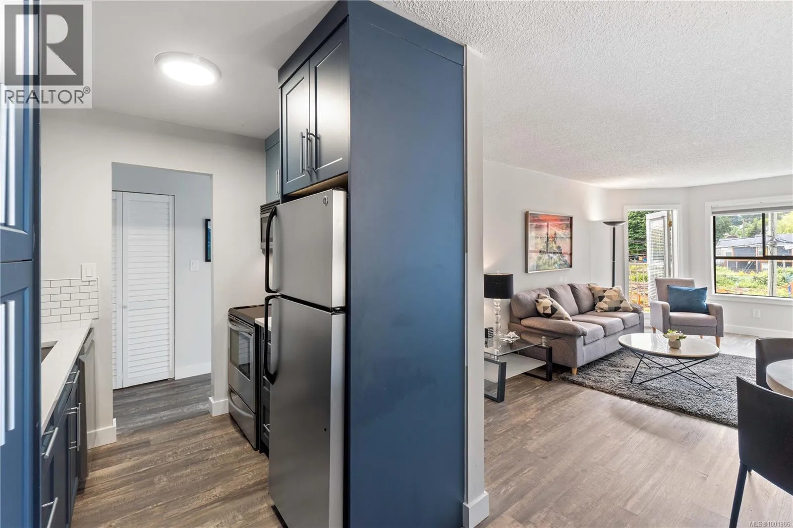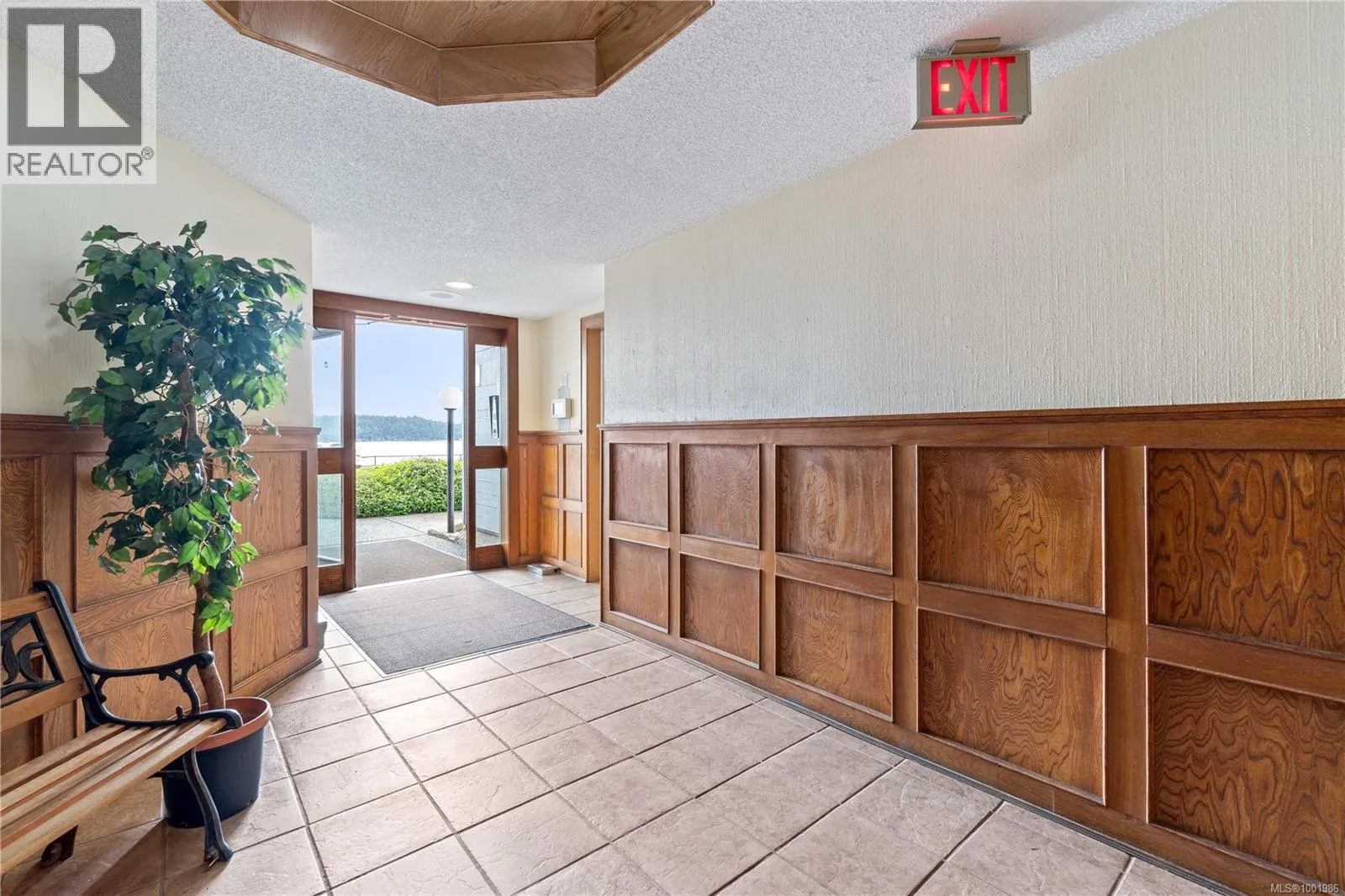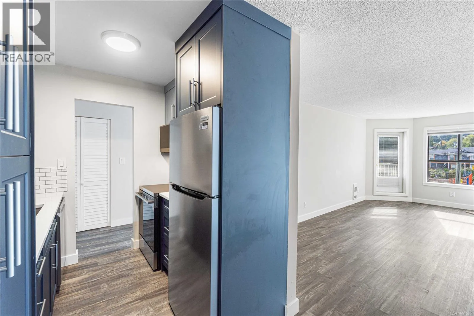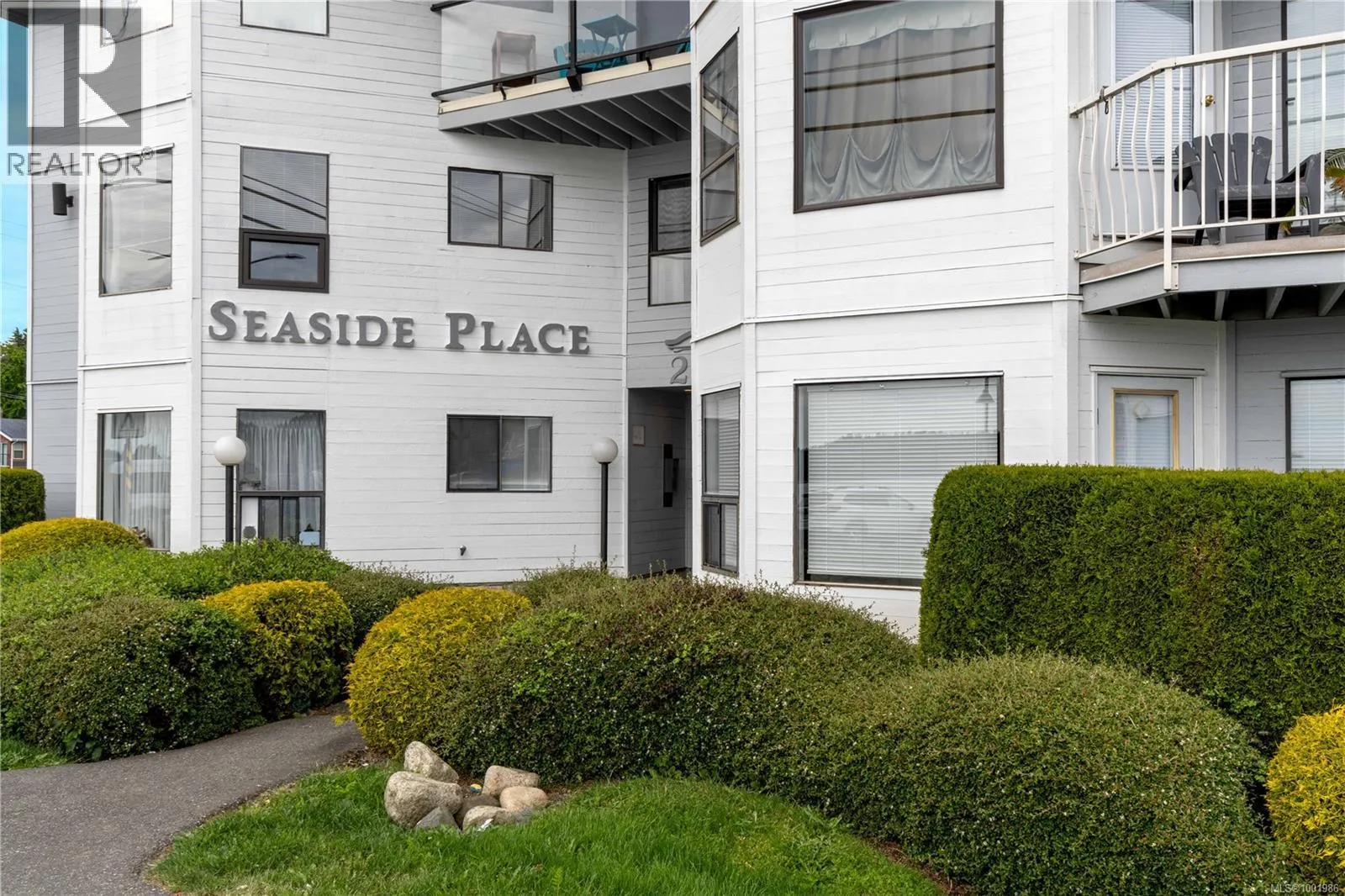 Affordable ocean view living! Located directly across the street from Departure Bay Beach, this thoughtfully renovated 1 bed, 1 bath condo at Seaside Place offers lovely views from your covered balcony. High-quality custom kitchen & bath renovations include soft-close cabinetry with designer finishes, quartz countertops (Cambria Weybourne), pull-out pantry storage, and updated luxury vinyl plank flooring, as well as in-suite laundry. Modern neutral colours, new closet doors & fixtures create a fresh, move-in ready feel. Functional layout with spacious bedroom, galley kitchen, 4-pc bath, and in-suite storage. Walk to parks, shops, transit & more. Well-managed strata with low fees. 1 indoor cat allowed; rentals permitted. (id:27476)