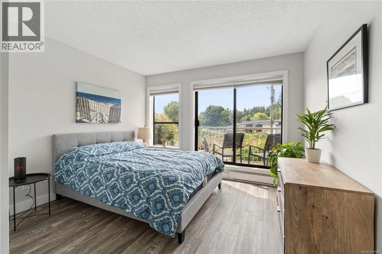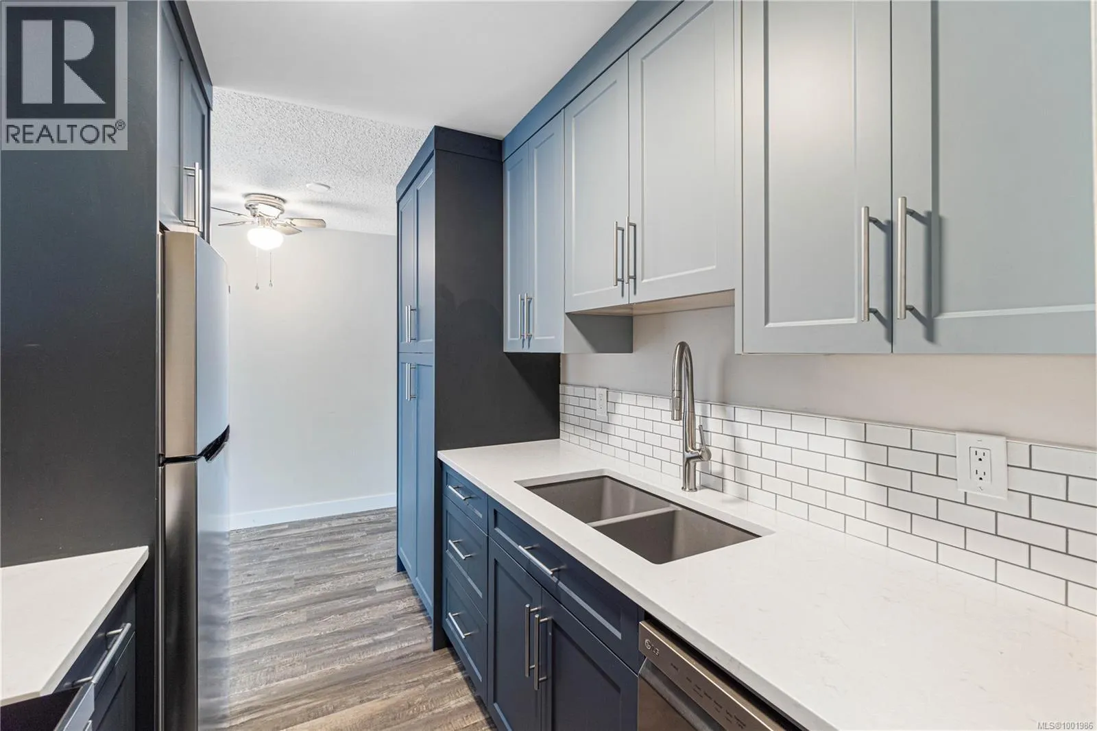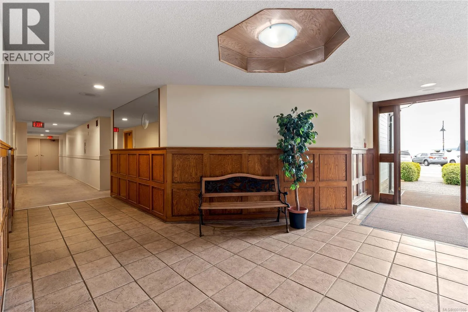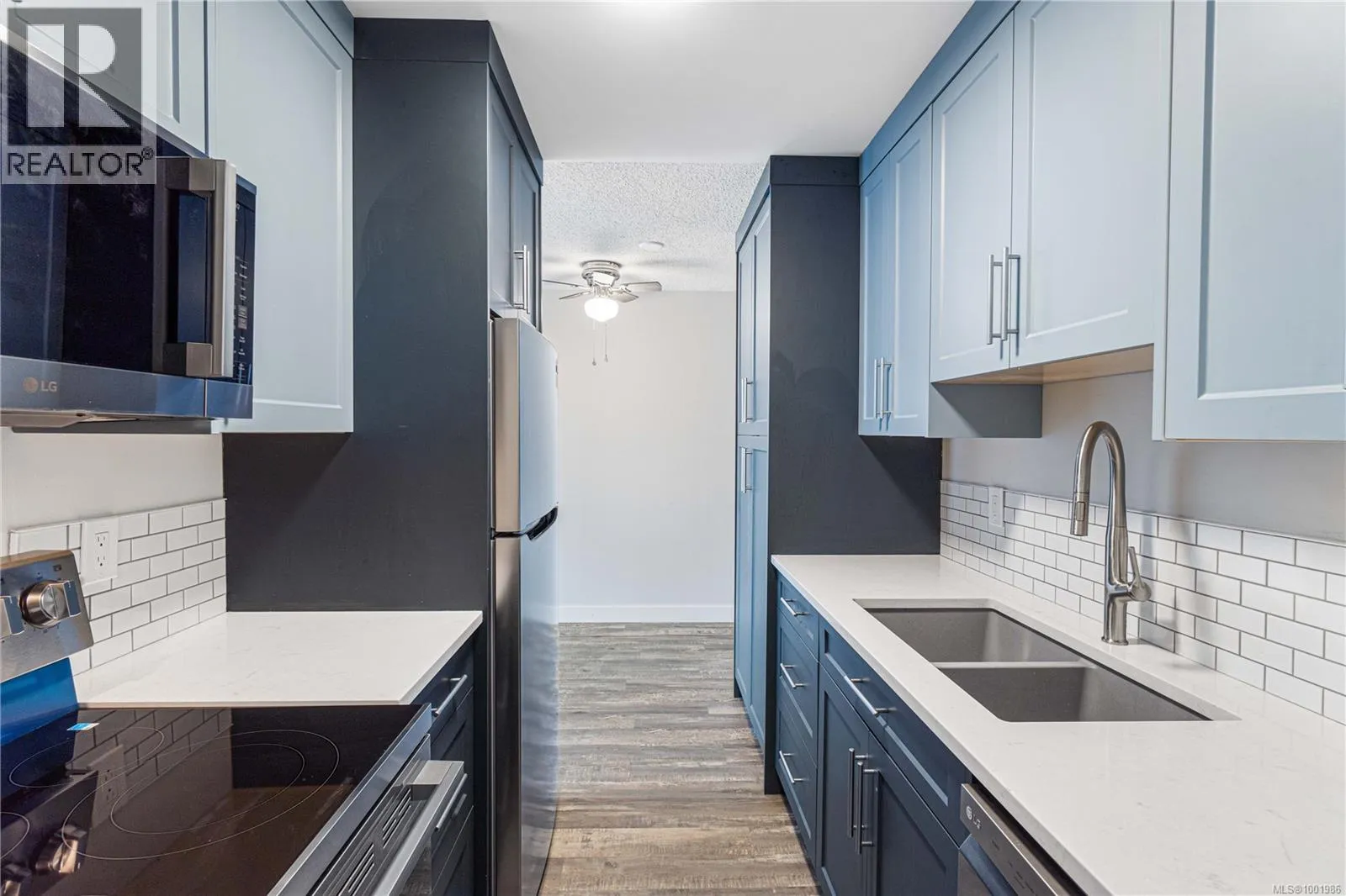Affordable ocean view living! Located directly across the street from Departure Bay Beach, this thoughtfully renovated 1 bed, 1 bath condo at Seaside Place offers lovely views from your covered balcony. High-quality custom kitchen & bath renovations include soft-close cabinetry with designer finishes, quartz countertops (Cambria Weybourne), pull-out pantry storage, and updated luxury vinyl plank flooring, as well as in-suite laundry. Modern neutral colours, new closet doors & fixtures create a fresh, move-in ready feel. Functional layout with spacious bedroom, galley kitchen, 4-pc bath, and in-suite storage. Walk to parks, shops, transit & more. Well-managed strata with low fees. 1 indoor cat allowed; rentals permitted. (id:27476)