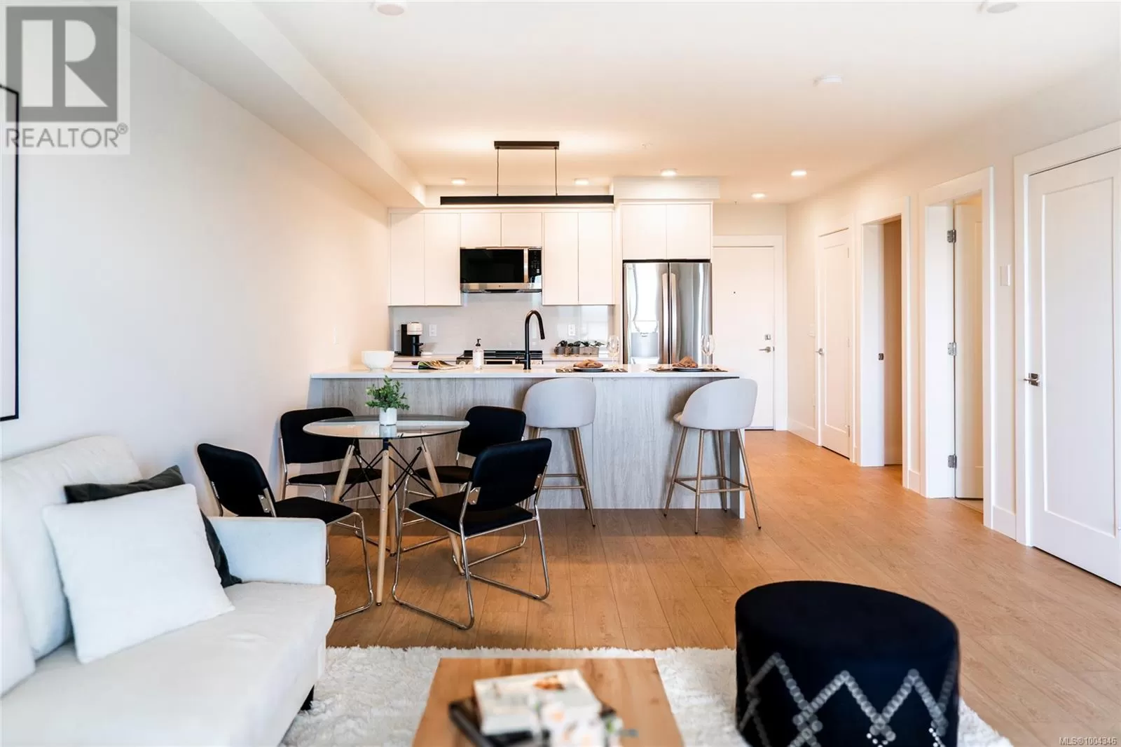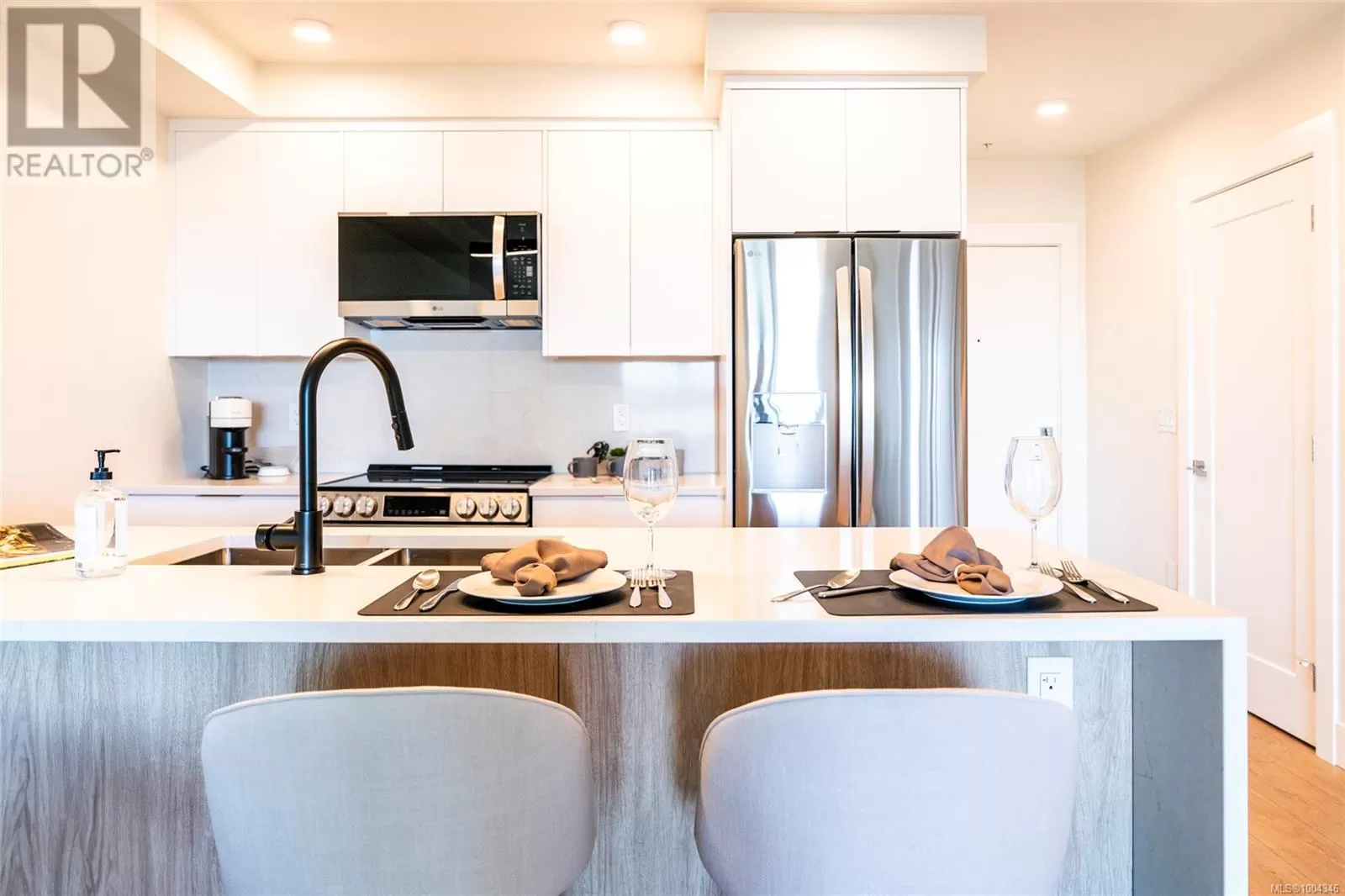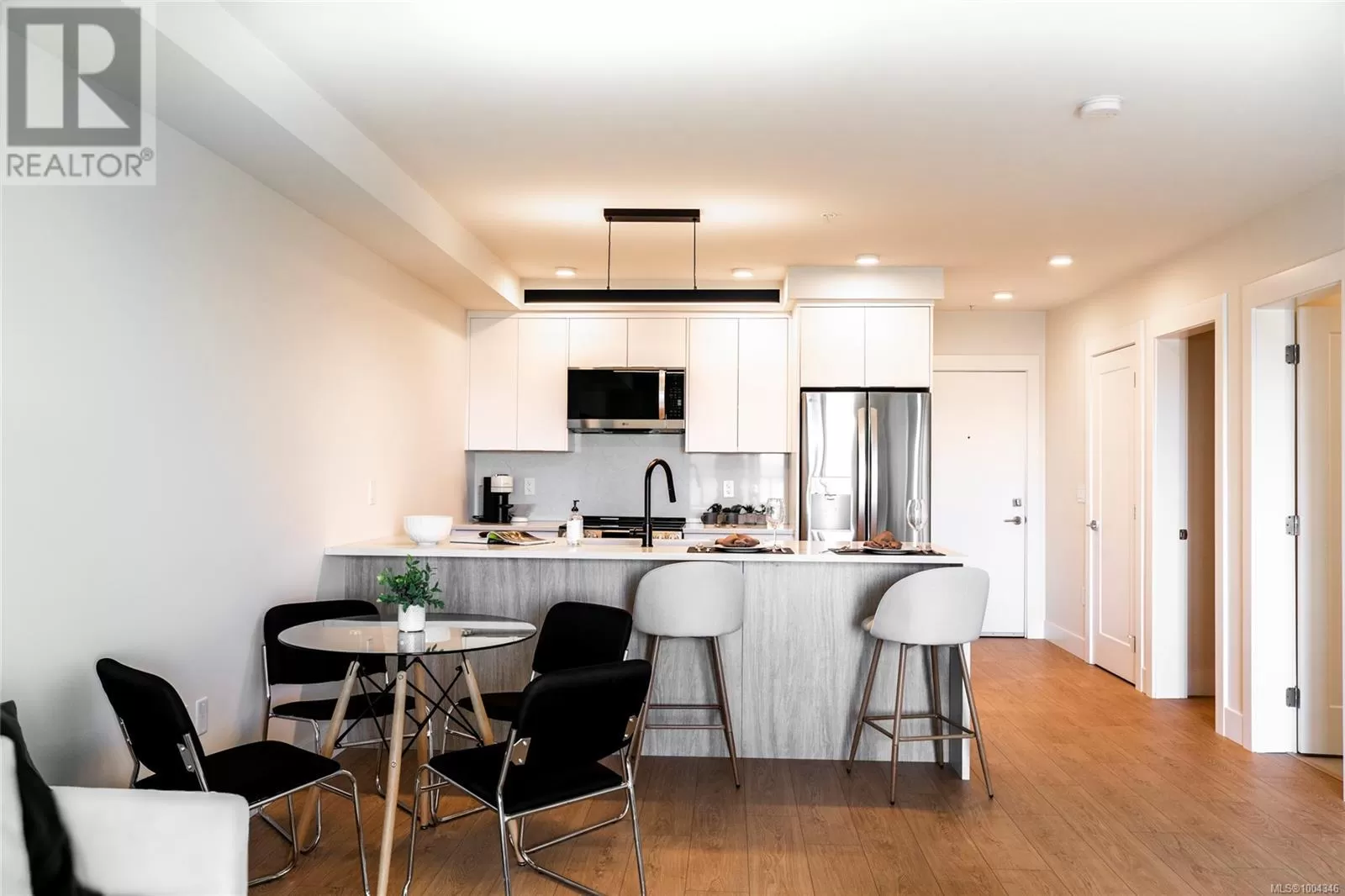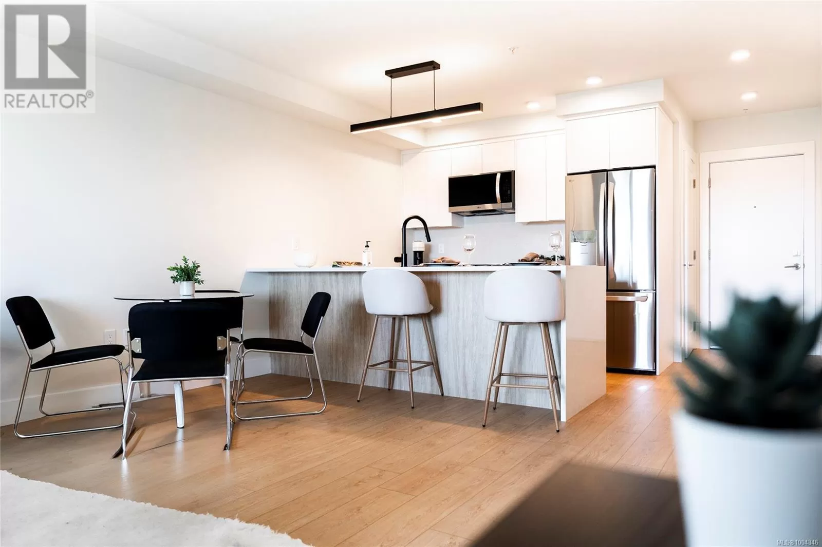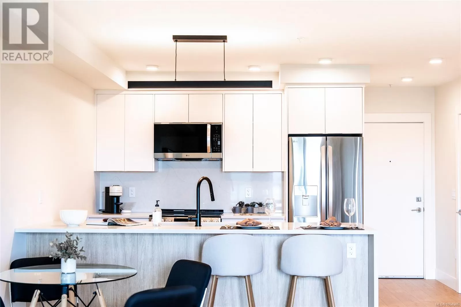 Welcome to Lumina in Harborview District, another principal property community in the heart of downtown Nanaimo, where city living meets coastal charm. Steps from the harbourfront, seawall, cafés, shops, parks, and Hullo Ferries, Lumina places you in the center of a growing, evolving district. Enjoy your mornings on the rooftop patio surrounded by lush greenspace and expansive ocean views. This beautifully designed 2-bedroom, 1-bath home features bright, open living with views of the harbour, city, and mountains â a striking blend of coastal beauty and urban energy. The kitchen stands out with waterfall-edge countertops, sleek cabinetry, and contemporary lighting, all contributing to a clean, modern aesthetic. Whether itâs a stroll along the waterfront, coffee with friends, or a rooftop sunset, this home connects you to the best of downtown â and the exciting future unfolding around it. (id:27476)