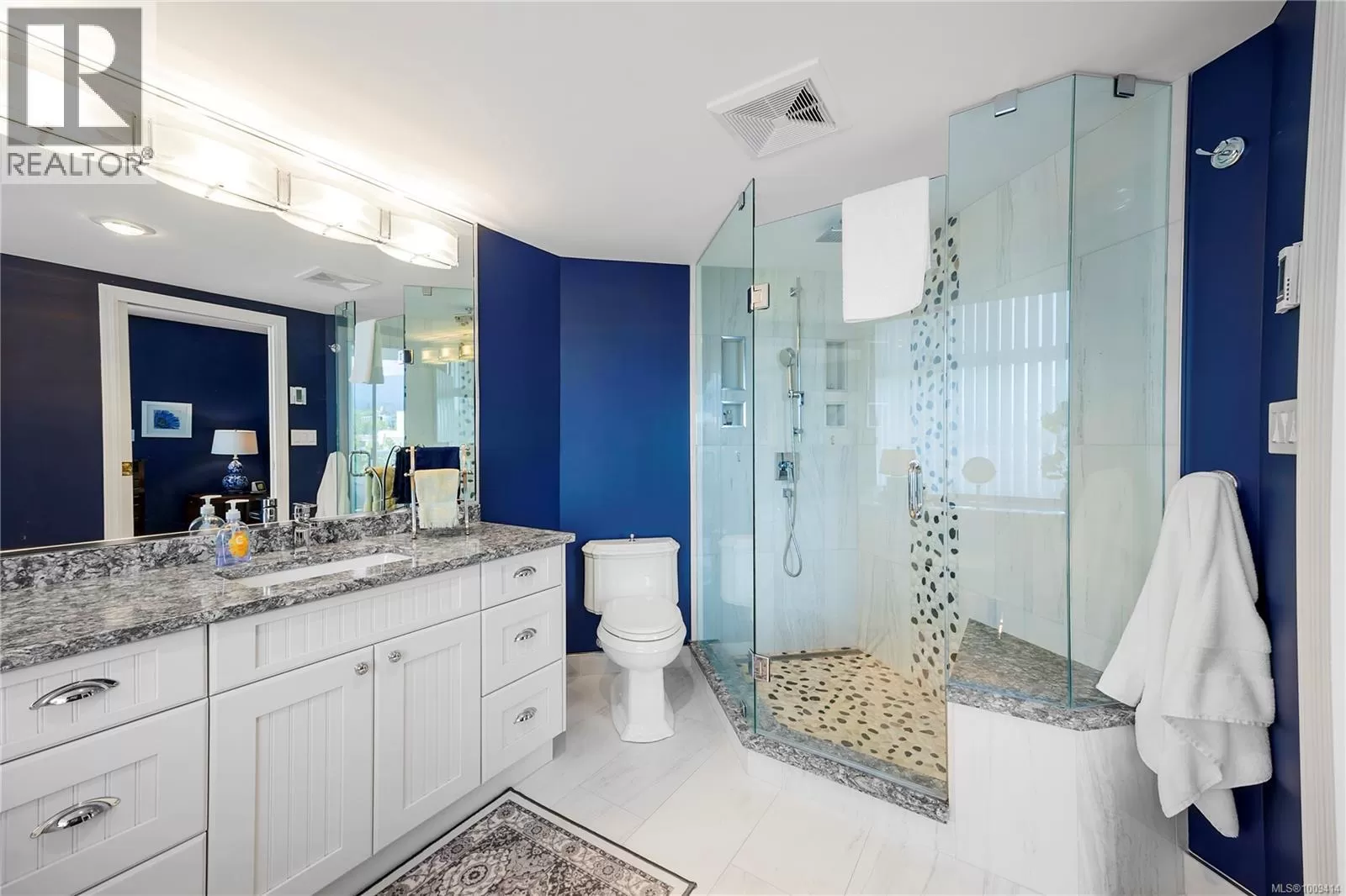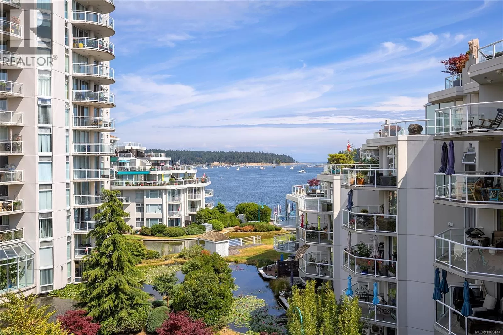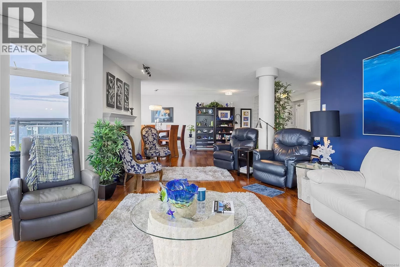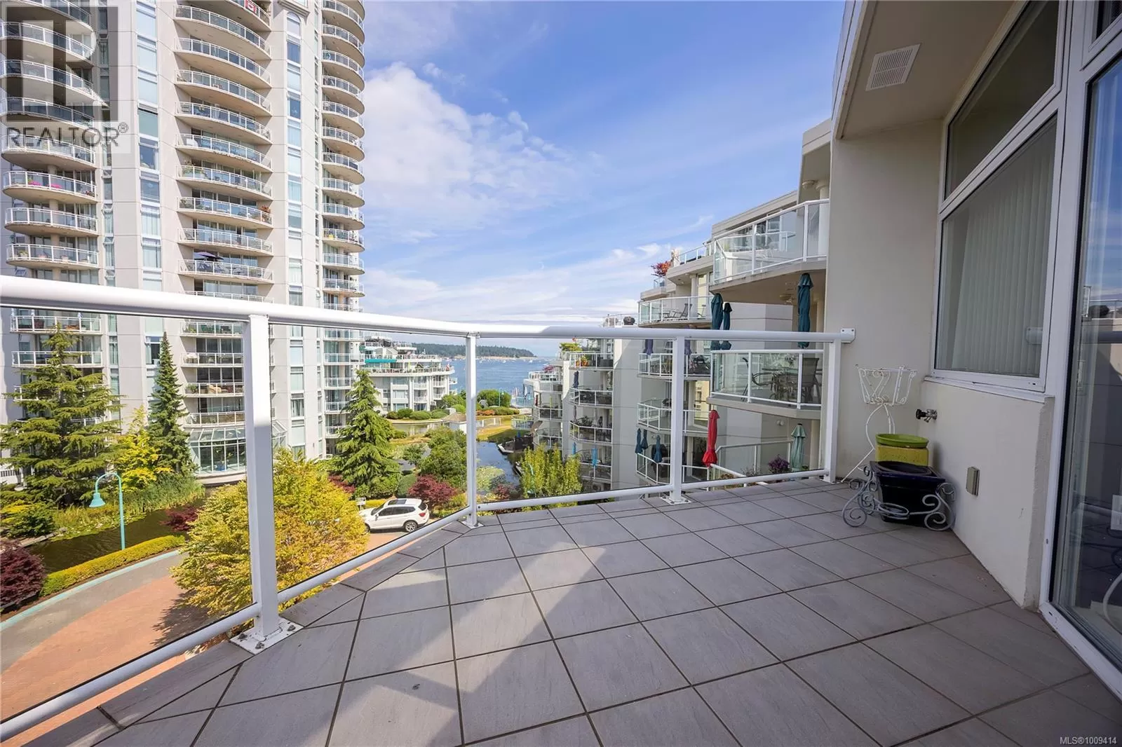 Experience luxury living in this stunning 2 bed, 2 bath 5th floor penthouse condo in the prestigious Gabriola building at Cameron Island, nestled in the heart of downtown Nanaimo. Spanning over 1,700 sq ft of refined interior space, this home offers views of the ocean, city, & mountains through floor-to-ceiling windows & from the expansive 1,000 sq ft private patio. Inside, enjoy rich hardwood & tile flooring, granite countertops, & sleek, newer cabinetry that blends functionality with elegance. The open-concept layout seamlessly connects the living, dining, & kitchen areas, creating a bright & inviting atmosphere. The spacious primary suite features a luxurious ensuite & a walk in closet dressing space. Also features in floor heating in kitchen and ensuite bathroom, Island smart irrigation system on patio, granite counters in kitchen, bathrooms and dry bar. The home is cooled and heated with a newer HVAC system and a feature gas fireplace ''gas included with strata fee'' as well as electric baseboard heaters in each room. With 2 underground parking spaces & large storage room, as well as separate bike and kayak storage. With unbeatable walkability to the waterfront, shopping, restaurants & entertainment this exclusive penthouse offers the best of west coast living. 1 Dog or Cat friendly (Max 25 lbs). All data is approximate and to be verified. (id:27476)