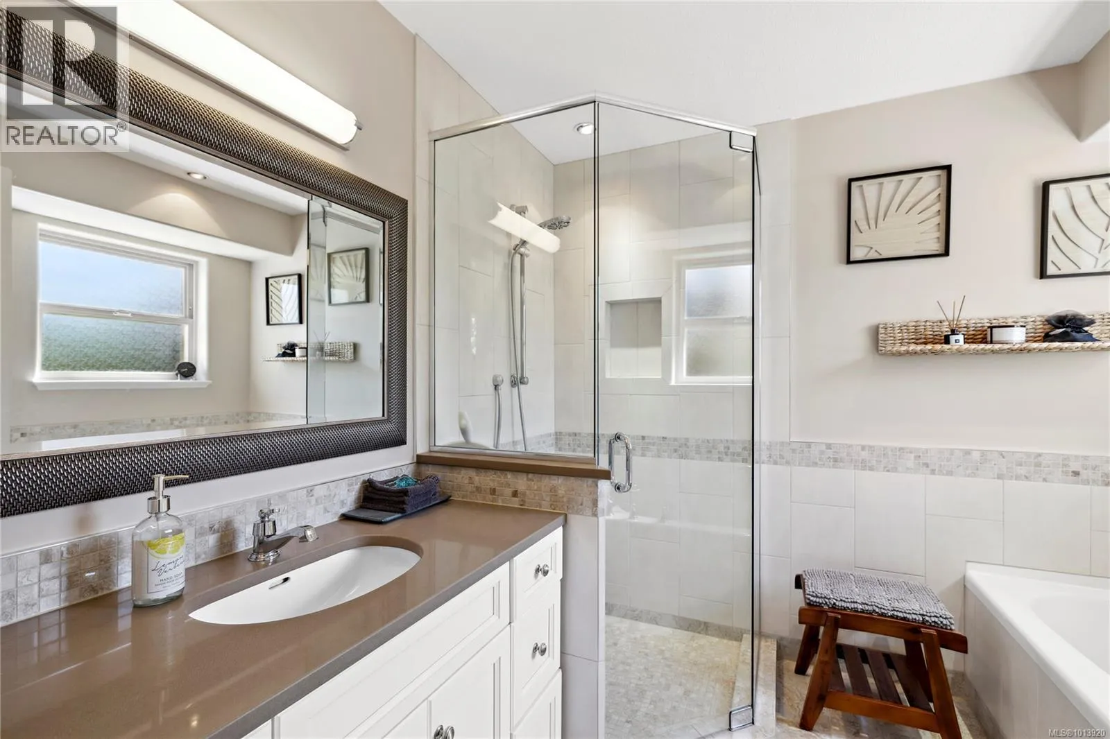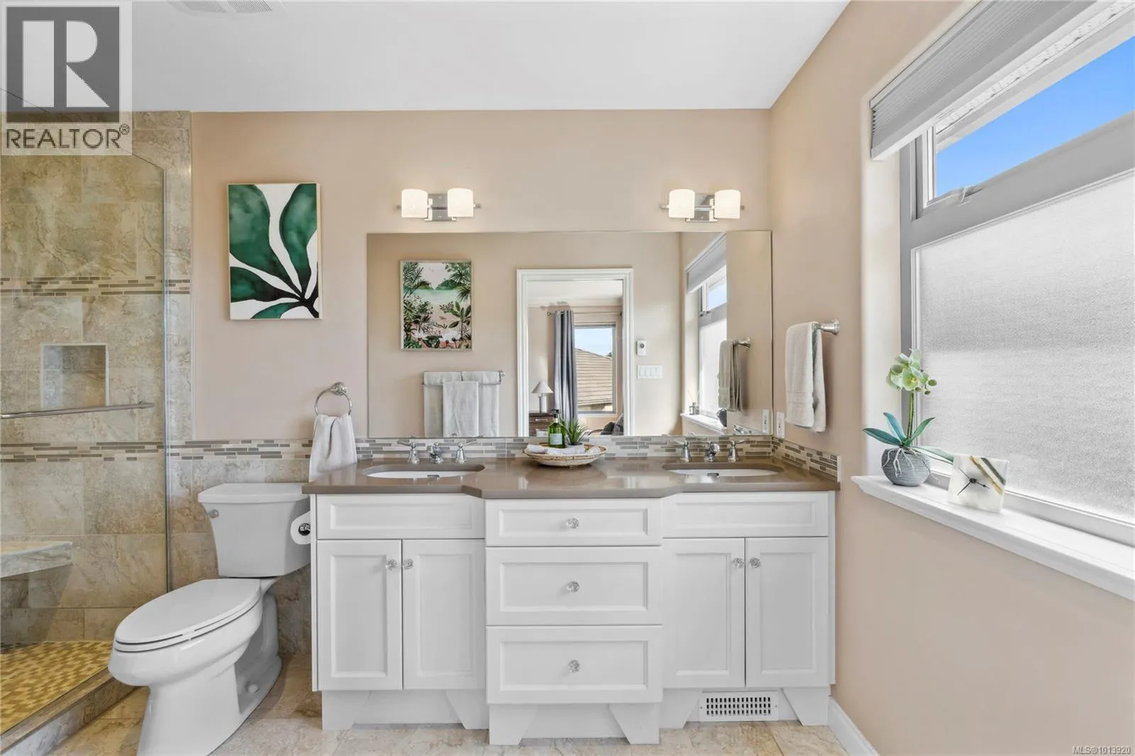 Immaculate 3-bed+den, 3-bath North Nanaimo home backing onto the tranquil Westhaven Park. Thoughtfully renovated with flexibility in mind, the layout features two primary bedroomsâeach with its own ensuiteâone located on the main level and one upstairs, making it ideal for families, guests, or those seeking main-level living. With 9-foot ceilings and hardwood floors throughout, the home is full of character and charm, while also offering modern updates and a heat pump to ensure year-round comfort. Mature landscaping creates a private retreat, and the sunroom offers a relaxing space to unwind or entertain while overlooking peaceful green space. Additional features include a den for added workspace or guest use, and ample RV or boat parking for convenience. Located near Bayshore Viewpoint with waterfront access, this property highlights the best of coastal living in a quiet and desirable neighbourhood. All data and measurements are approximate and should be verified if important. (id:27476)