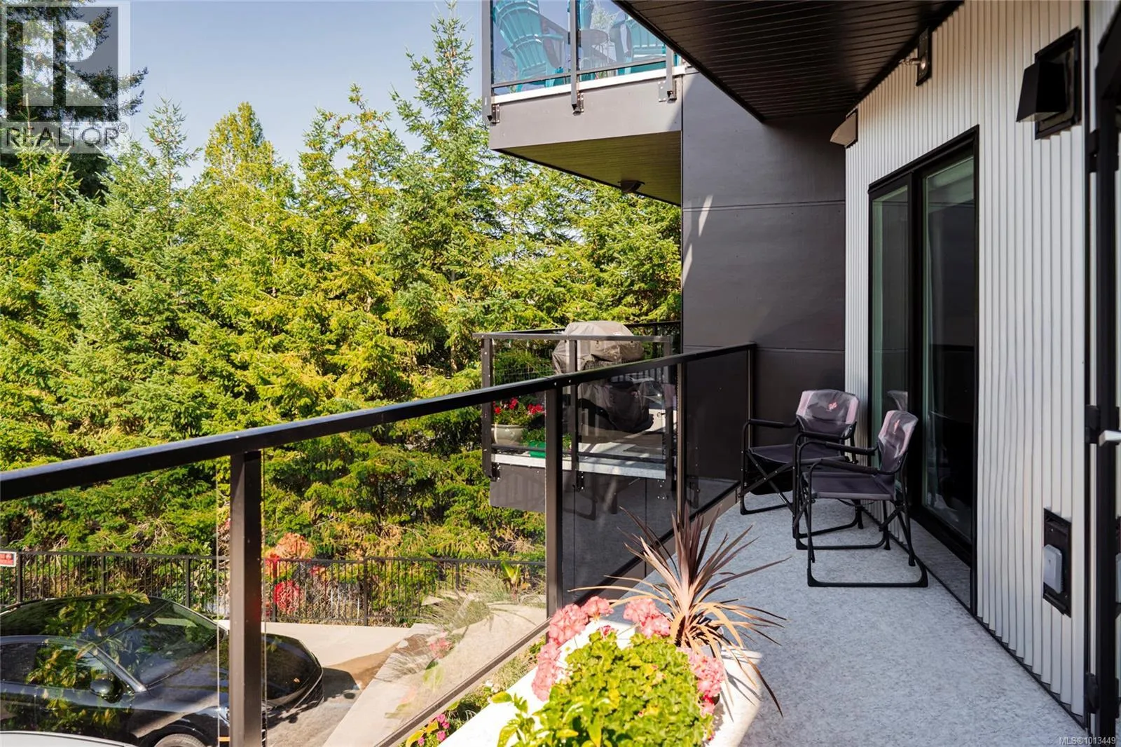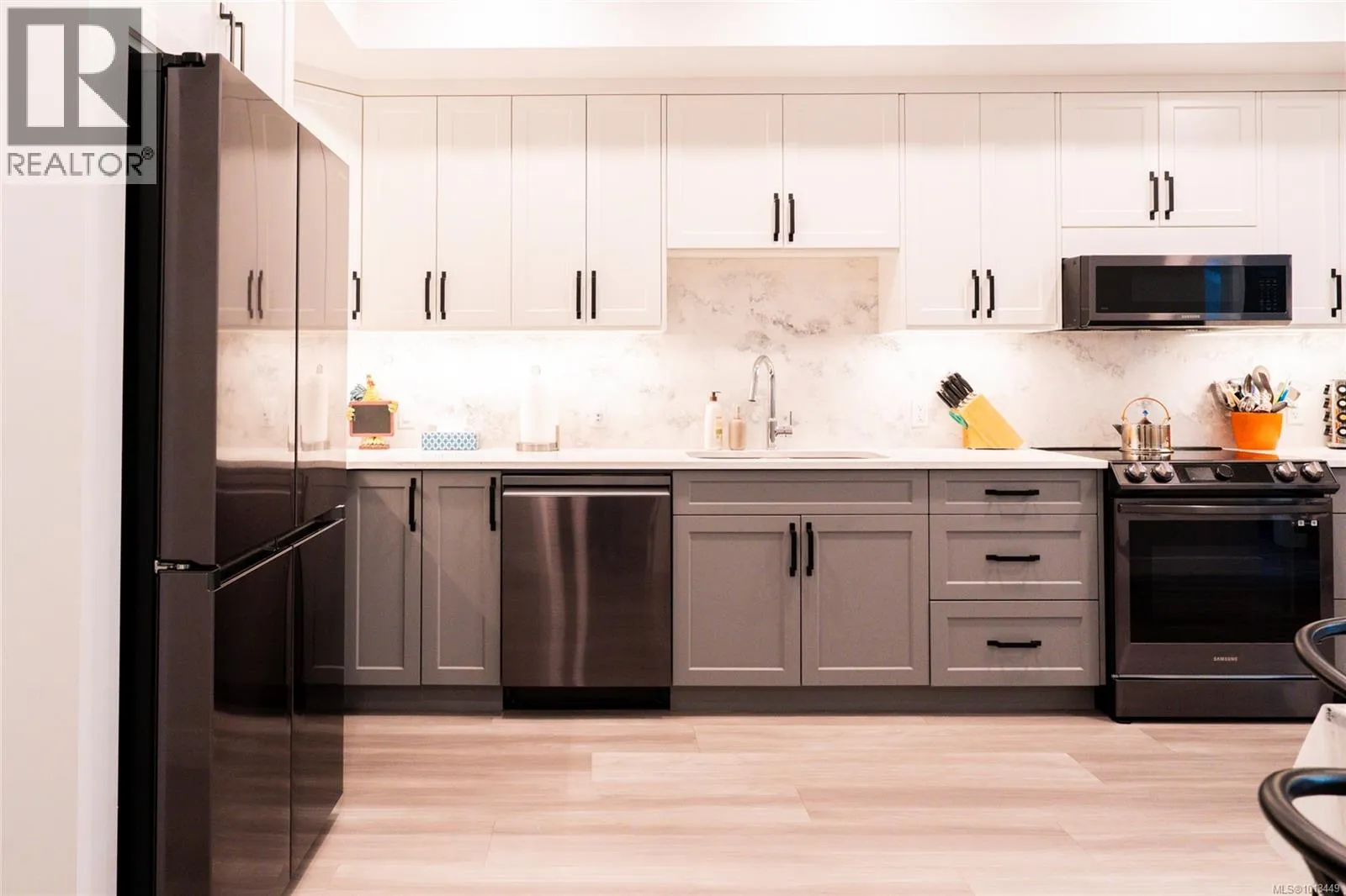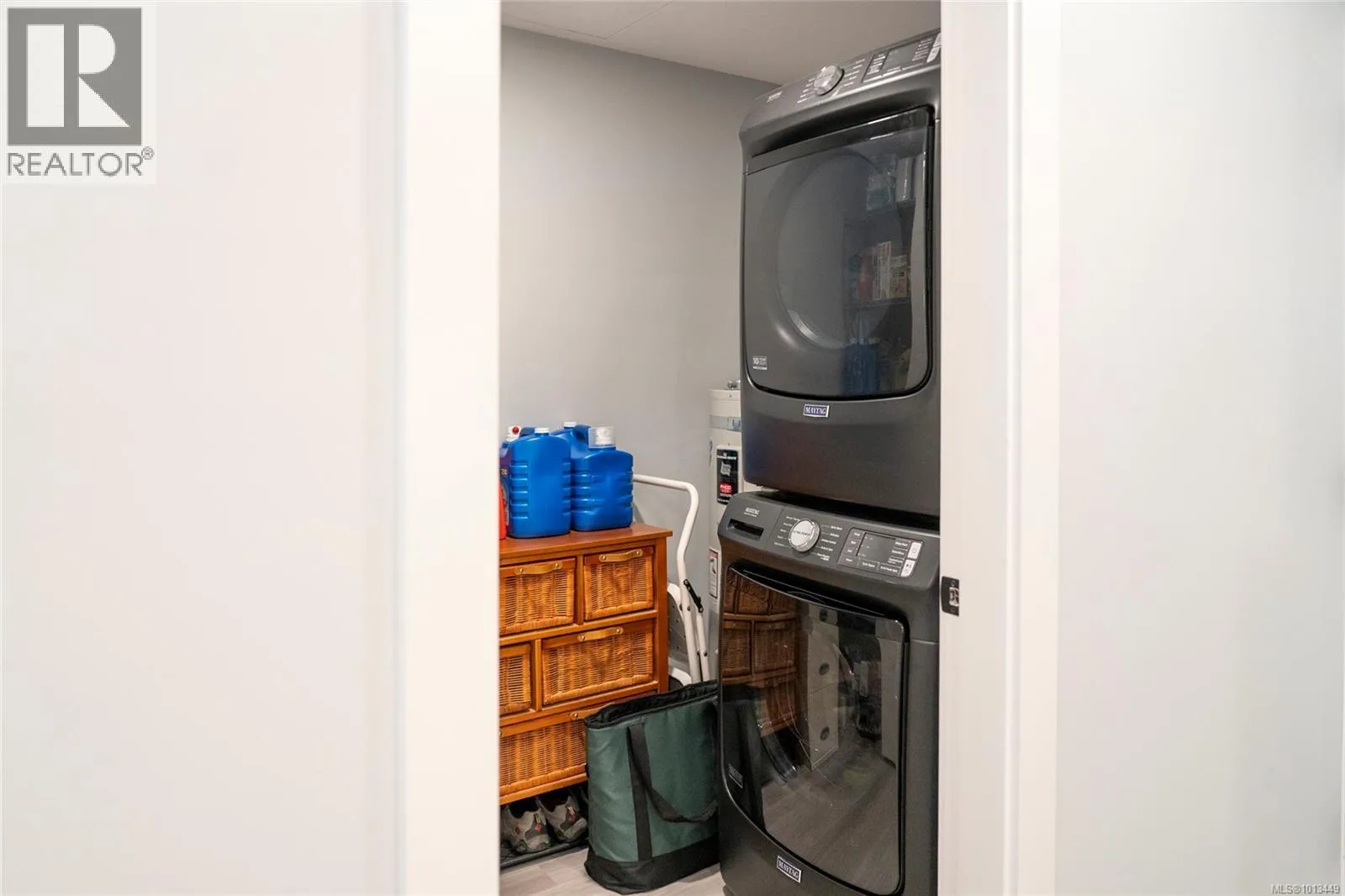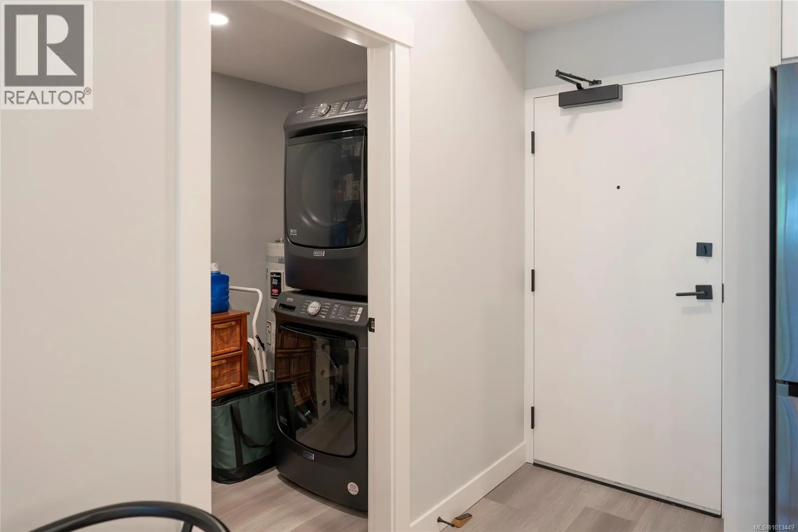 Steps from Nanaimo's Long Lake and North End amenities, this condo pairs modern design with a great location. Expansive windows brighten the open layout, while the kitchen is equipped with top-of-the-line Samsung stainless steel appliances, elegant quartz countertops, and a matching quartz backsplash for a clean, contemporary look. The open living space extends onto the deck through European-style exterior glass doors, perfect for extending your living space outdoors. This condo also features a one-of-a-kind in-suite storage space built in behind the bedroom closet offering practical convenience rarely found in condo living. The bathroom has been upgraded with a tiled walk-in shower, while stylish hardware and individual heat pumps add high-end touches and year-round comfort. One underground parking stall is included and a storage locker. With its unique features and prime setting, this home is an exceptional opportunity for those seeking modern comfort in a desirable Nanaimo location. (id:27476)