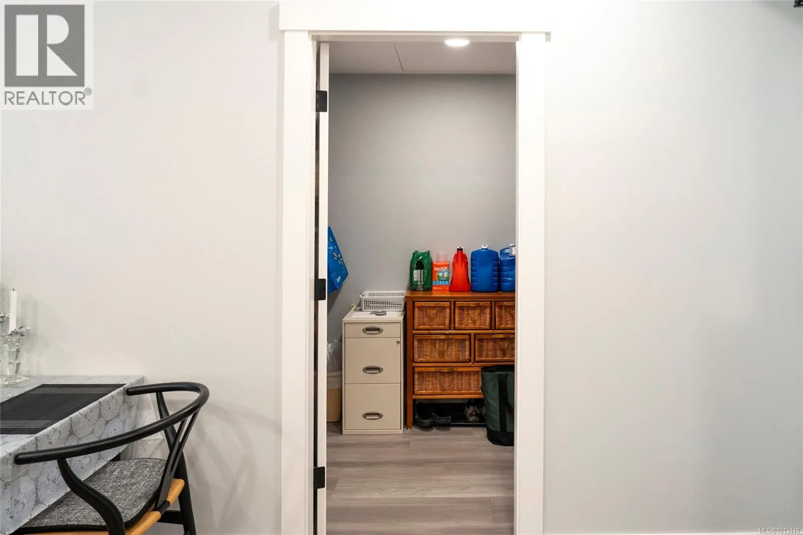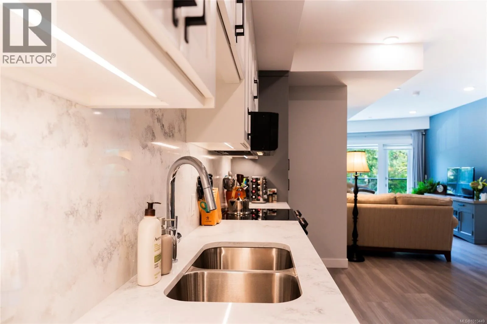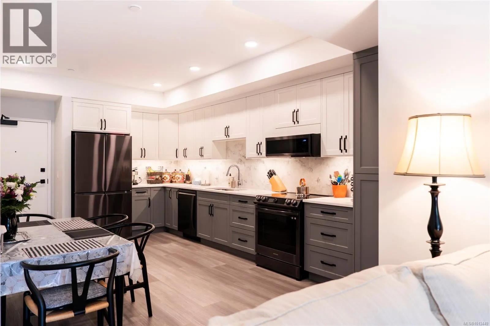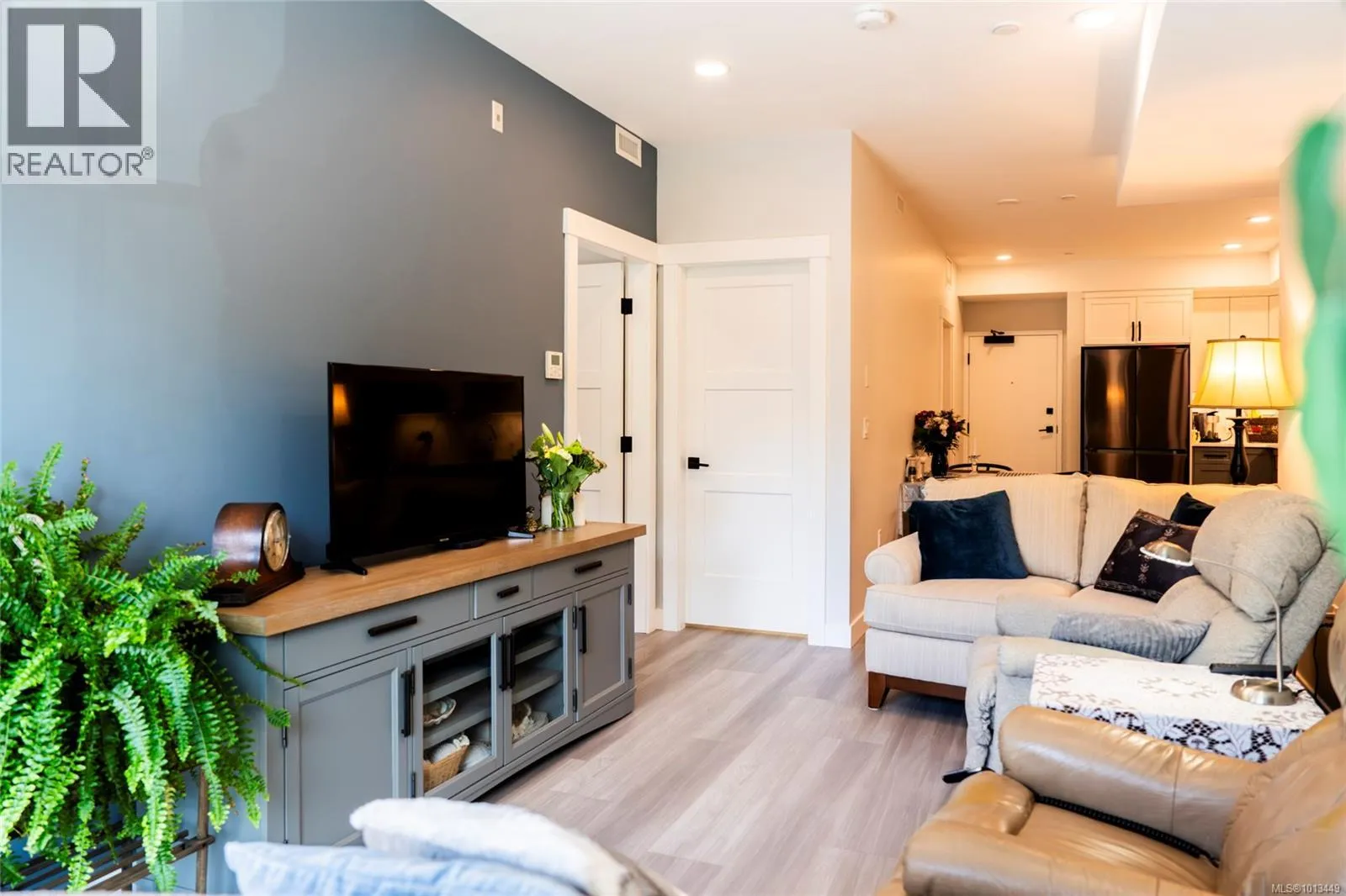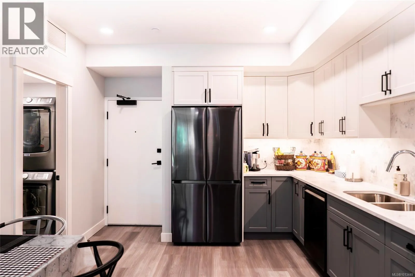 Steps from Nanaimo's Long Lake and North End amenities, this condo pairs modern design with a great location. Expansive windows brighten the open layout, while the kitchen is equipped with top-of-the-line Samsung stainless steel appliances, elegant quartz countertops, and a matching quartz backsplash for a clean, contemporary look. The open living space extends onto the deck through European-style exterior glass doors, perfect for extending your living space outdoors. This condo also features a one-of-a-kind in-suite storage space built in behind the bedroom closet offering practical convenience rarely found in condo living. The bathroom has been upgraded with a tiled walk-in shower, while stylish hardware and individual heat pumps add high-end touches and year-round comfort. One underground parking stall is included and a storage locker. With its unique features and prime setting, this home is an exceptional opportunity for those seeking modern comfort in a desirable Nanaimo location. (id:27476)
