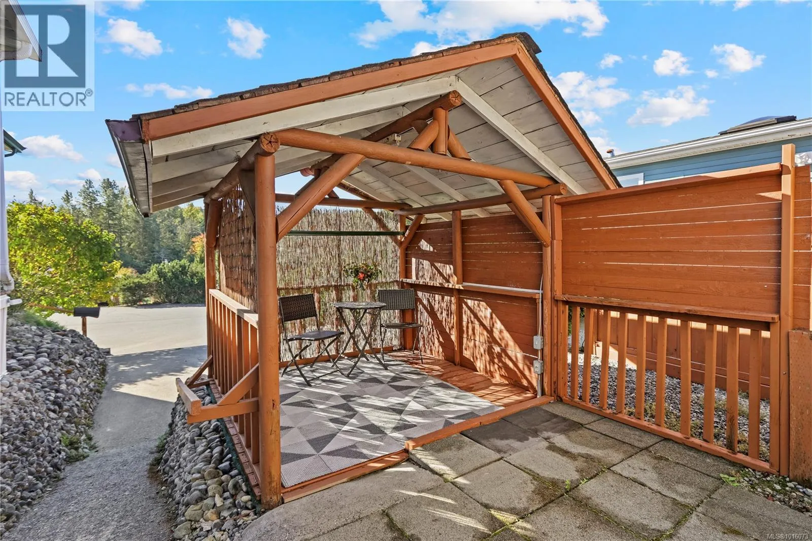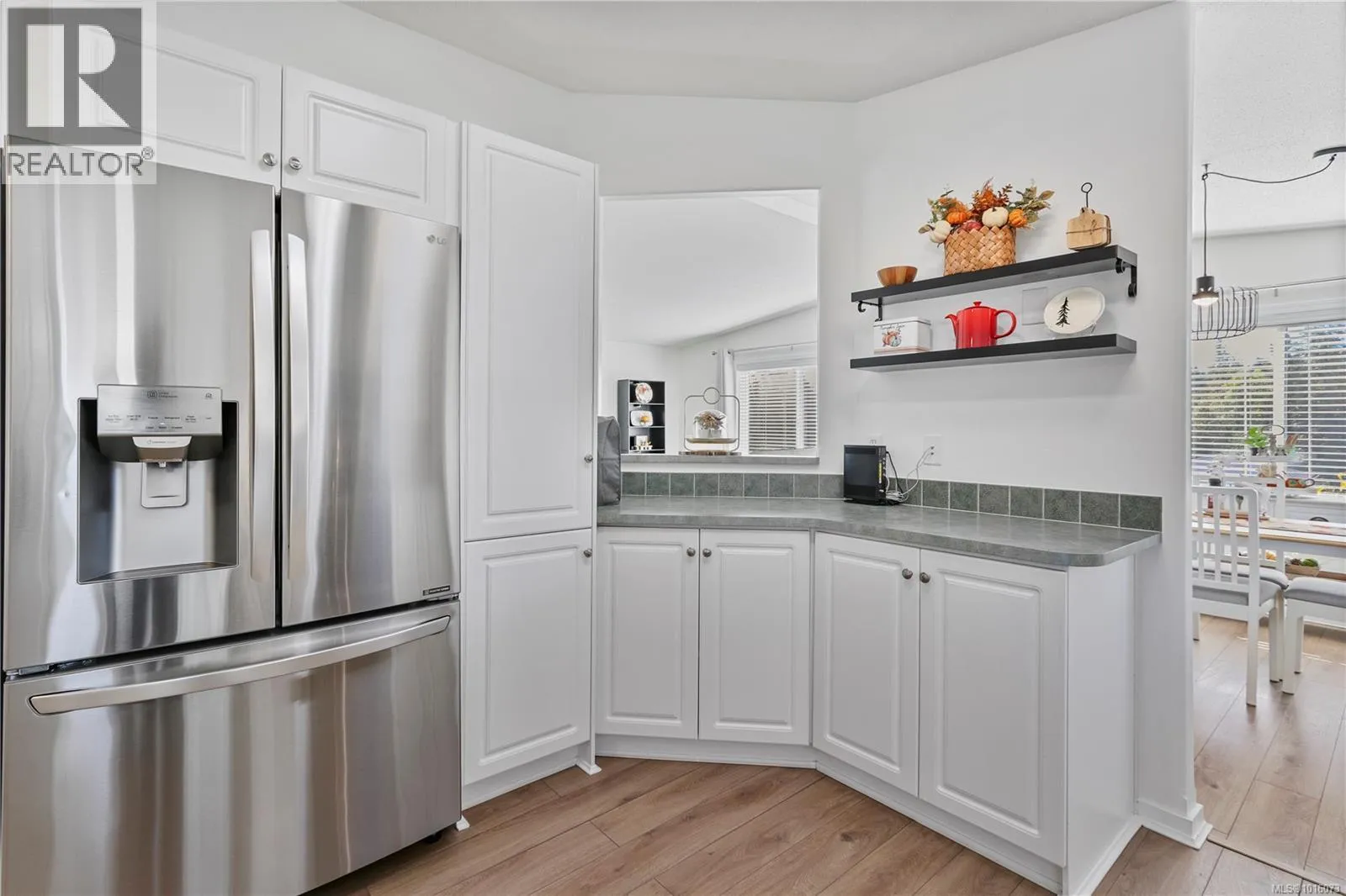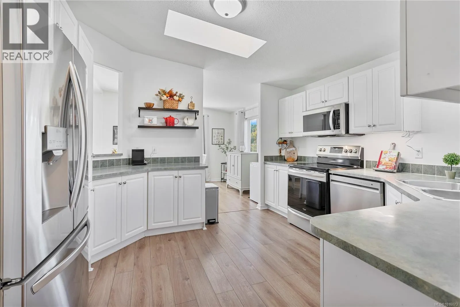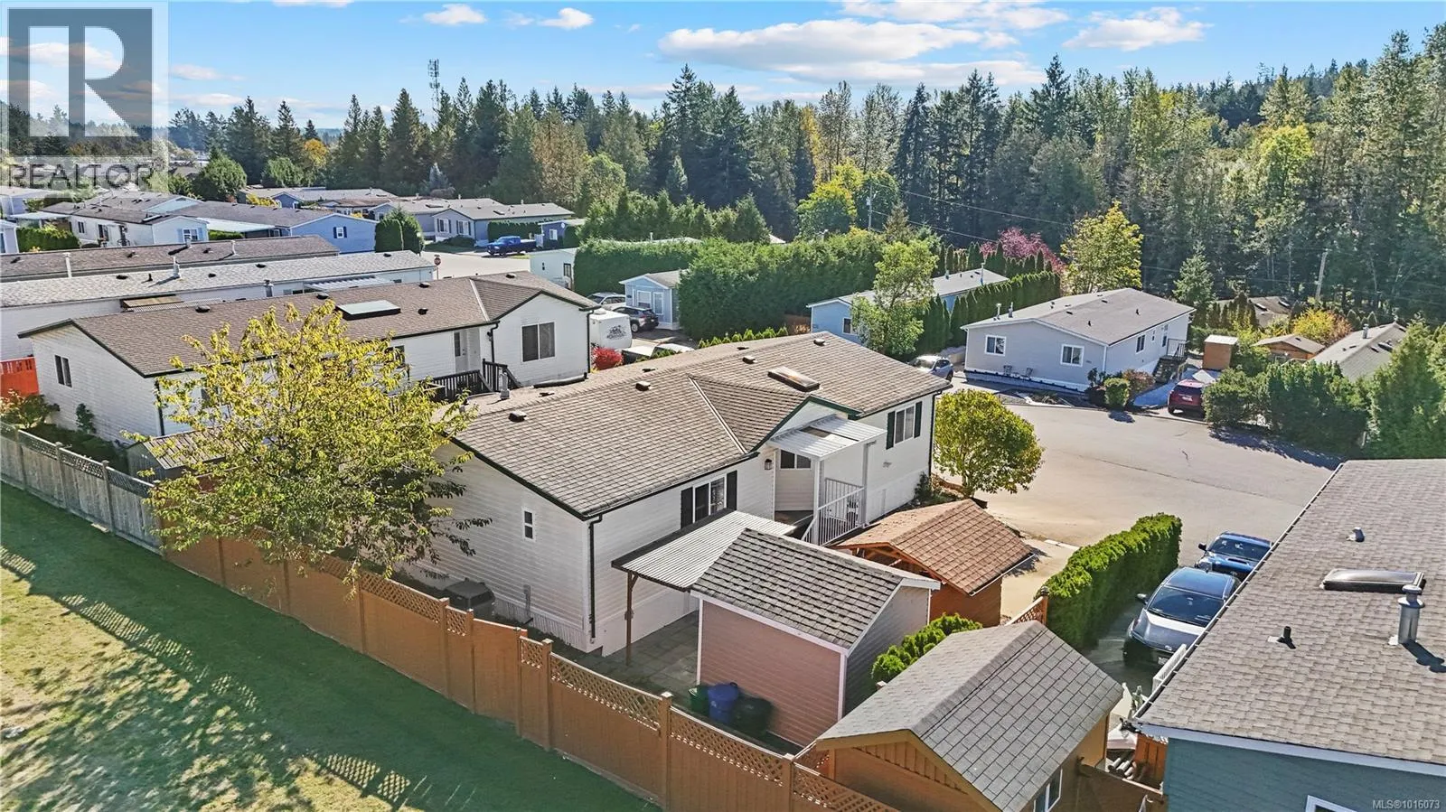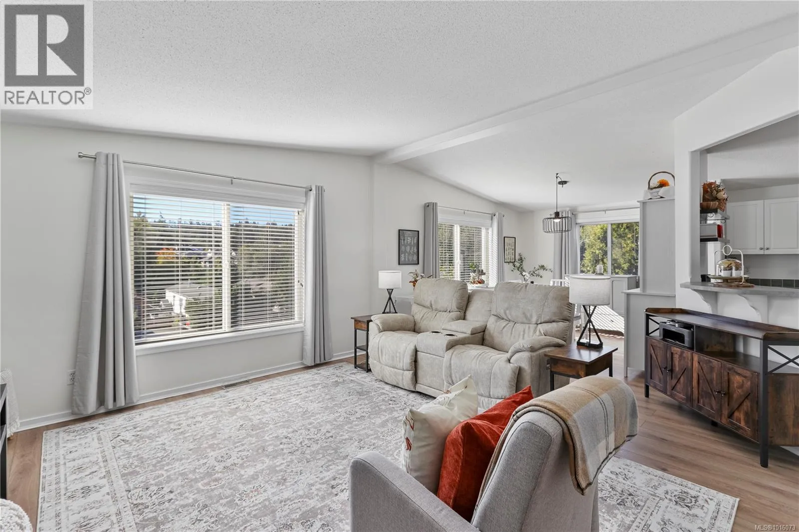 Bright, spacious, and impeccably maintained, this home sits high on its lot with beautiful south-facing views of forest and sky. The private setting features mature landscaping, a welcoming patio area, a cabana/tiki hut, workshop, and space for gardens. Inside, the home feels open and airy with a spacious living and dining area, large windows, and two skylights that fill the space with natural light. The kitchen showcases stylish white cabinetry, stainless steel appliancesâincluding a new dishwasherâand newer flooring that ties the space together beautifully. The primary bedroom includes a 4-piece ensuite, while the cozy guest room and den (with French doors) provide great flexibility. Recent updates add peace of mind, including a new furnace, washer and dryer, and CO2/smoke detector. Additional features include a heat pump for efficient heating and cooling. Located in Meadow Ridge Estates, a tidy and well-managed park, this home offers a peaceful setting just minutes from groceries and everyday amenities. A high fence with gate access opens to a grassy boulevardâperfect for dog walks or catching the nearby bus. Two small pets are welcome, and thereâs even a secure compound for RV or boat storage. This home has been beautifully maintained and stylishly updatedâcome see for yourself what makes it such a special find! (id:27476)