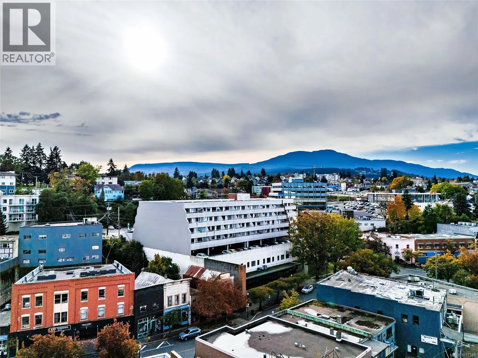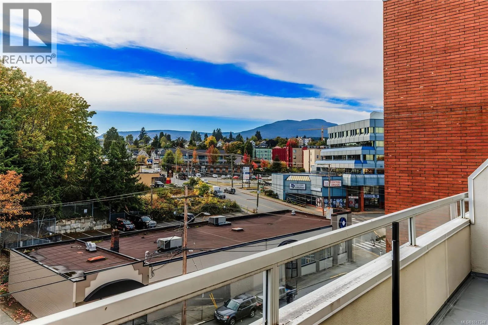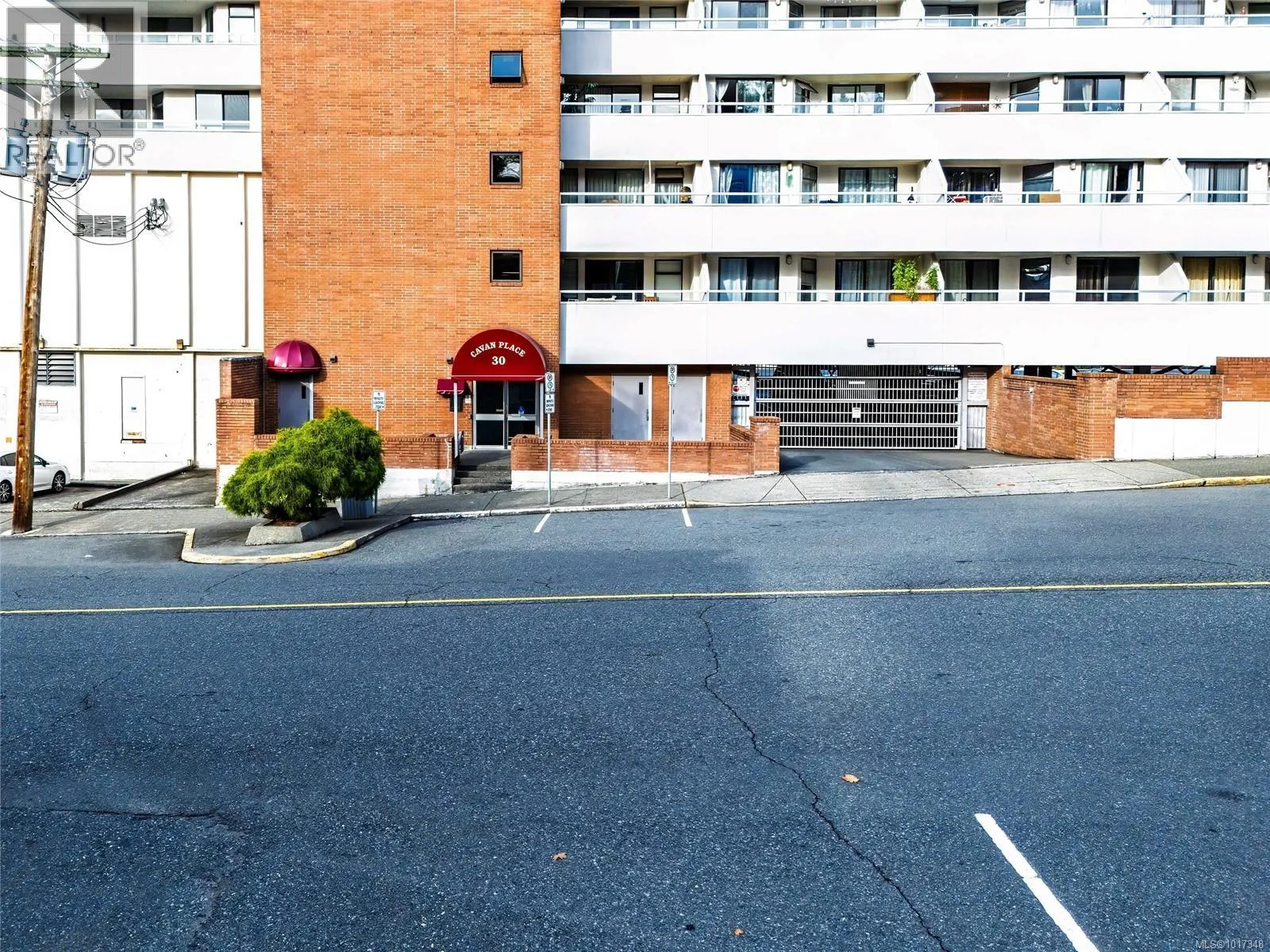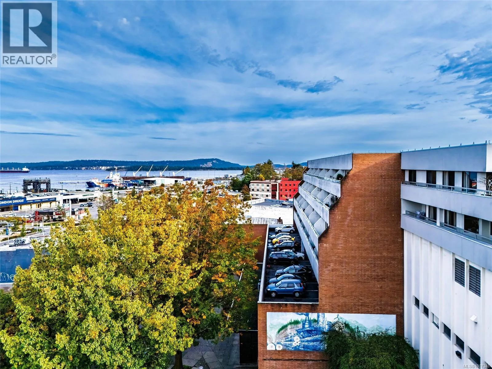 Downtown living with an affordable price tag, you donât want to miss this top floor unit. Located in a concrete building in the heart of the city centre, Cavan Place is perfect for buyers looking to embrace the best of urban living. Enjoy a morning walk on the seawall, an afternoon exploring the shops on Commercial Street, or an evening dining out at some of the Old City Quarterâs revered restaurants - all just steps from the building. With an open concept layout leading out to a generously sized balcony, this suite takes advantage of Mt. Benson views, lovely southern exposure & peek a boo ocean views from the deck. 2 bedrooms (or 1 + den) make this unit suitable for a wide variety of buyers. In suite laundry & secured parking (subject to availability) are also highlights. Please note, no pets are permitted. All meas approx pls verify. (id:27476)