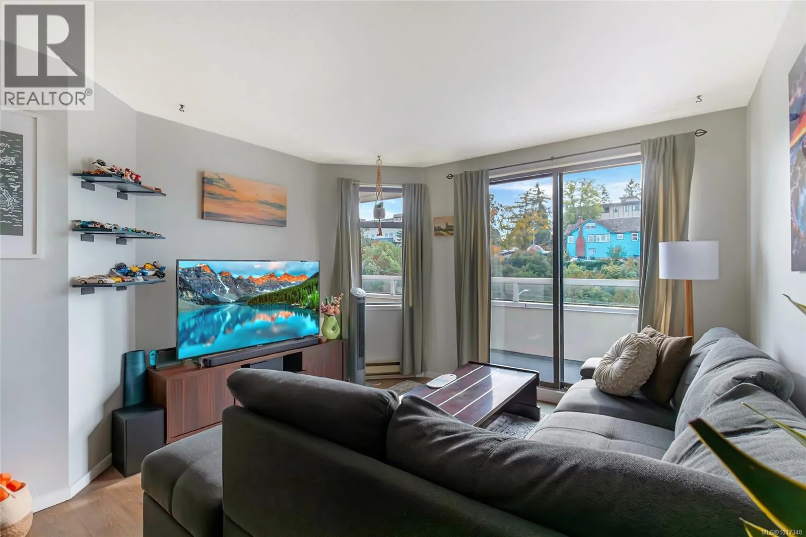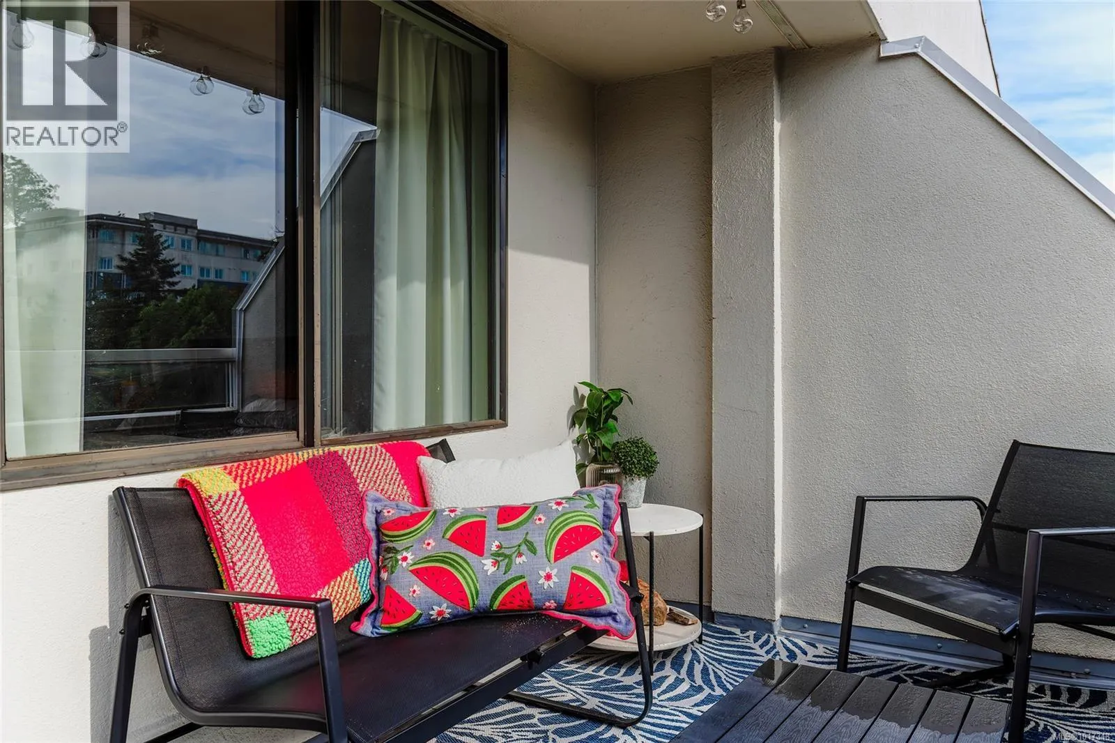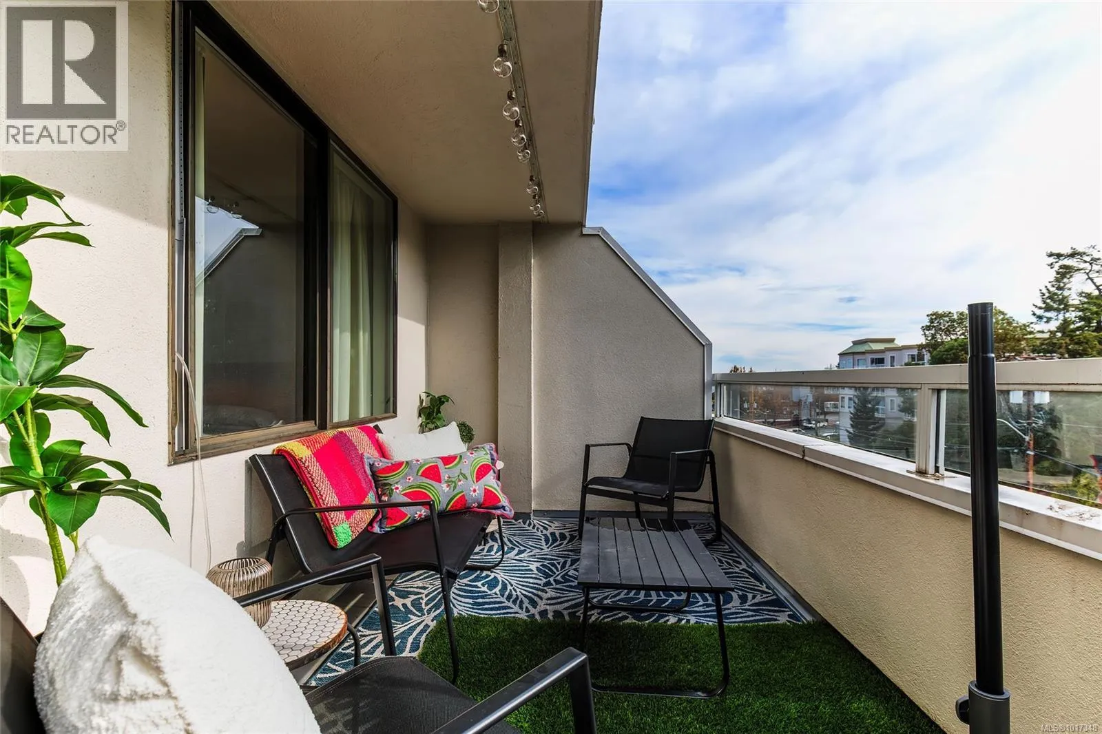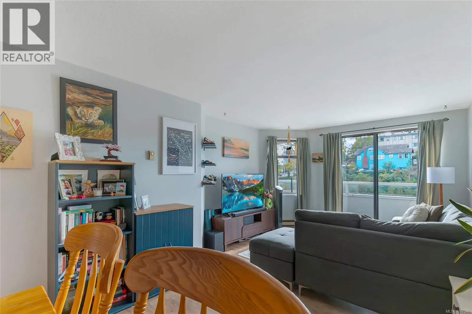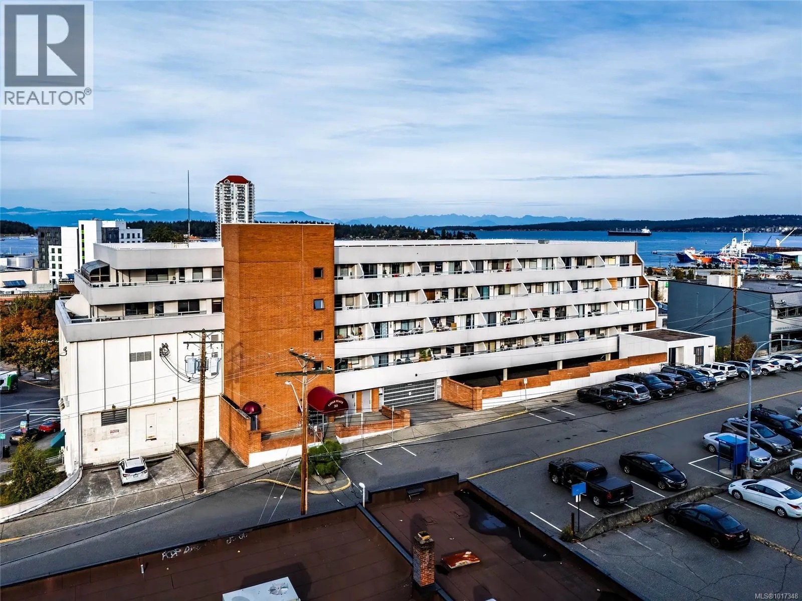 Downtown living with an affordable price tag, you donât want to miss this top floor unit. Located in a concrete building in the heart of the city centre, Cavan Place is perfect for buyers looking to embrace the best of urban living. Enjoy a morning walk on the seawall, an afternoon exploring the shops on Commercial Street, or an evening dining out at some of the Old City Quarterâs revered restaurants - all just steps from the building. With an open concept layout leading out to a generously sized balcony, this suite takes advantage of Mt. Benson views, lovely southern exposure & peek a boo ocean views from the deck. 2 bedrooms (or 1 + den) make this unit suitable for a wide variety of buyers. In suite laundry & secured parking (subject to availability) are also highlights. Please note, no pets are permitted. All meas approx pls verify. (id:27476)
