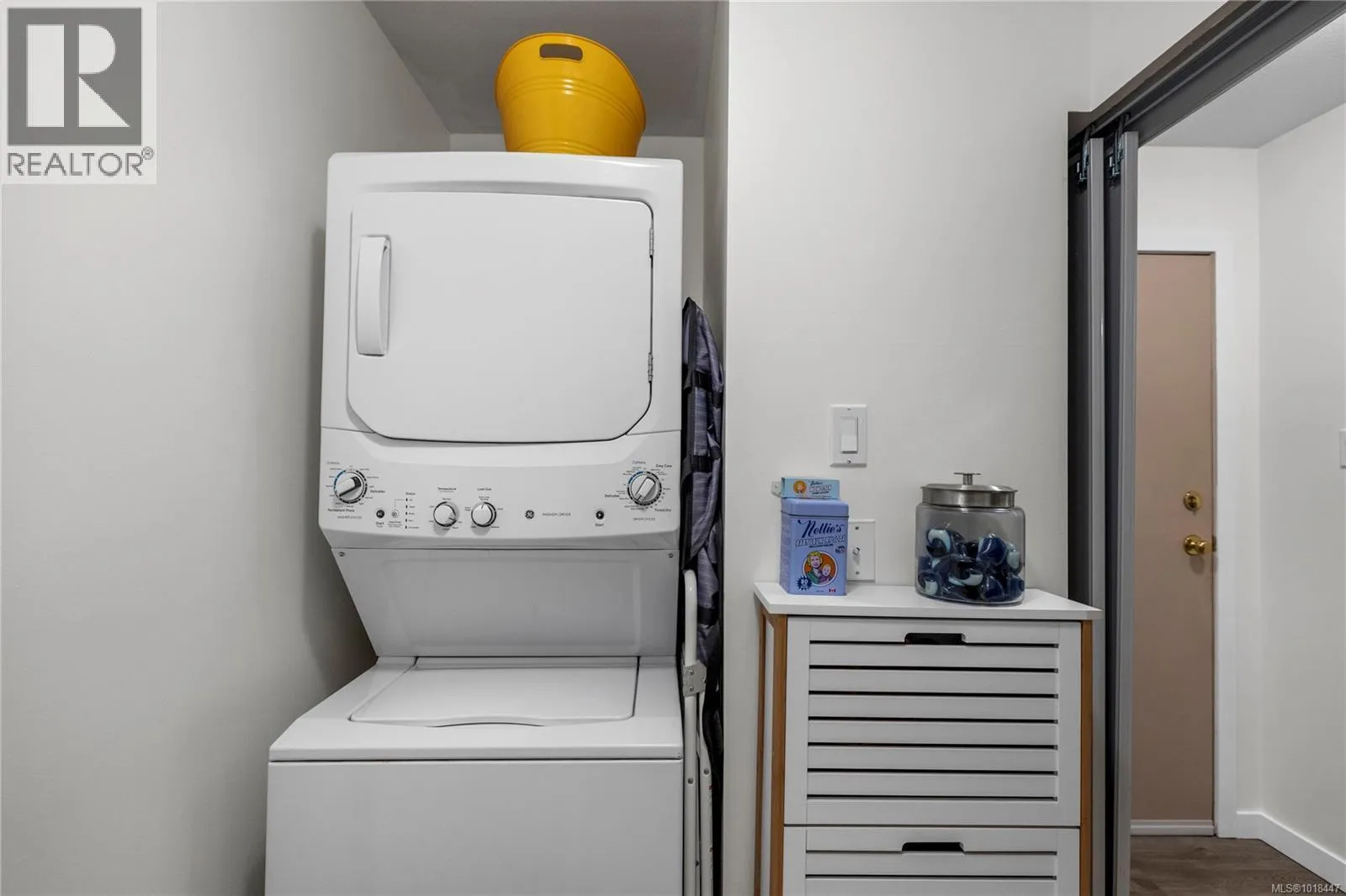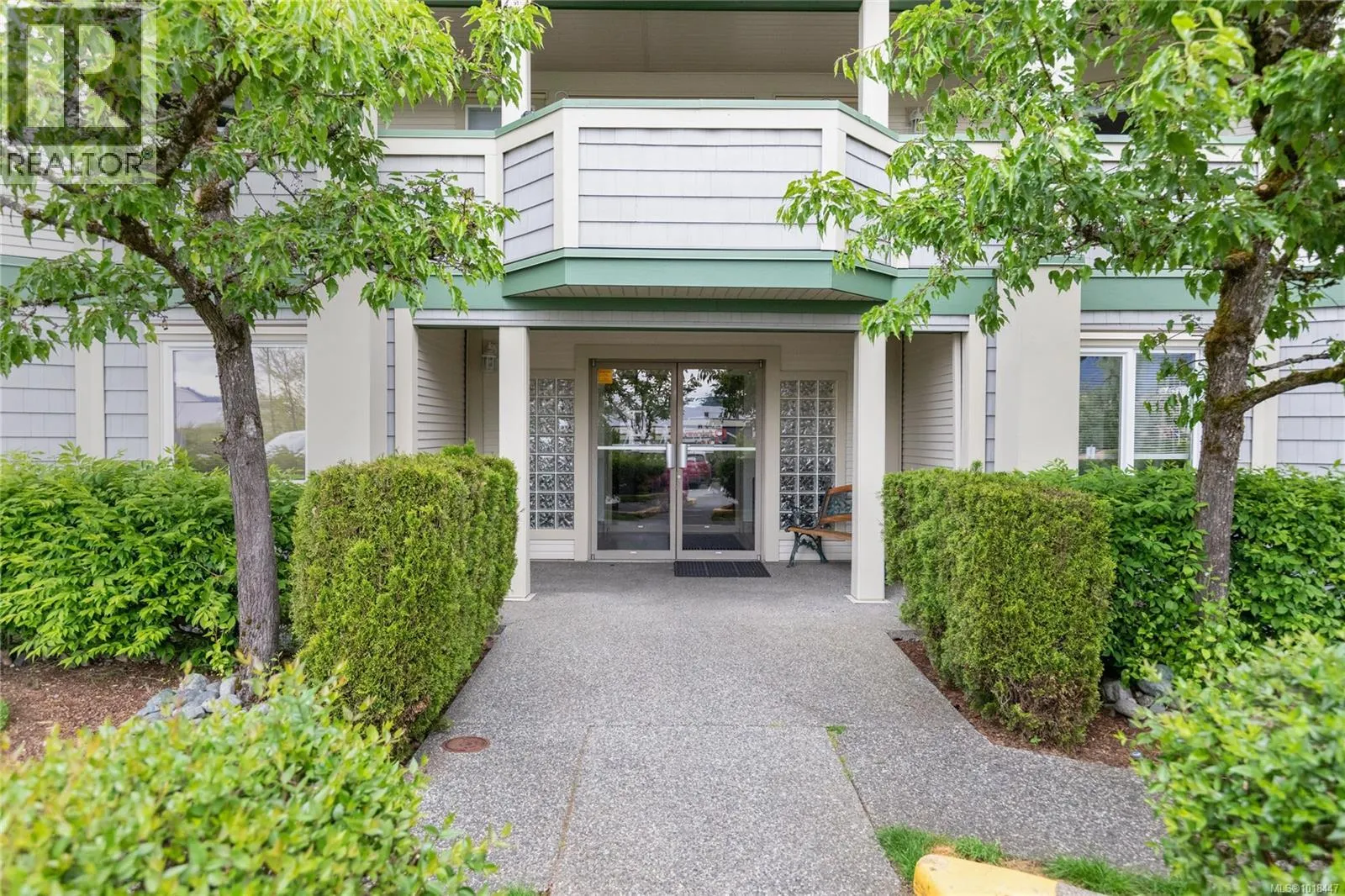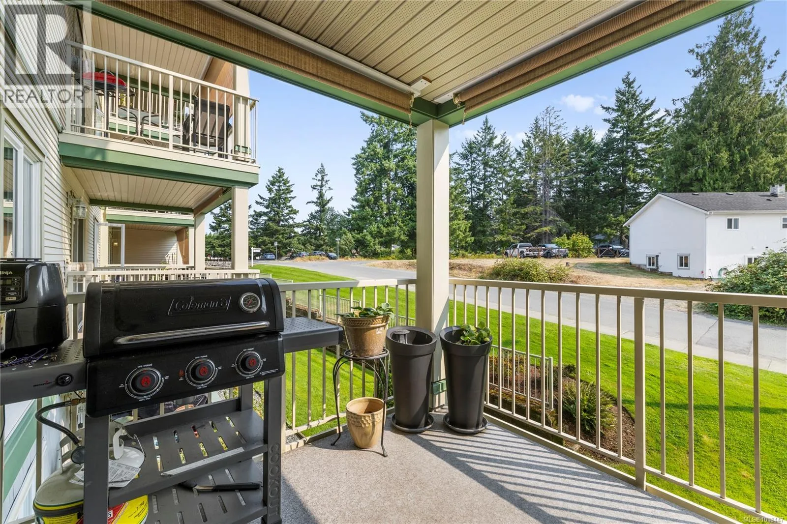 Welcome to this two-bedroom condo in the sought-after Rutherford Pointe complex. Enjoy a prime North Nanaimo location with a walking path to Nanaimo North Town Centre and nearby shops and services. Inside, the stylish kitchen, newer flooring, and spacious living and dining areas create a comfortable setting. A covered deck provides space to relax outdoors. The home features two bedrooms, including a primary with walk-in closet and four-piece ensuite, plus a second four-piece bathroom. An in-unit laundry room with storage adds extra convenience. One dog or cat up to 30 lbs and 16â tall is allowed. The strata fee includes hot water. For more information on this property see the 3D tour, video, and floor plan. All data and measurements are approximate and must be verified if fundamental. (id:27476)