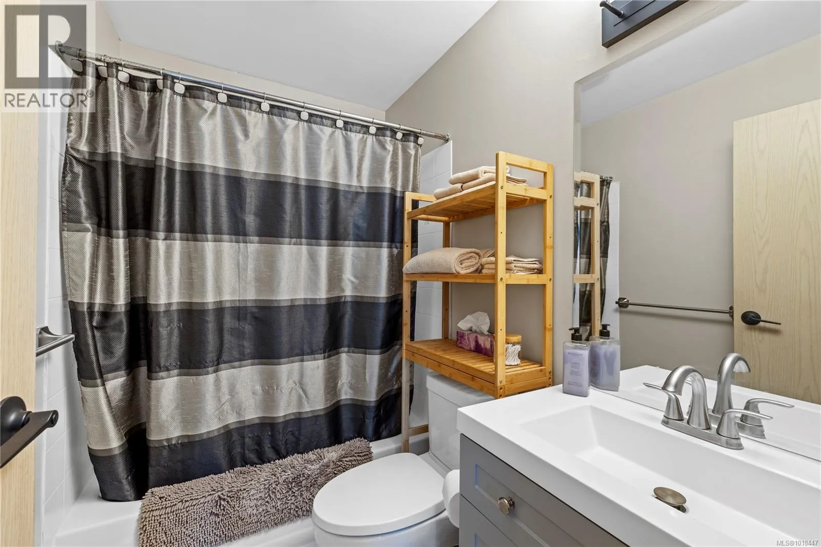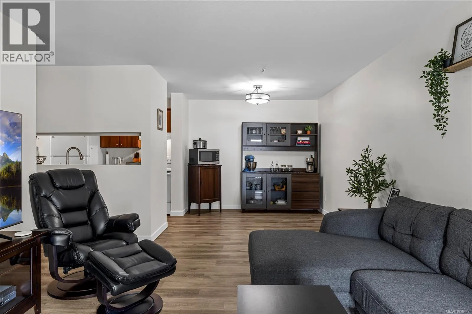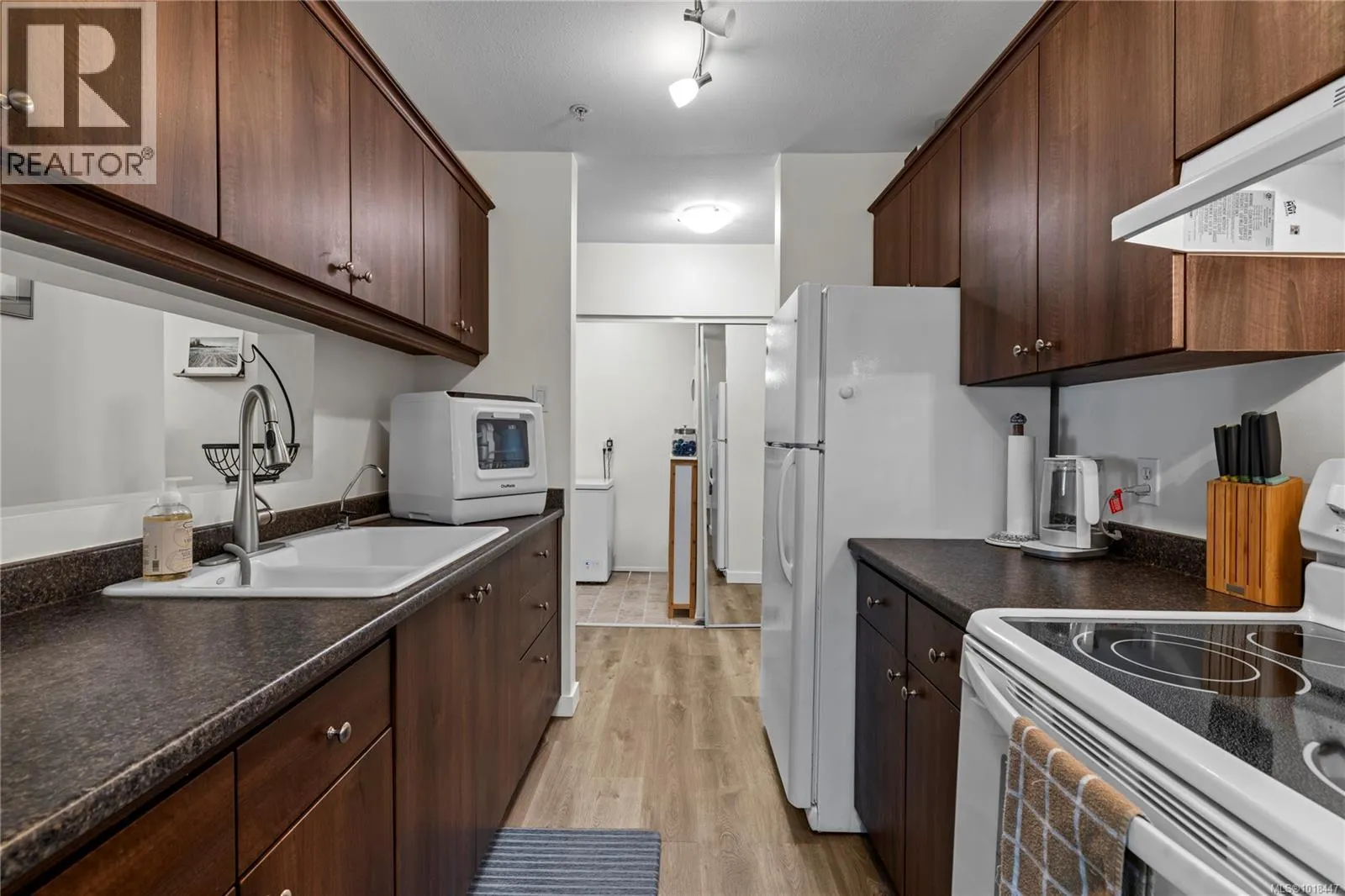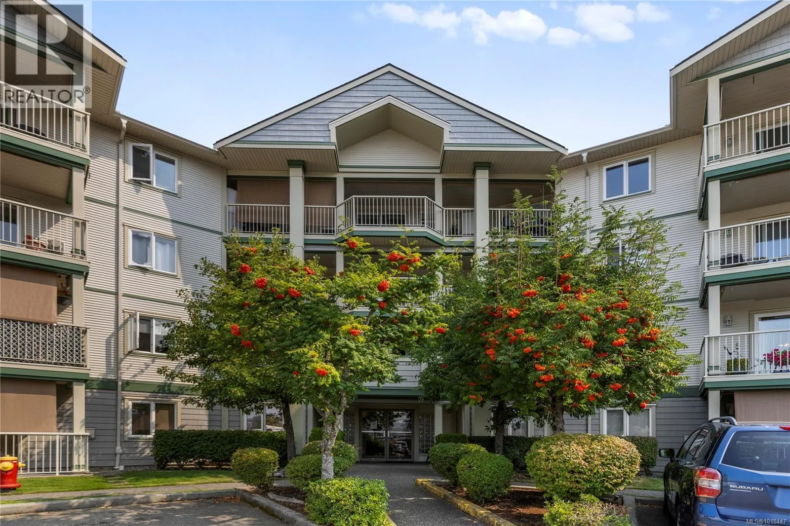 Welcome to this two-bedroom condo in the sought-after Rutherford Pointe complex. Enjoy a prime North Nanaimo location with a walking path to Nanaimo North Town Centre and nearby shops and services. Inside, the stylish kitchen, newer flooring, and spacious living and dining areas create a comfortable setting. A covered deck provides space to relax outdoors. The home features two bedrooms, including a primary with walk-in closet and four-piece ensuite, plus a second four-piece bathroom. An in-unit laundry room with storage adds extra convenience. One dog or cat up to 30 lbs and 16â tall is allowed. The strata fee includes hot water. For more information on this property see the 3D tour, video, and floor plan. All data and measurements are approximate and must be verified if fundamental. (id:27476)