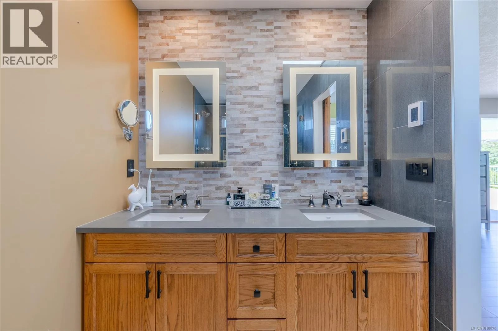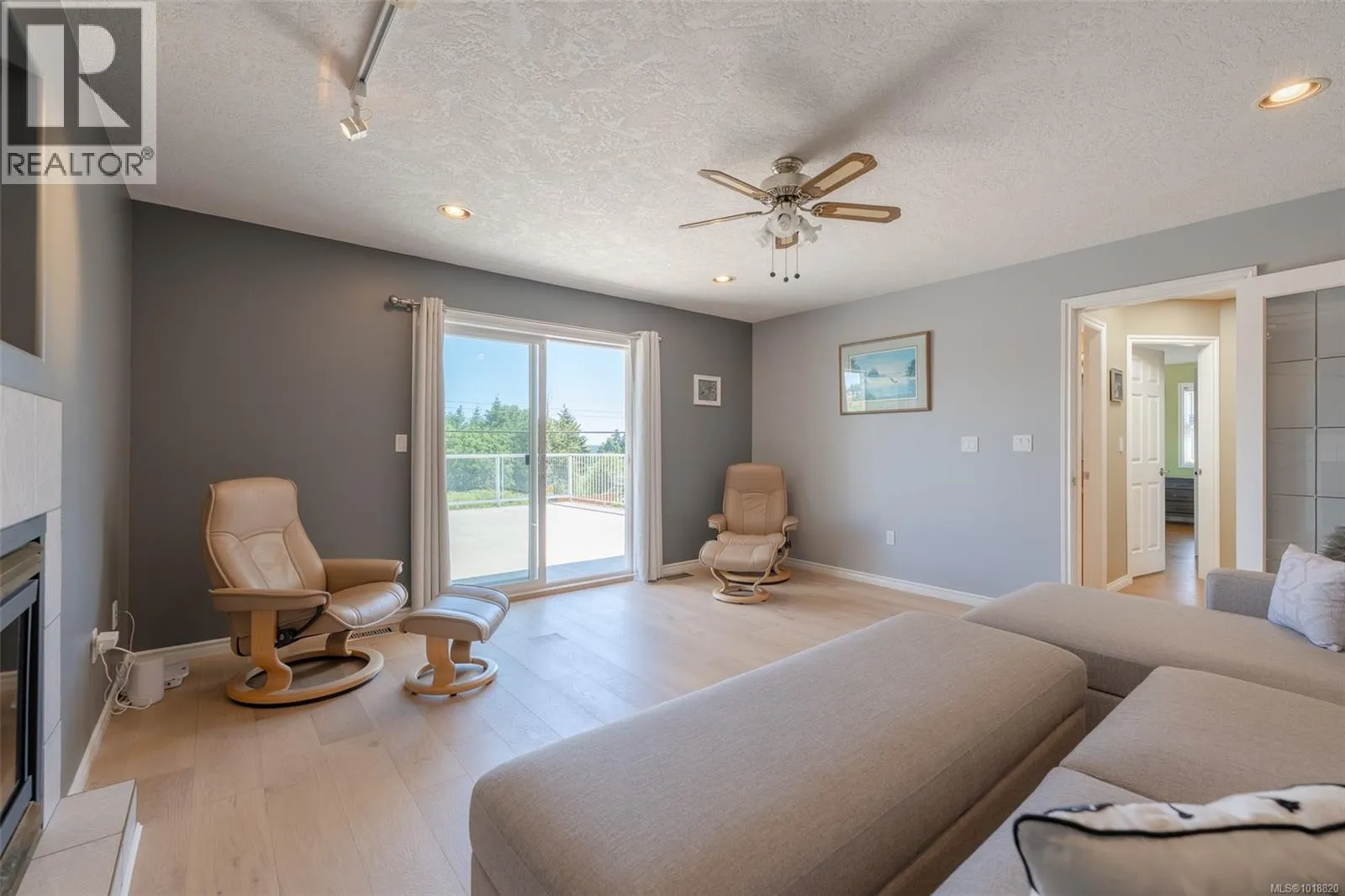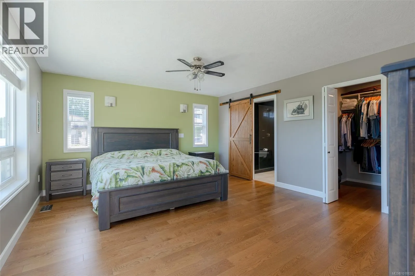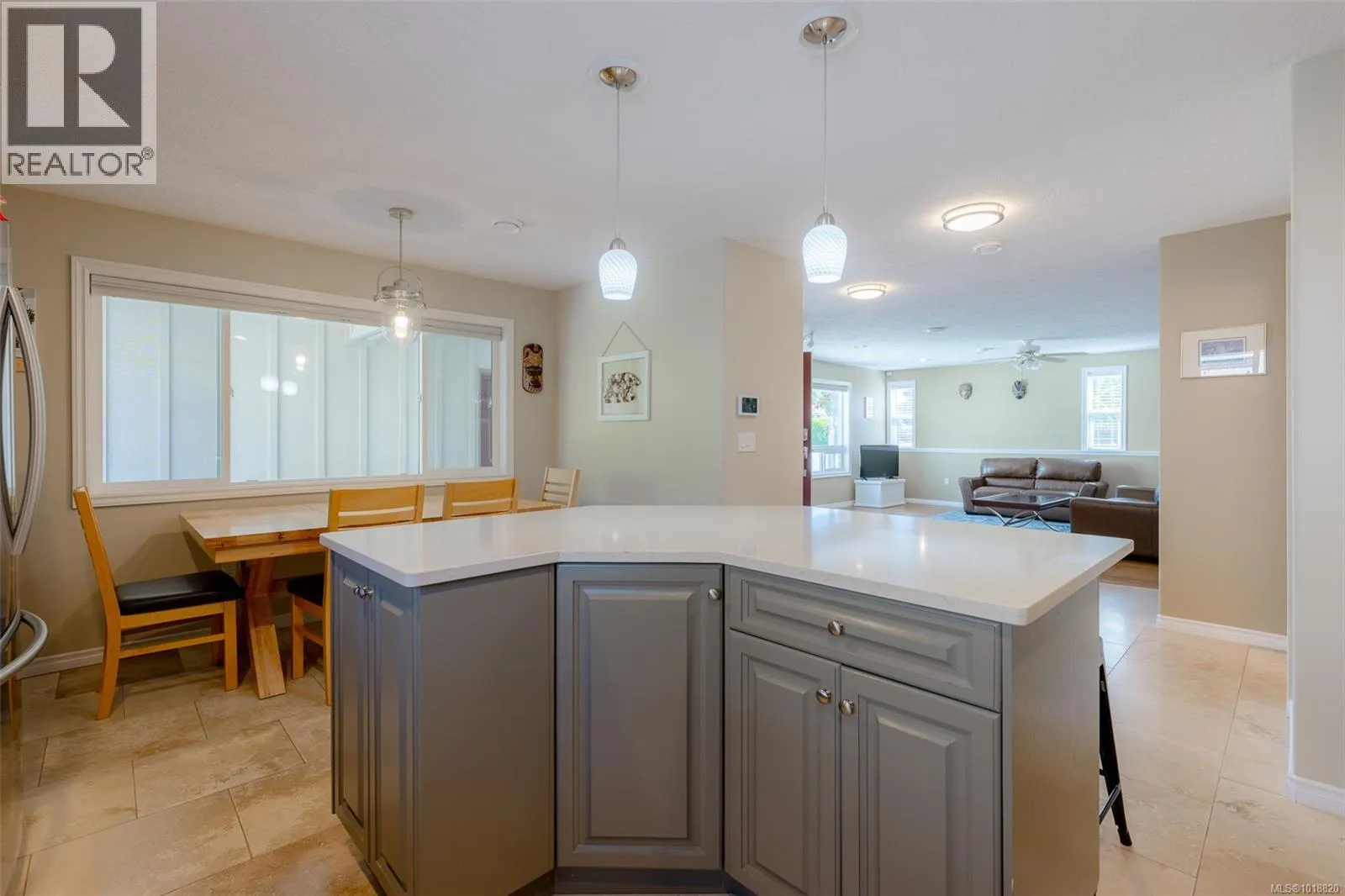 Set in a quiet, private neighborhood, this beautifully updated sunny Departure Bay home blends comfort, style, and energy efficiency. Inside, enjoy hardwood and engineered hardwood throughout, with heated tile in the kitchen and ensuite. The bright kitchen features quartz countertops, stainless steel appliances, and a central islandâideal for entertaining. The main level includes a bedroom, full bathroom, and laundry, while upstairs offers three additional bedroomsâincluding a spacious primary suite with a spa-like custom ensuiteâand a family room with access to a sunny upper deck. A second large rear patio provides even more outdoor living space. Walk to beaches, cafés, and enjoy the convenience of being just five minutes from shopping, schools, and other amenities. RV parking and low-maintenance landscaping complete this move-in-ready home. Measurements are approximate, buyers to verify if important. (id:27476)