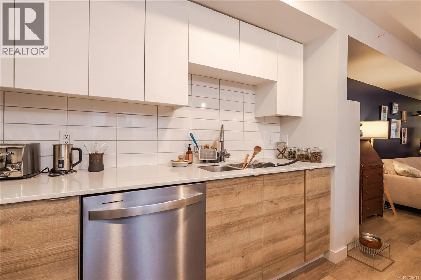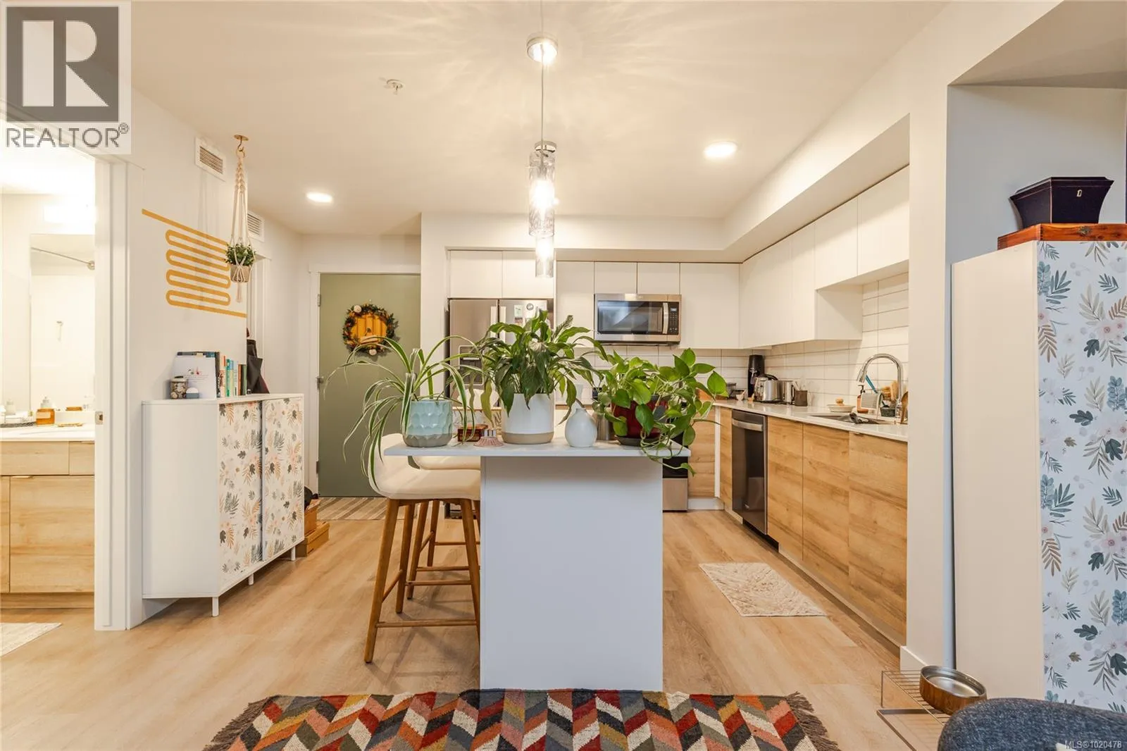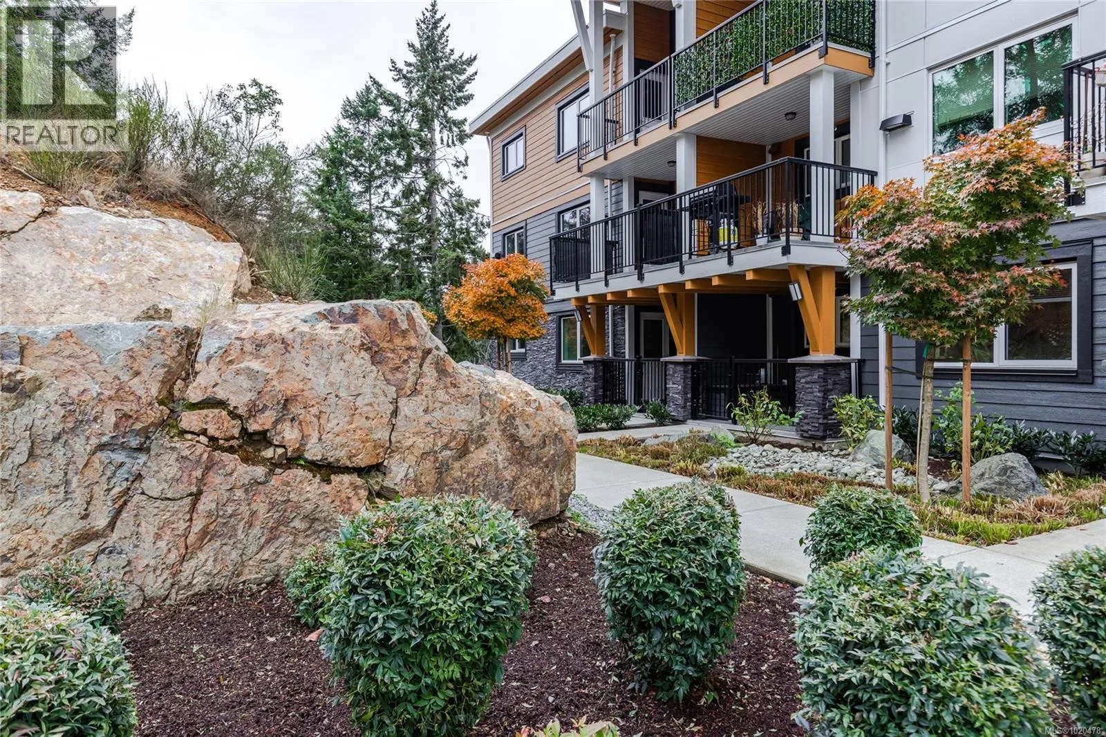 Hers's a modern 1 bedroom 1 bath ground level condominium with its own private entrance off the patio. Offering a large open living area with high ceilings, a beautiful kitchen with quartz countertops and high end cabinetry, spacious bedroom and in-suite laundry. Lakeside Terraces is a Built Green community featuring triple pane windows, solar panels and LED lighting. There is secure underground parking with bike storage and EV capability. The complex also features a large amenity building with a gorgeous lounge, games room, kitchen, gymnasium and even a yoga room. Overall a well built complex and all within a short walk to Long Lake and North Town Center. (id:27476)