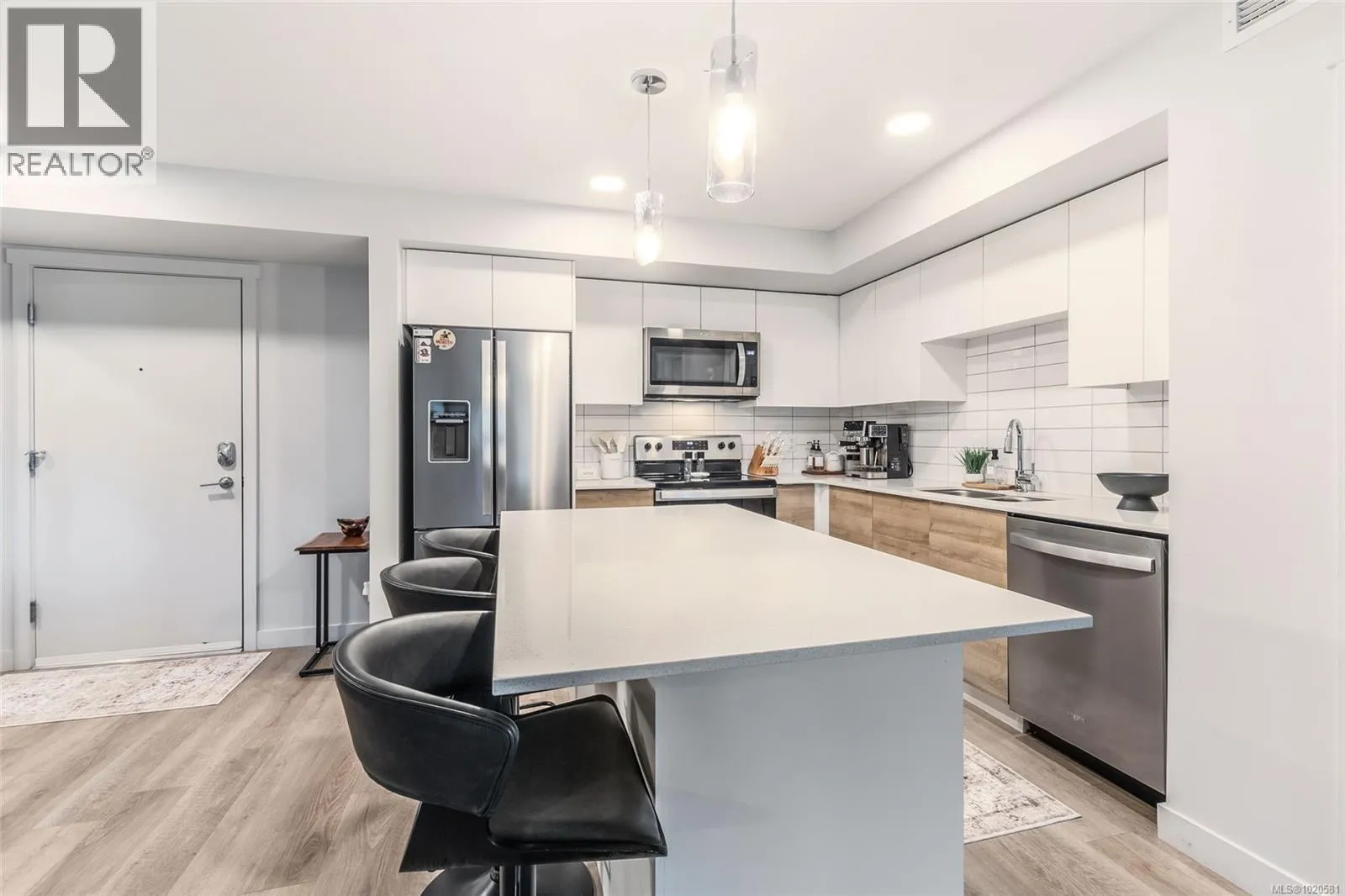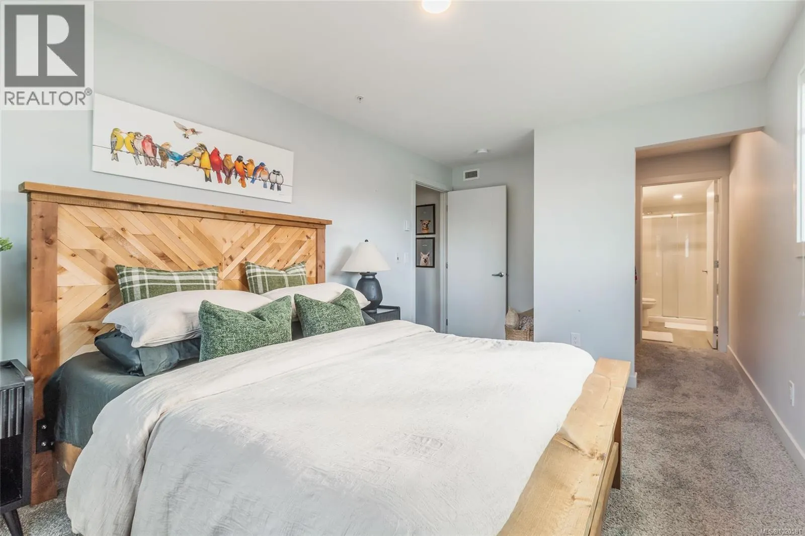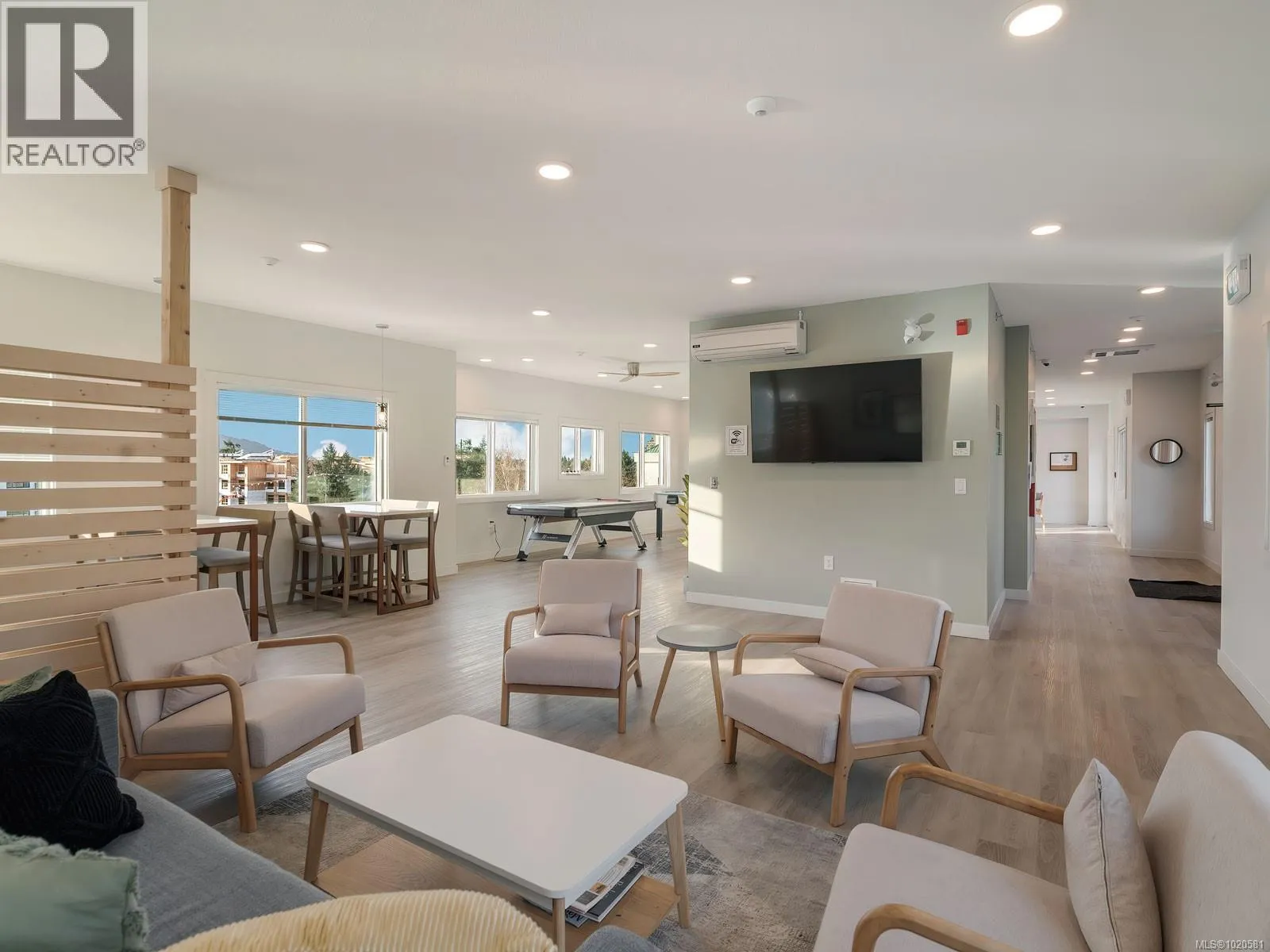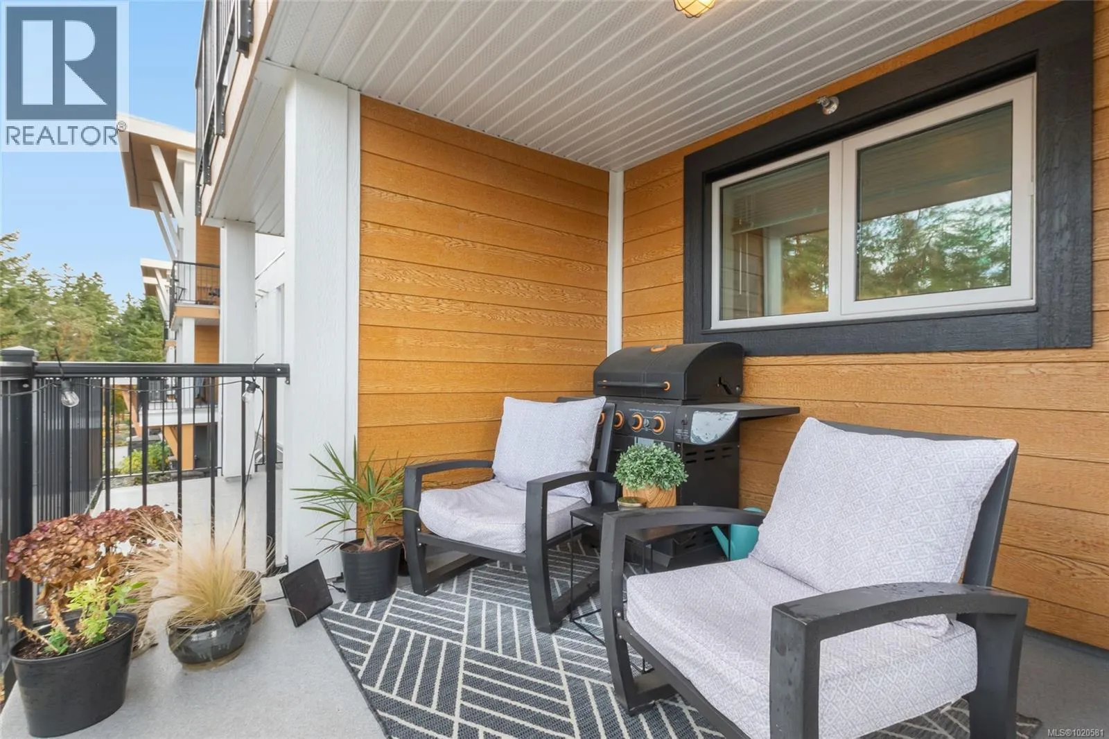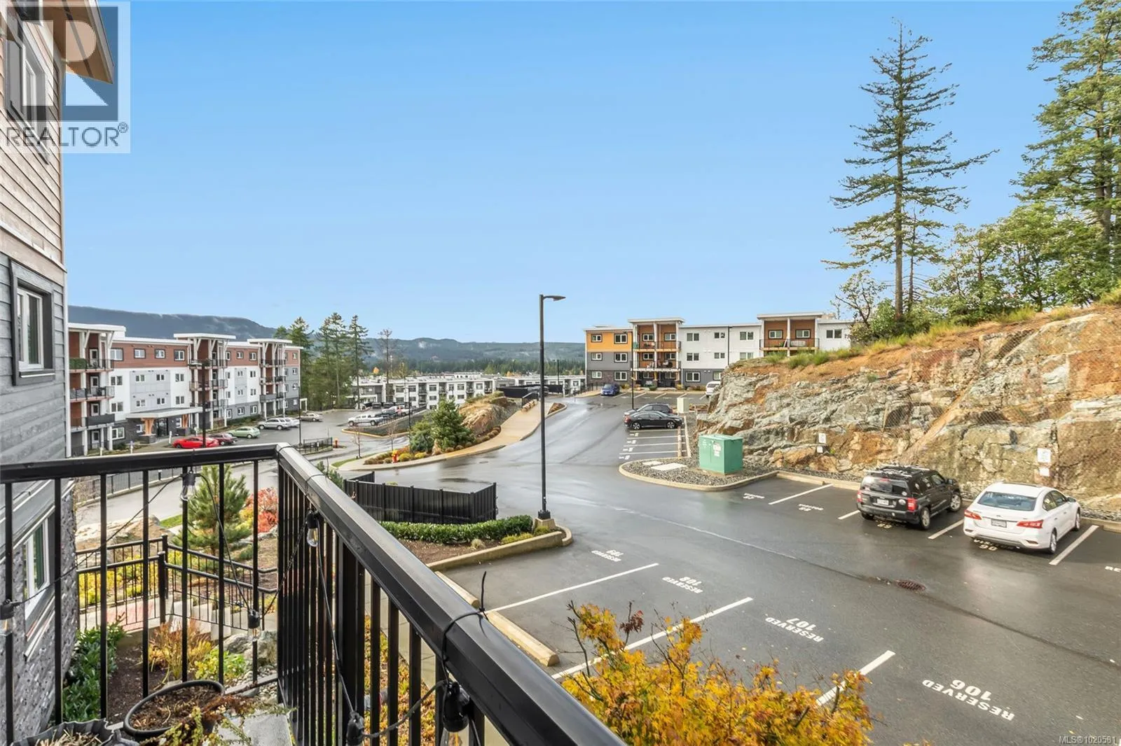 This 2-bd, 2-bth unit at Lakeview Terrace is nestled in a private part of the complex overlooking an Arbutus forest. Located in the smallest of the 3 buildings this unit offers the LARGEST floor plan in the development, & is 1 of only 4 corner units w/ an OVERSIZED deck- the perfect spot to enjoy the afternoon & evening sun it gets all summer long. As a corner unit, it features an additional window in the primary, bringing in beautiful natural light. The kitchen boasts quartz countertops, S/S appl, a spacious island & tile backsplash. The primary includes a walk-through closet & 3-piece ensuite, while the secondary bedrm also offers a walk-in closet w/ a cheater to the main bath. Designed for sustainability, this home is BUILT GREEN® w/ triple-pane windows, solar panels, an HRV system, & a heat-pump hot water tank, ensuring lower strata fees & utility costs. The unit includes 1 parking stall & a bike storage locker. Residents enjoy access to an impressive clubhouse with a gym & yoga area, community lounge, and full kitchen. Ideally located in North Nanaimo, this unit is steps from Long Lake, walking trails, transit routes, and Nanaimo North Town Centre. Potential eligibility for CMHC rebate (Buyer to verify). (id:27476)