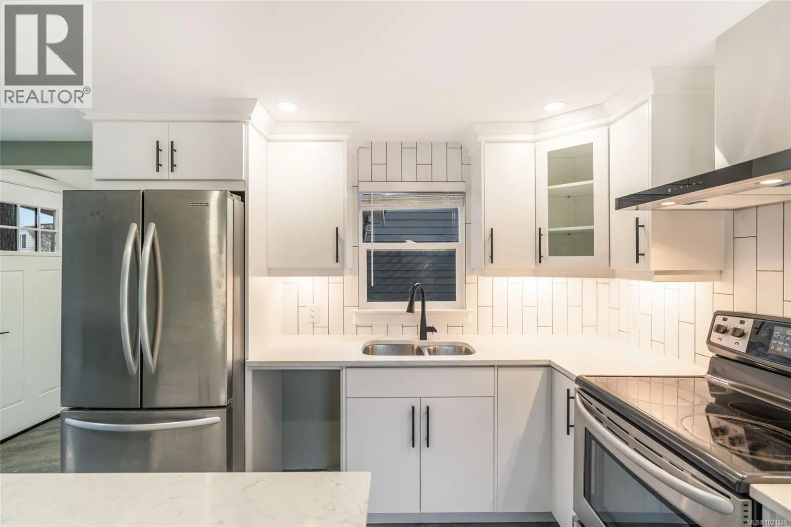 A newer built architectural engineered 2 bedroom custom mobile in 55+ park sitting on a city size fenced lot, with extra parking. Its vacant and Move in Ready. Truly executive styling is apparent throughout this spacious and bright show stopper. Both decks are brightly lit. Fully modern kitchen comes with gorgeous cabinets, under cabinet lighting, pot-lighting, quartz counters, tiled backsplash and stunning range hood. All laminate flooring done on the Bias for visual appeal. Complete with electric fireplace and attractive mantle. The bathroom tiling is also on the Bias and fixtures are jaw dropping beautiful. A washer/dryer alcove , fresh-air exchange and ductless heat pump are nice. Window blinds are Bi-Directional. Inviting entrance with classy duel closets. Hardie plank siding over rain-wall and custom trim thru-out. An exemplary remodel completed in 2022 with Architectural designed, engineered, blueprinted and permits that meet or exceed current codes. Done to absolute perfection. (id:27476)