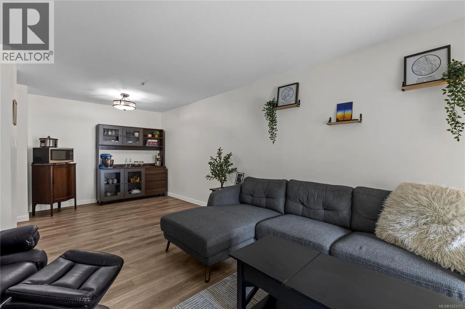 Welcome to this two-bedroom condo in the sought-after Rutherford Pointe complex. Enjoy a prime North Nanaimo location with a walking path to Nanaimo North Town Centre and nearby shops and services. Inside, the stylish kitchen, newer flooring, and spacious living and dining areas create a comfortable setting. A covered deck provides space to relax outdoors. The home features two bedrooms, including a primary with walk-in closet and four-piece ensuite, plus a second four-piece bathroom. An in-unit laundry room with storage adds extra convenience. One dog or cat up to 30 lbs and 16â tall is allowed. The strata fee includes hot water. For more information on this property see the 3D tour, video, and floor plan. All data and measurements are approximate and must be verified if fundamental. (id:27476)