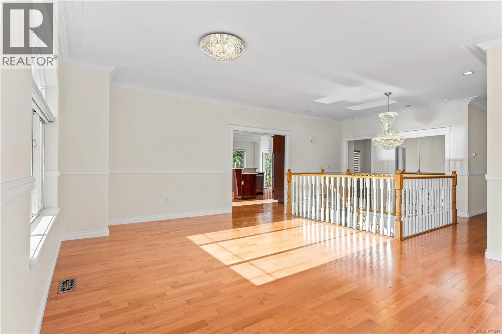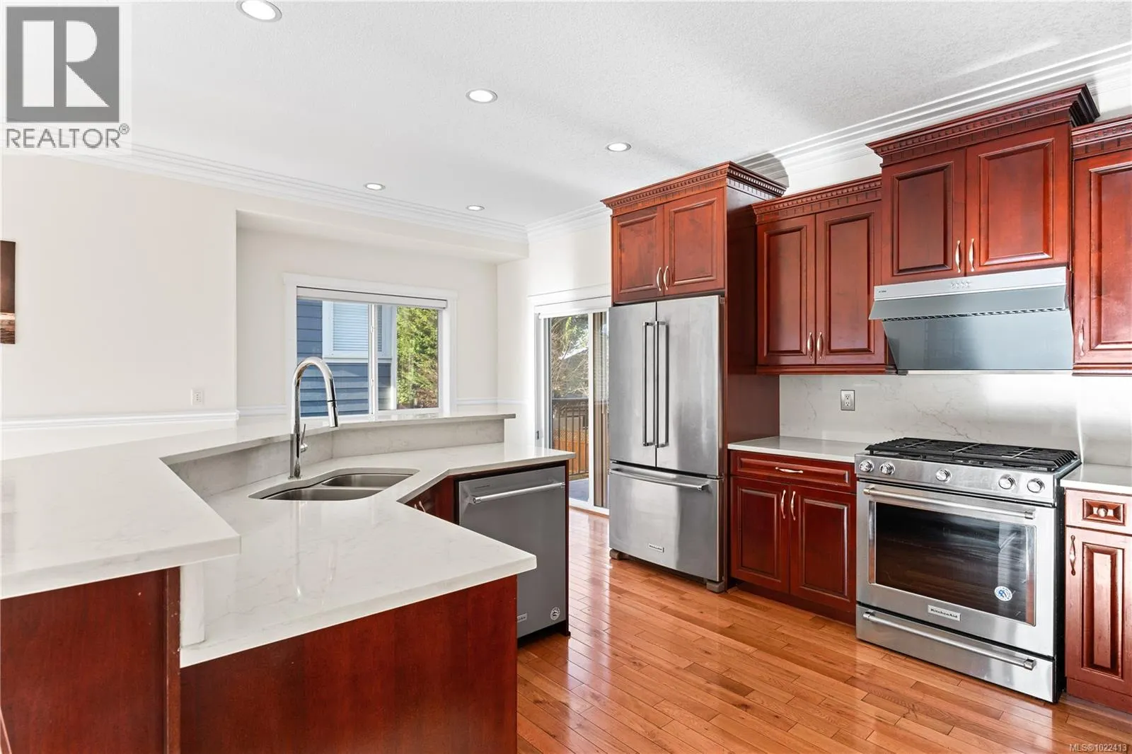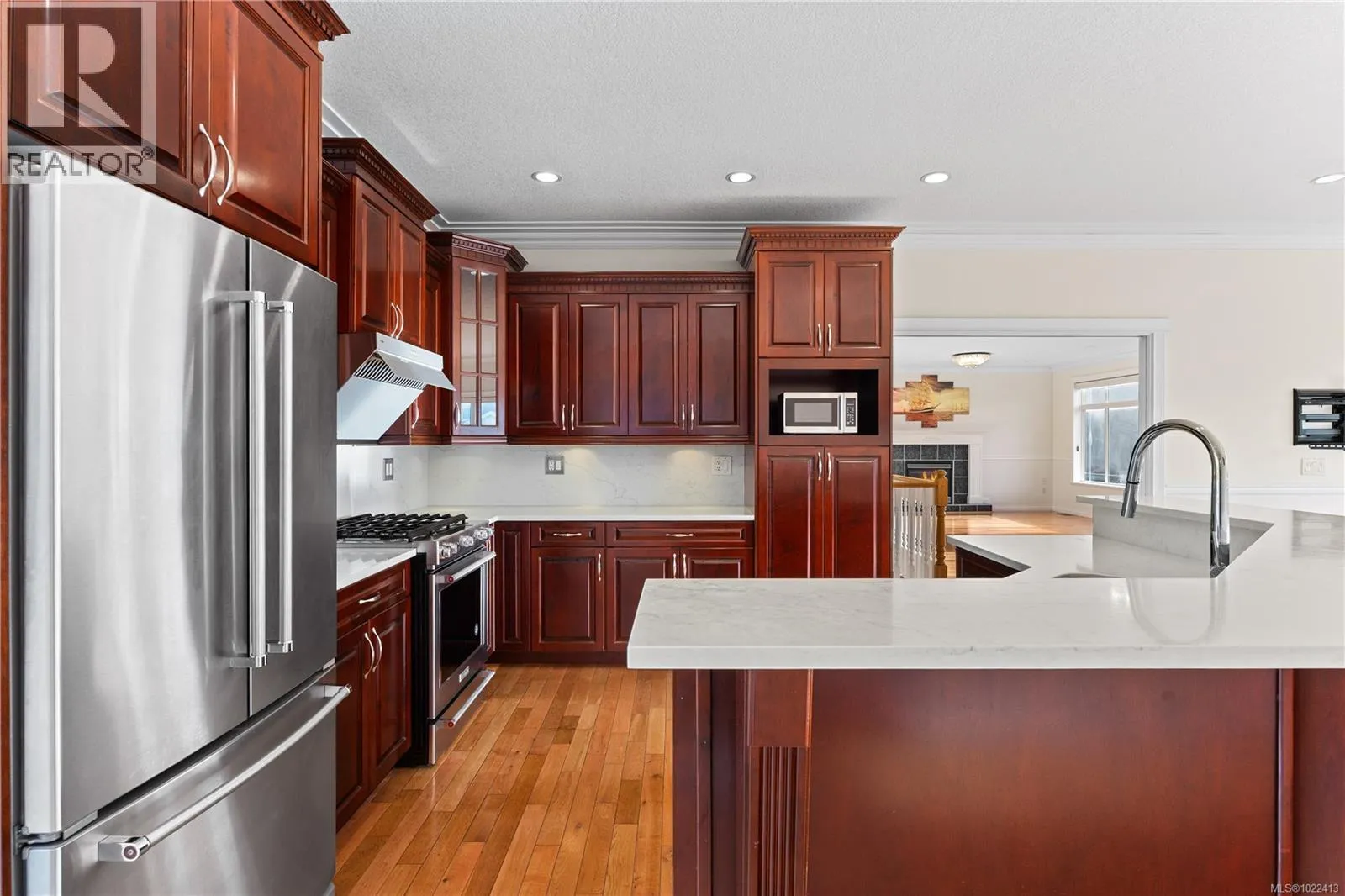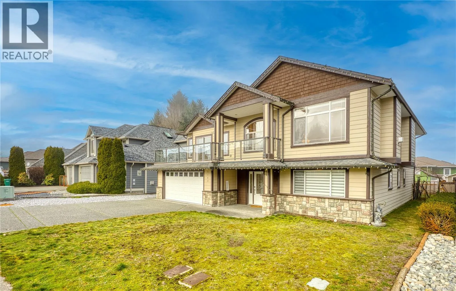Located in notable community of North Nanaimo, this custom-built home sits on flat, private lot within walking distance to beaches, shopping mall, parks, schools. Offering over 3,300 sq ft living space, it features 6 bedrooms & 4 bathrooms, including a legal one-bedroom suite w/ separate entrance, ideal for extended family/rental income. Main level welcomes you with a gracious foyer, 9 ft ceilings, hardwood flooring, crown molding, skylights, large windows providing abundant natural light. Kitchen is well designed w/ custom cabinetry, island with breakfast bar, gas stove, SS appliances. Spacious primary bedroom includes walk-in closet & ensuite with jetted tub, separate shower. Lower level offers a large media/recreation room with wet bar and additional living space. Outdoors features include front & rear decks, fenced backyard, sprinkler system. Energy-efficient forced air heating with heat pump. Quick possession available. Measurements are approximate; verify if important. (id:27476)