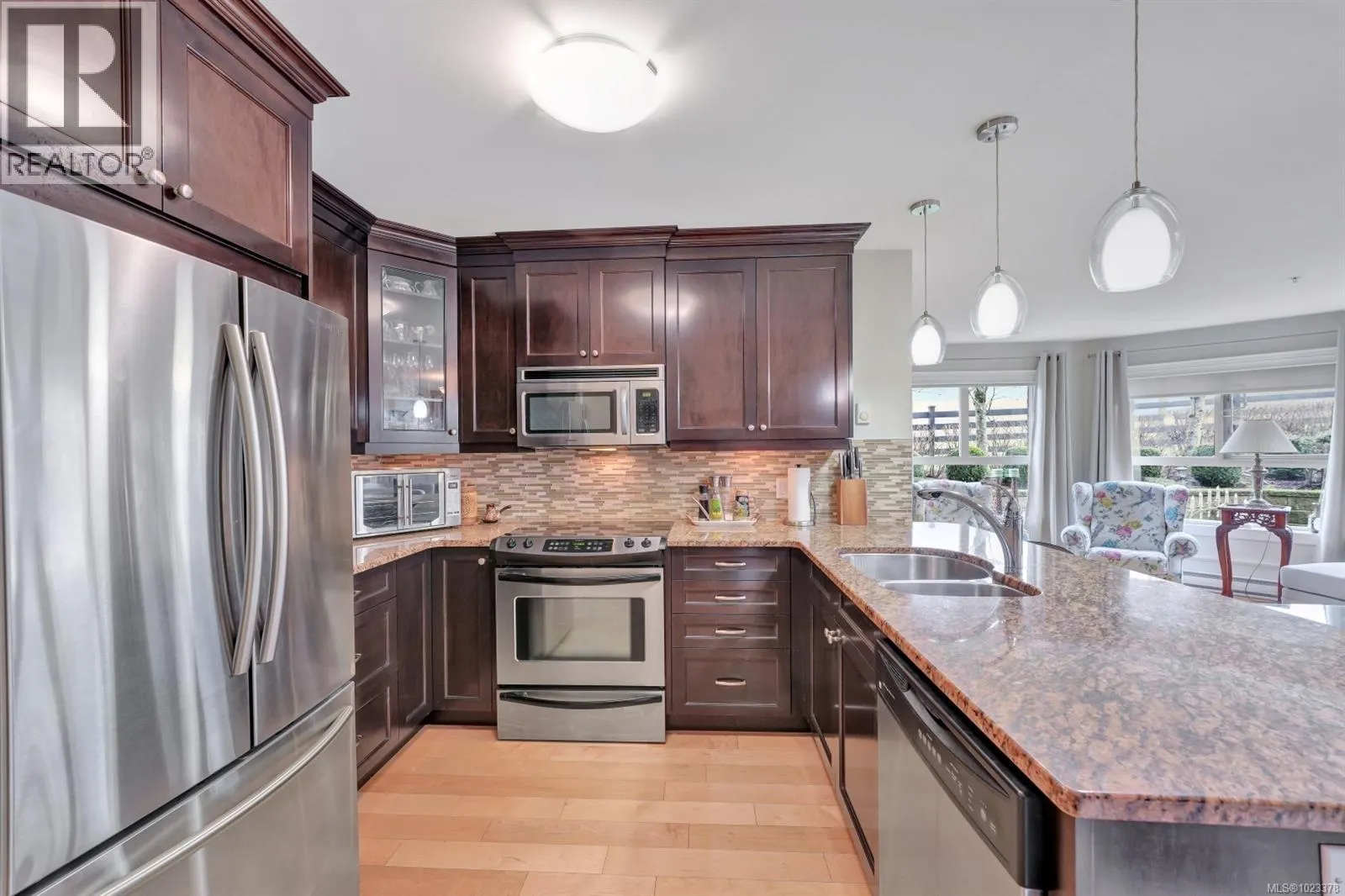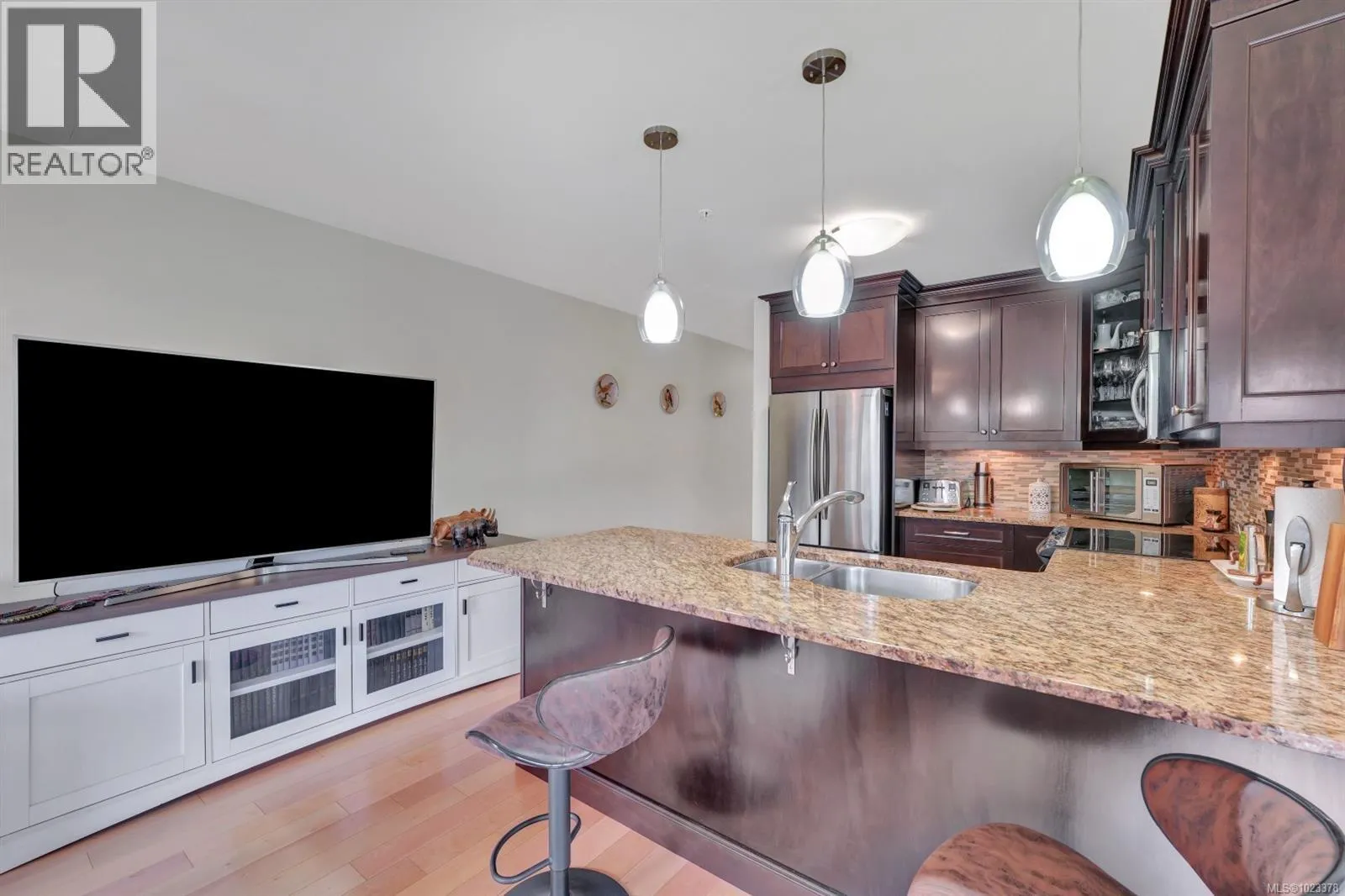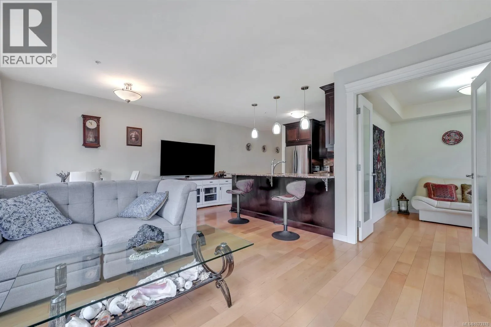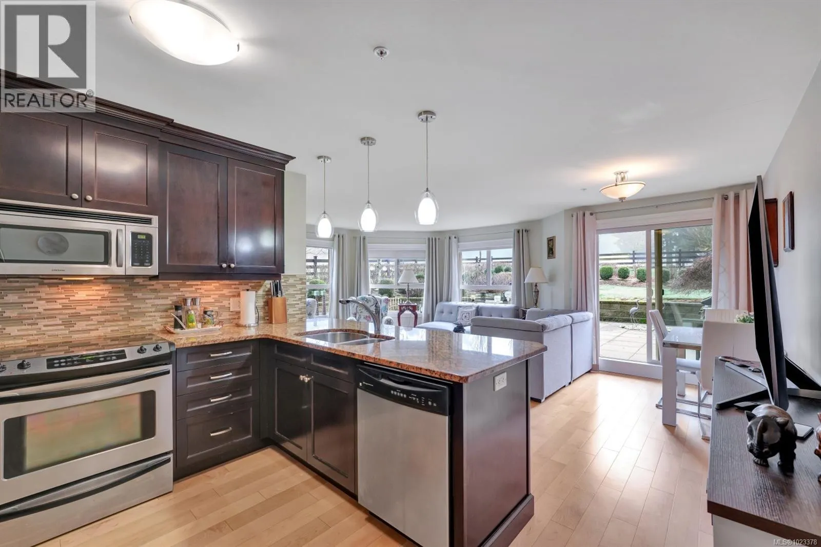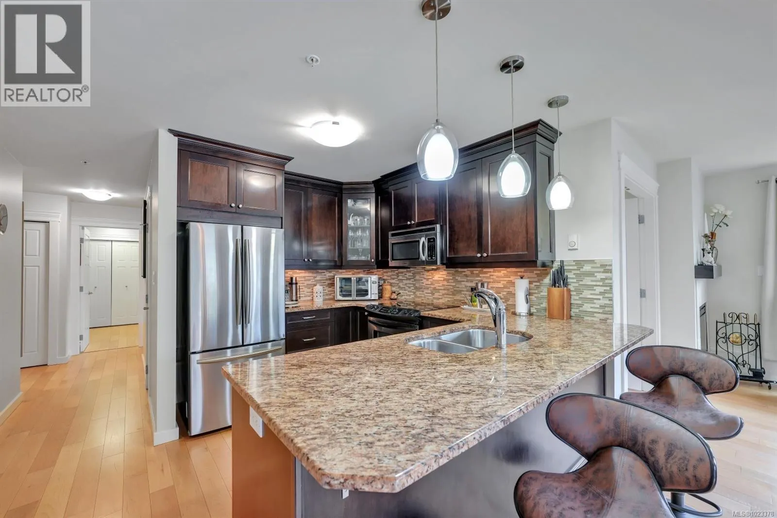 Welcome to this beautifully maintained 2 bedroom, 2 bathroom condo with a bonus den and an impressive 20â x 21â walk-out patio, perfect for outdoor living. Located in one of North Nanaimoâs most desirable and well-managed 55+ complexes, this home offers a convenient and comfortable lifestyle. The open-concept layout features a bright living room with an accent fireplace, a spacious kitchen with stainless steel appliances, and excellent flow throughout. Enjoy proximity to parks, the ocean, transit, and major amenities including Woodgrove Centre, Costco, and popular restaurants. The complex offers a welcoming clubhouse for residents to relax and socialize. Includes underground parking and a storage locker. New hot water tank installed in 2025. Dogs and cats permitted with size and number restrictions. All measurements are approximate and should be verified if important. (id:27476)