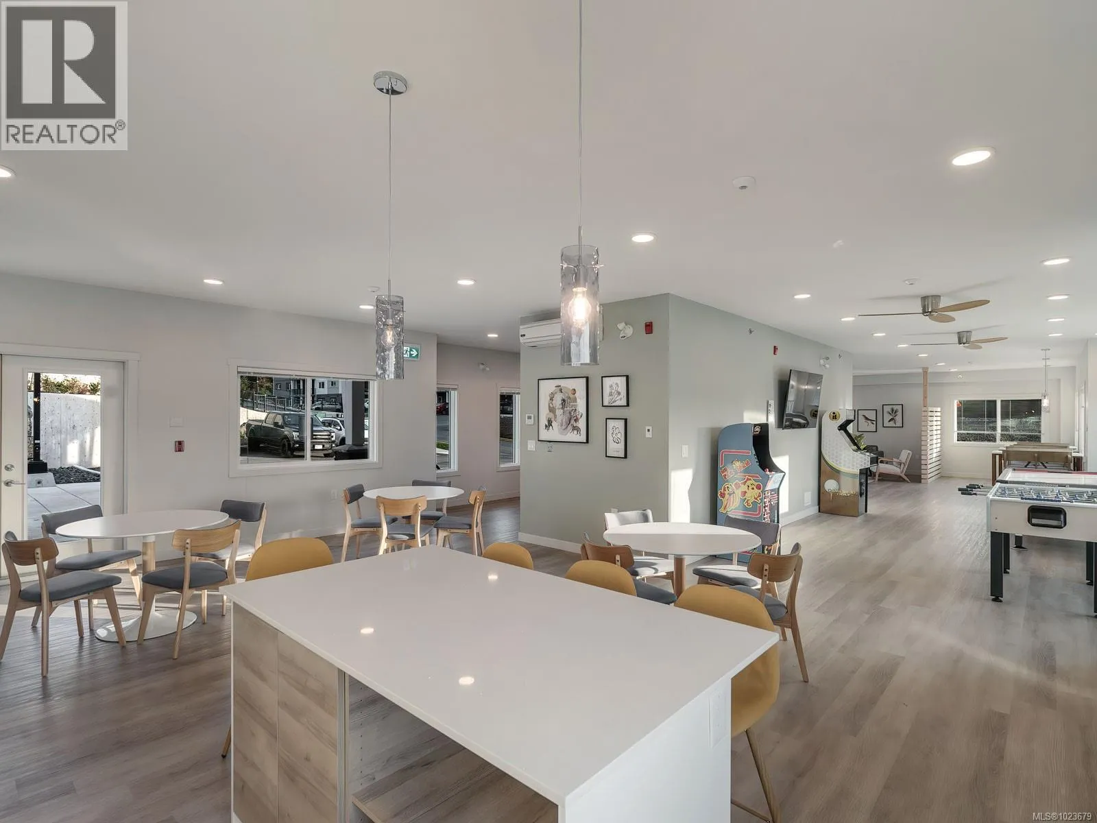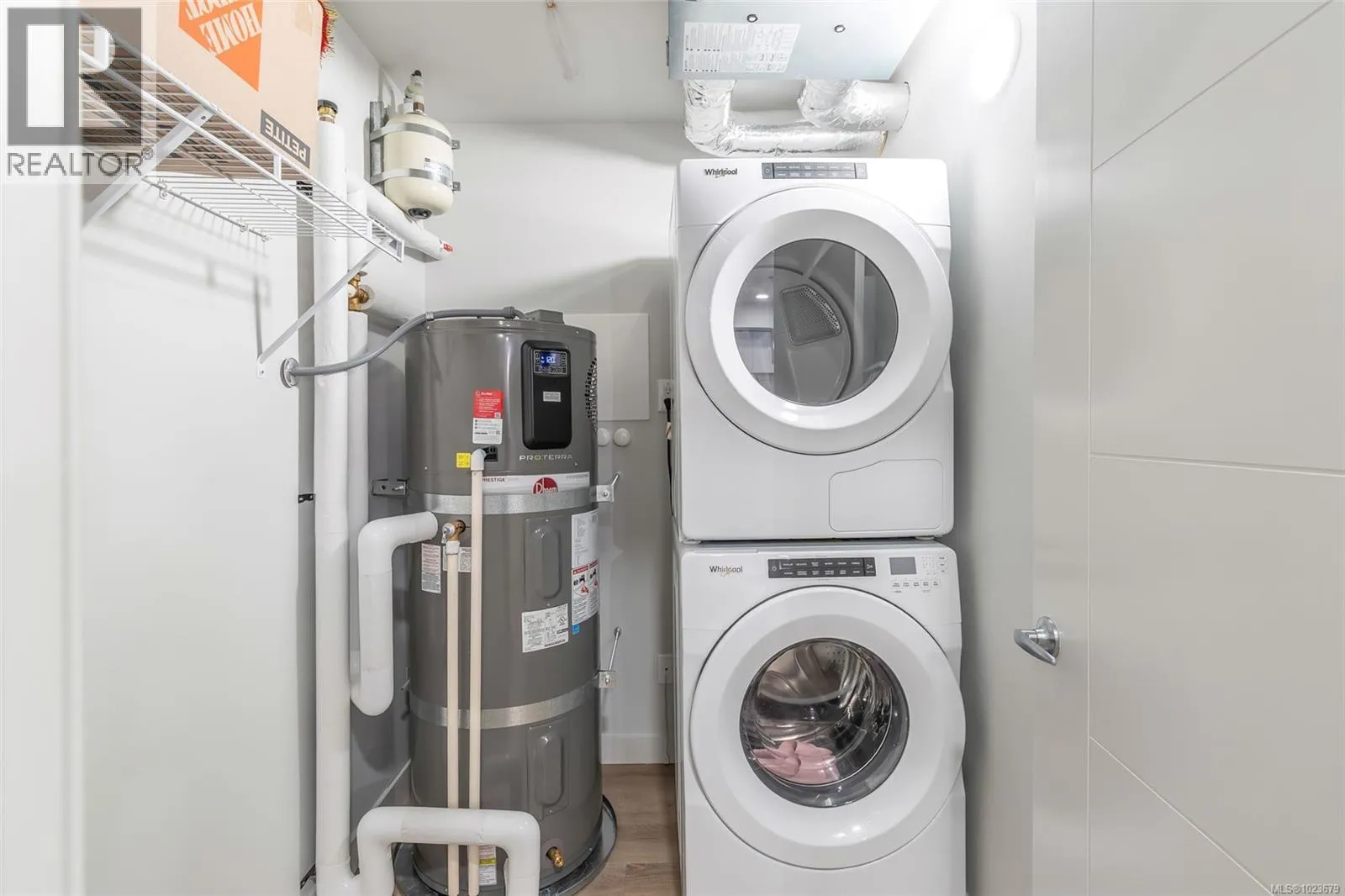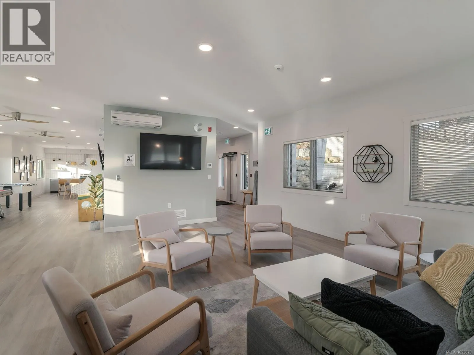 This TOP-FLOOR 1-bed, 1-bath unit at Lakeview Terrace is nestled in a private part of the complex with peaceful views of the wooded backdrop. The gourmet kitchen boasts quartz countertops, S/S appliances, a spacious island & tile backsplash. The primary bedroom features a walk-in closet with easy access to the 4-piece main bath. Designed for sustainability, this home is BUILT GREEN® with triple-pane windows, solar panels, an HRV system, heat-pump hot water tank, ensuring lower strata fees & utility costs. The unit comes with 1 underground parking stall along with a bike storage locker. Residents enjoy access to an impressive clubhouse, complete with a gym & yoga area, a community lounge, and a full kitchen space. Ideally located in North Nanaimo, this unit is steps from Long Lake, walking trails, and transit routes, with Nanaimo North Town Centre within walking distance. Potential eligibility for CMHC rebate (Buyer to verify). Donât miss this opportunity â Reach out to Mitch Bussieres at 778-269-2052 or mitch@ycdhomes.com to schedule your viewing. (id:27476)