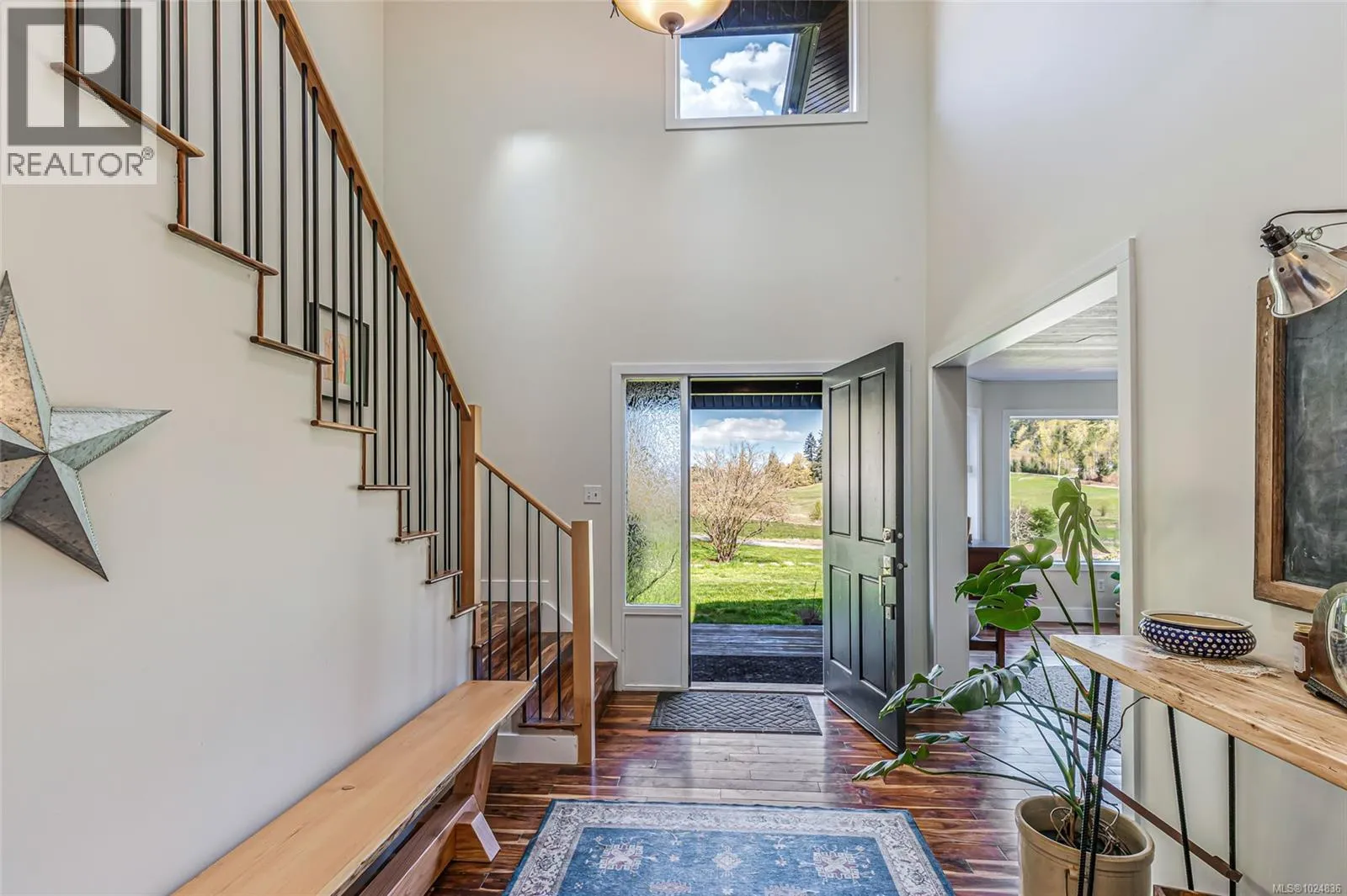 Discover this beautifully renovated, spacious custom farmhouse perfect for modern living and multi-generational families. The home features a main-floor primary suite, five additional bedrooms upstairs, and two convenient laundry roomsâone on each level. High-end acacia wood floors and an open-concept design create a warm, inviting atmosphere for entertaining. Recent updates include a new roof, siding, and more. Set on 31.5 acres of productive farmland, it offers hay fields, fruit and hazelnut trees, and 3+ acres of prime soil for blueberries or other crops. The long driveway leads to a private, mostly level meadow with a gentle rise to the westâideal for horses or livestock. Excellent water quality from a drilled well and a pond suitable for trout farming add to the farmâs appeal. Located near schools, shopping, and just 12 minutes from Nanaimo. (id:27476)