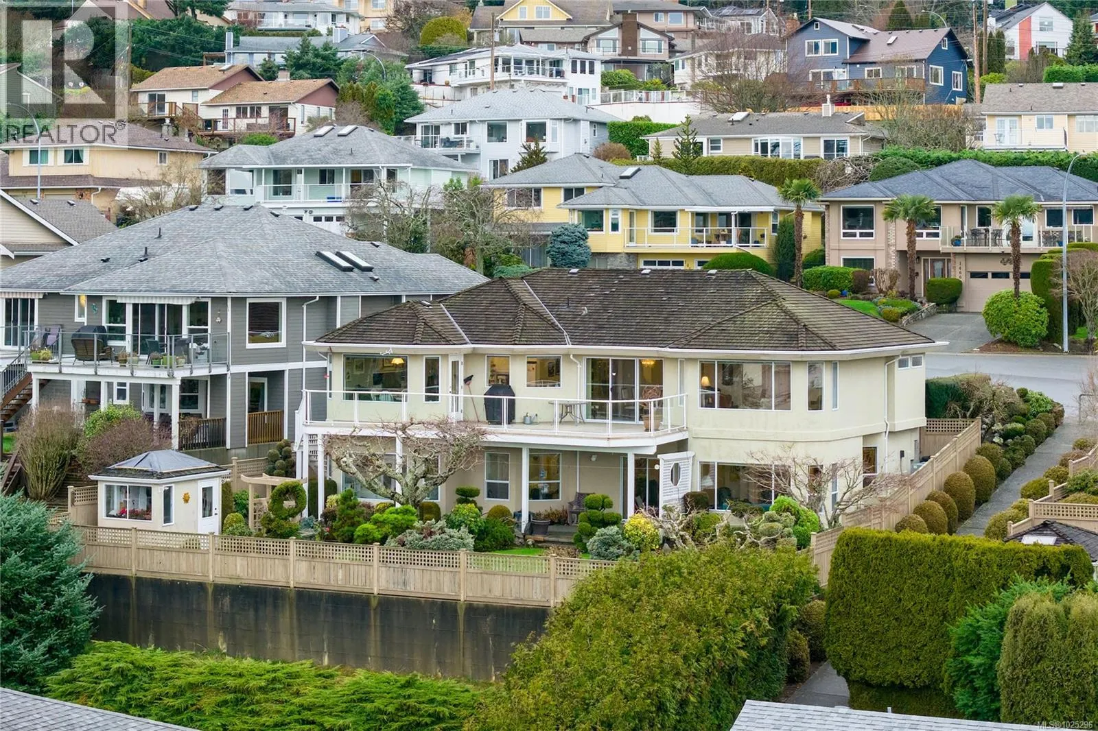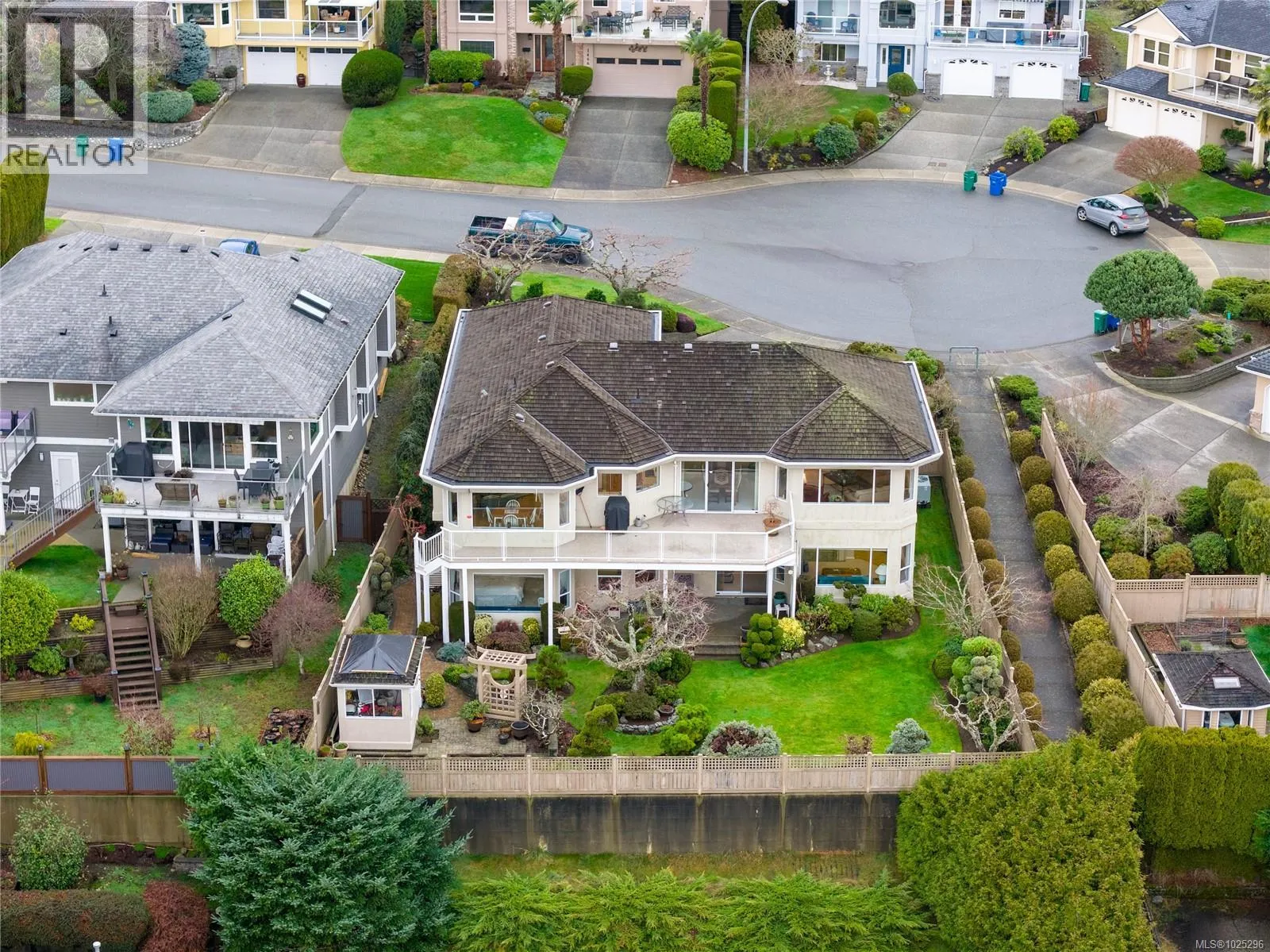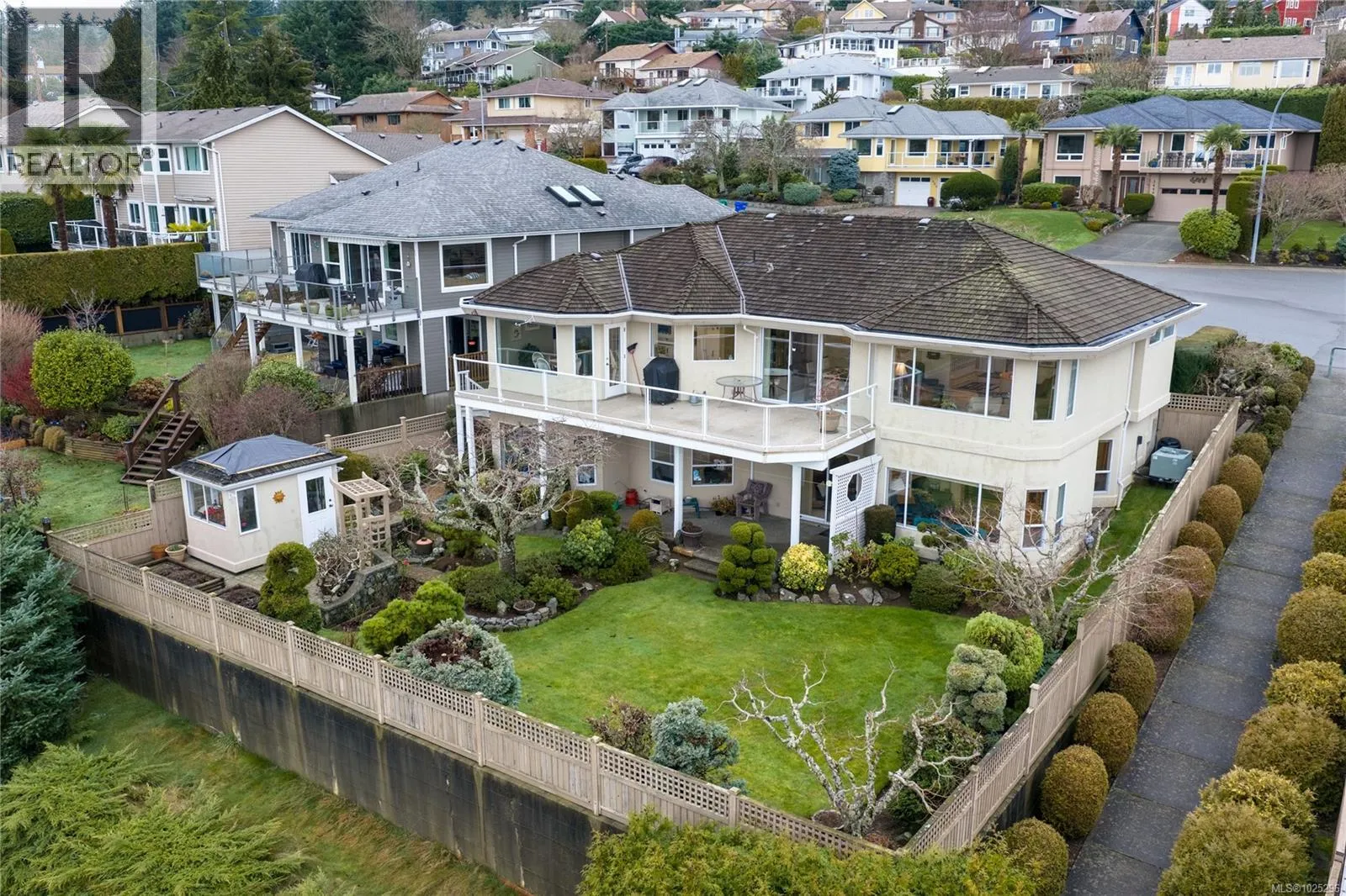 Tucked away on a desirable cul-de-sac, this immaculate one-owner home offers southern exposure and ocean views over Departure Bay. The back deck has stairs to a park-like backyard with covered patio, gardens and detached shed. The kitchen enjoys bay views and features a wall oven, eating bar, plus an adjoining nook and family room with gas fireplace. Thoughtfully designed to maximize views, the separate living and dining room enjoys sweeping vistas. The main level includes a primary bedroom with walk-in closet and three-piece ensuite, a second bedroom and four-piece bathroom. The fully finished walk-out lower level offers a family room and rec room with a double-sided fireplace, two bedrooms with window benches, a three-piece bathroom, laundry and storage. Added features include hardwood flooring and heat pump. Just a short walk to beach access and Linley Valley hiking trails. For more info see the feature sheet. All data and measurements are approx and must be verified if fundamental. (id:27476)