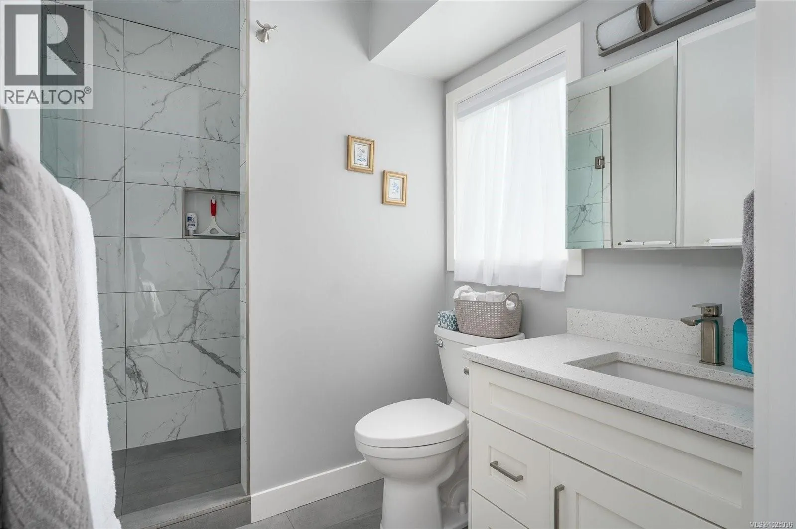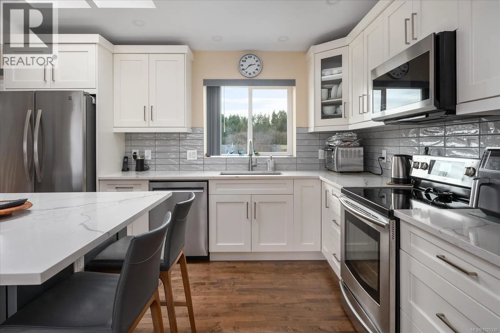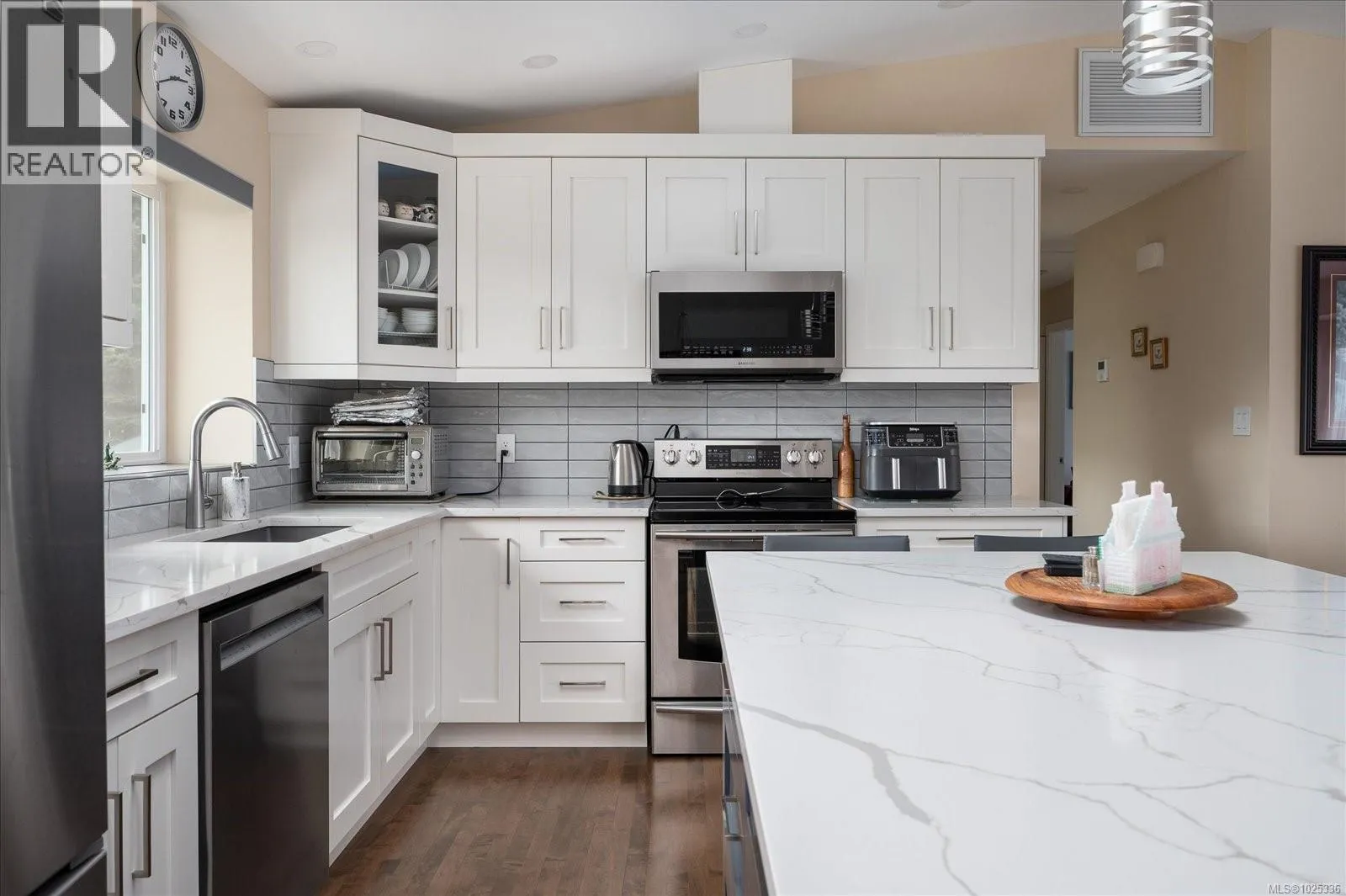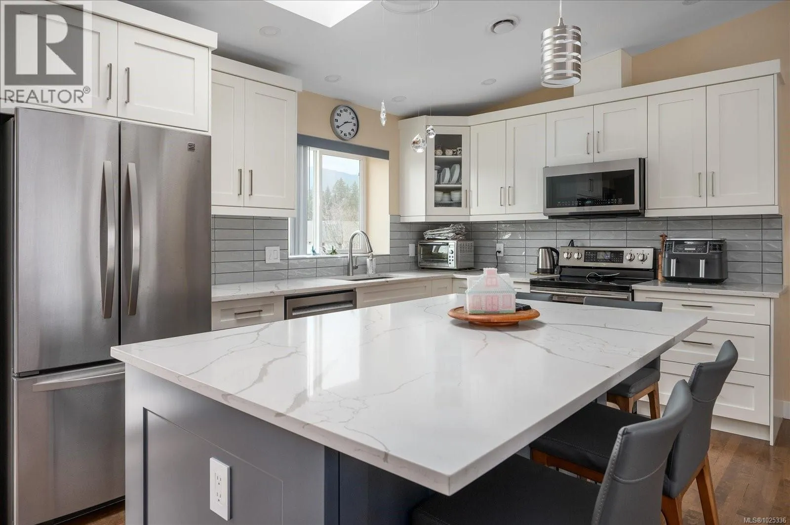 This immaculate home is 1881 sq. ft. of fabulous living space with 3 bedrooms & 3 bathrooms, located in the desirable Diver Lake Area. The main level features the living room with a large bay window allowing an abundance of natural light, providing a very bright & airy ambience. The dining area is perfect for family dinners & features a sliding glass door to take you to your beautiful deck overlooking your backyard with mountain views, providing a wonderful outdoor space for you to relax and enjoy. The kitchen has stylish, soft close cabinets, tiled backsplash, quartz counter tops with lots of counter area for the convenience of plenty of workspace, an island/eating bar, & stainless steel appliances. To complete the main level of this home, you will find the primary bedroom with a stunning 3 piece ensuite with quartz counter top, heated tile floors, walk in custom shower with heated shower floor, towel racks with pop out hooks for hanging your bath robe or bath towels as well as 2 additional bedrooms and a 4 piece bathroom. Downstairs has a 3 piece bathroom, large rec room with a pellet stove that provides such a cozy warmth & a separate area for a home office, exercise area or adding a fourth bedroom. The functional laundry room has a newer washer/dryer, sink, built in cabinets & storage area. Pride of ownership is very evident in this wonderful family home that is located in a great neighborhood, situated on a quiet street. Bonus features include newer hot water tank, sky lights, garage door, light fixtures, wiring, bathroom fans, awning on back deck & sprinkler system. The back yard offers a fully fenced yard, patio area and a garden shed with a newer roof, perfect for your outdoor storage. This is such a fabulous location close to shopping, parks, walking trails, restaurants, coffee shops, recreation facilities, bus route, all levels of schools and all City of Nanaimo amenities. (id:27476)