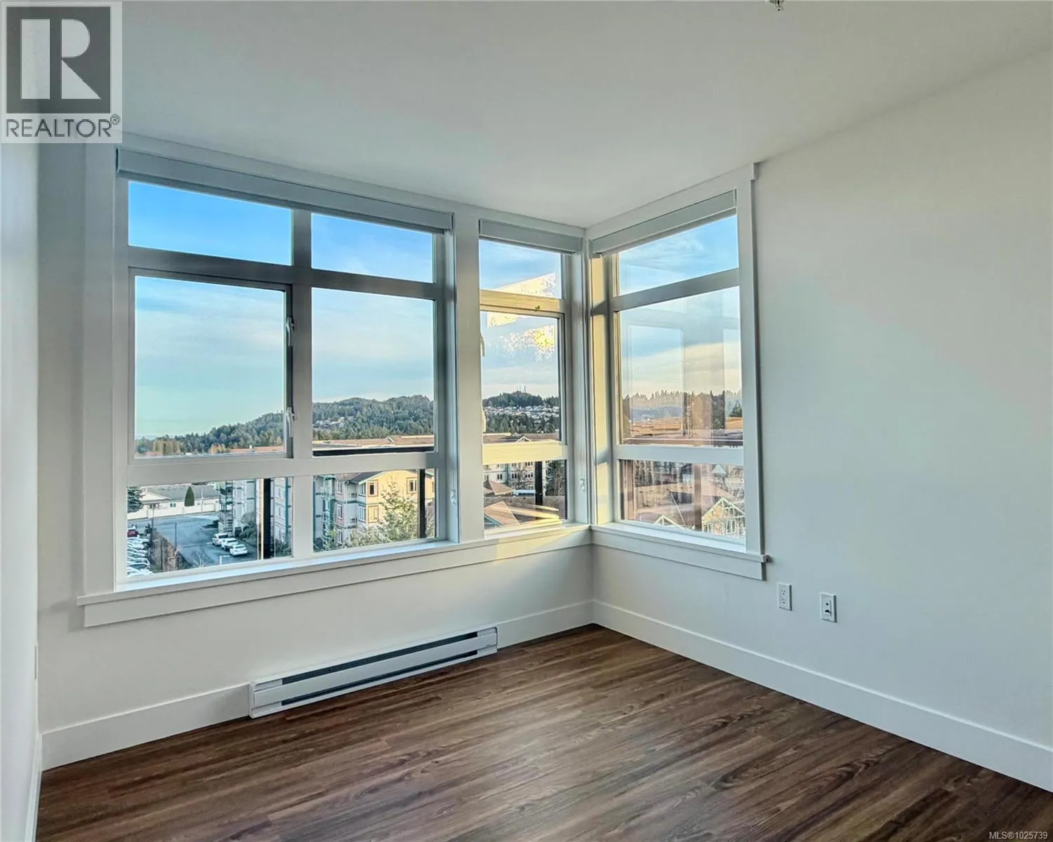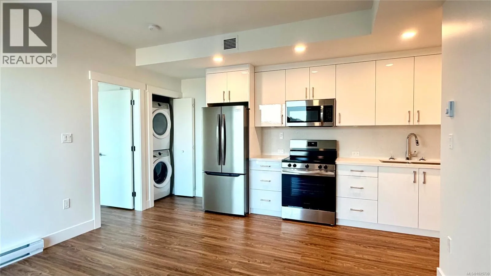Prestige 1-bedroom corner suite on the 5th floor at The MINTâbrand new North Nanaimo condosâfeaturing sweeping 270° ocean, mountain, and city views from expansive corner??. This bright, modern home offers an open-concept kitchen with quartz countertops and an American-made Frigidaire appliance package, plus in-suite Electrolux front-load stacked washer/dryer. Enjoy beautiful, top-quality laminate flooring throughout, a spacious bedroom with corner windows for abundant natural light, and a walk-in closet. The stylish bathroom showcases a full-height tile tub surround and quartz vanity for a clean, upscale finish. Step outside to an extensive wrap-around balconyâperfect for relaxing, entertaining, and soaking up sunny days. Comfort and convenience continue with secure building entry, underground designated parking, and a storage locker. Unbeatable location next to Costco, across from Woodgrove Centre, and close to schools, transit, and everyday amenities. Ideal for first-time buyers, small families, or smart investors. (id:27476)