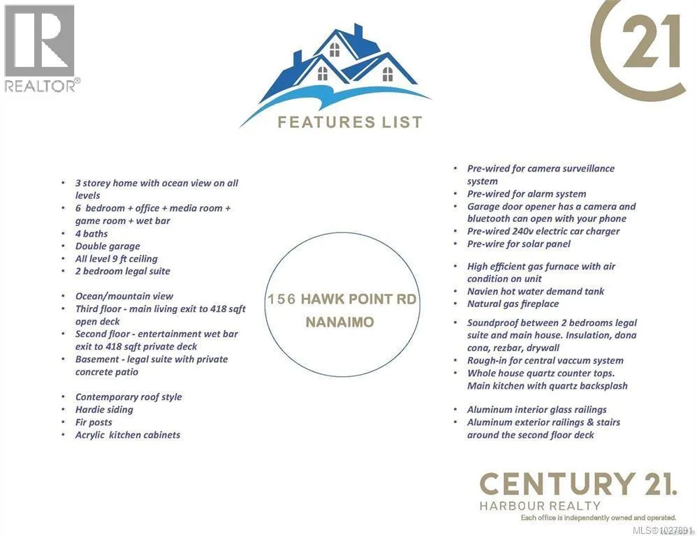 Pre-build 3-story home, where luxury meets breathtaking views of the ocean and mountains on every level. This home offers 6 spacious bedrooms and 4 bathrooms. The basement includes a fully equipped legal suite with its own private concrete patio. The main floor is an entertainerâs dream, featuring a dedicated office, cozy media room, game room, lounge area, and a stylish wet bar. The upper floor is the open concept of the living/dining/kitchen. All levels feature 9-foot ceilings and an open balcony/patio, perfect for entertaining or relaxing while taking in the panoramic views. This contemporary home is adorned high-end finishes, with hardy siding, durable fir posts, acrylic kitchen cabinets, and aluminum railings. Main kitchen boasts quartz countertops and a stylish backsplash. Additional features are soundproofing between the legal suite and main house, a Navien gas HWT on demand. Can't be describe in one whole paragraph please see supplements and photos for the features list. (id:27476)