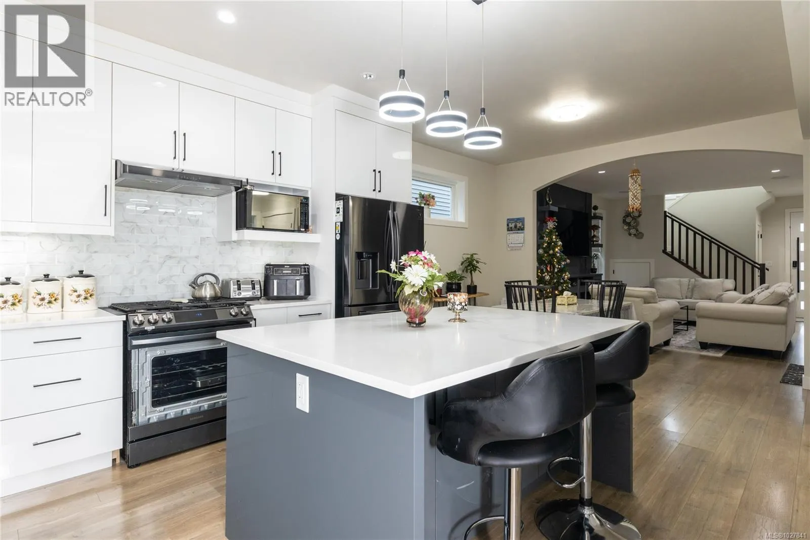 Located in a popular neighbourhood, this well-designed 4 bedroom, 3 bathroom home combines modern finishes with a practical layout suited for everyday living, with the added comfort of a heat pump providing efficient heating and cooling. Hardwood flooring runs through the main level, where a bright living area with large windows and an electric fireplace creates a comfortable central gathering space. The kitchen is thoughtfully arranged with crisp white cabinetry, stainless steel appliances, stone countertops, and a large island that offers both additional workspace and casual seating. Also on the main floor is a versatile fourth bedroom with custom built-ins, ideal as a home office or guest room, along with a stylish bathroom featuring a glass rainfall shower and contemporary tile. Upstairs, a spacious bonus room provides a second living area perfect for a media room or family lounge. The primary bedroom includes a walk-in closet and its own ensuite, while two additional bedrooms are served by a full bathroom with a tub and shower combination. A large laundry room with plenty of storage adds everyday convenience. The backyard is fully fenced, flat, and easy to maintain, with a patio space that works well for relaxing or hosting friends. A garage adds practical storage and parking, rounding out this clean, move-in ready home. (id:27476)