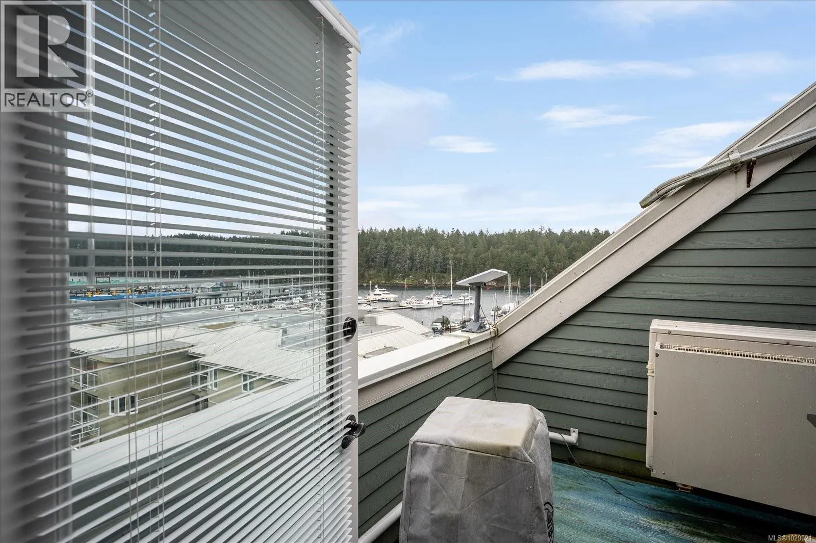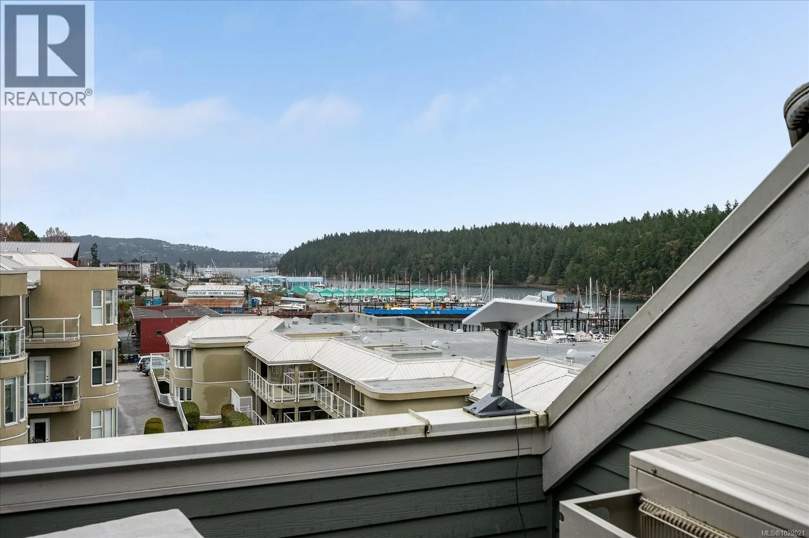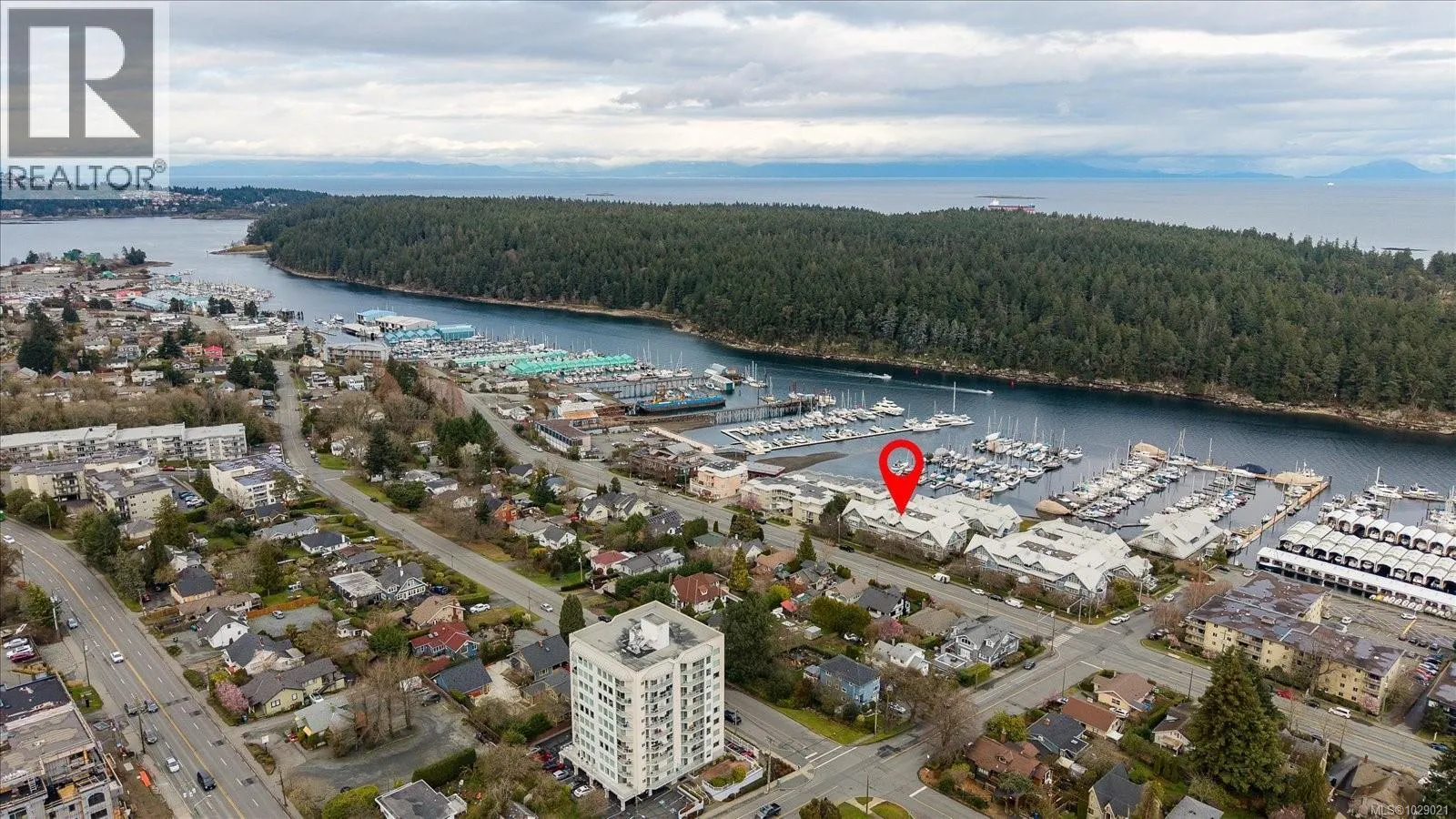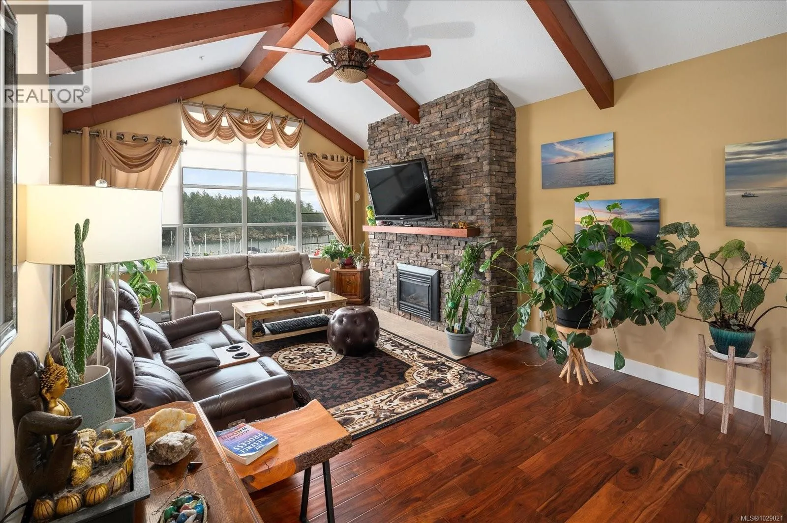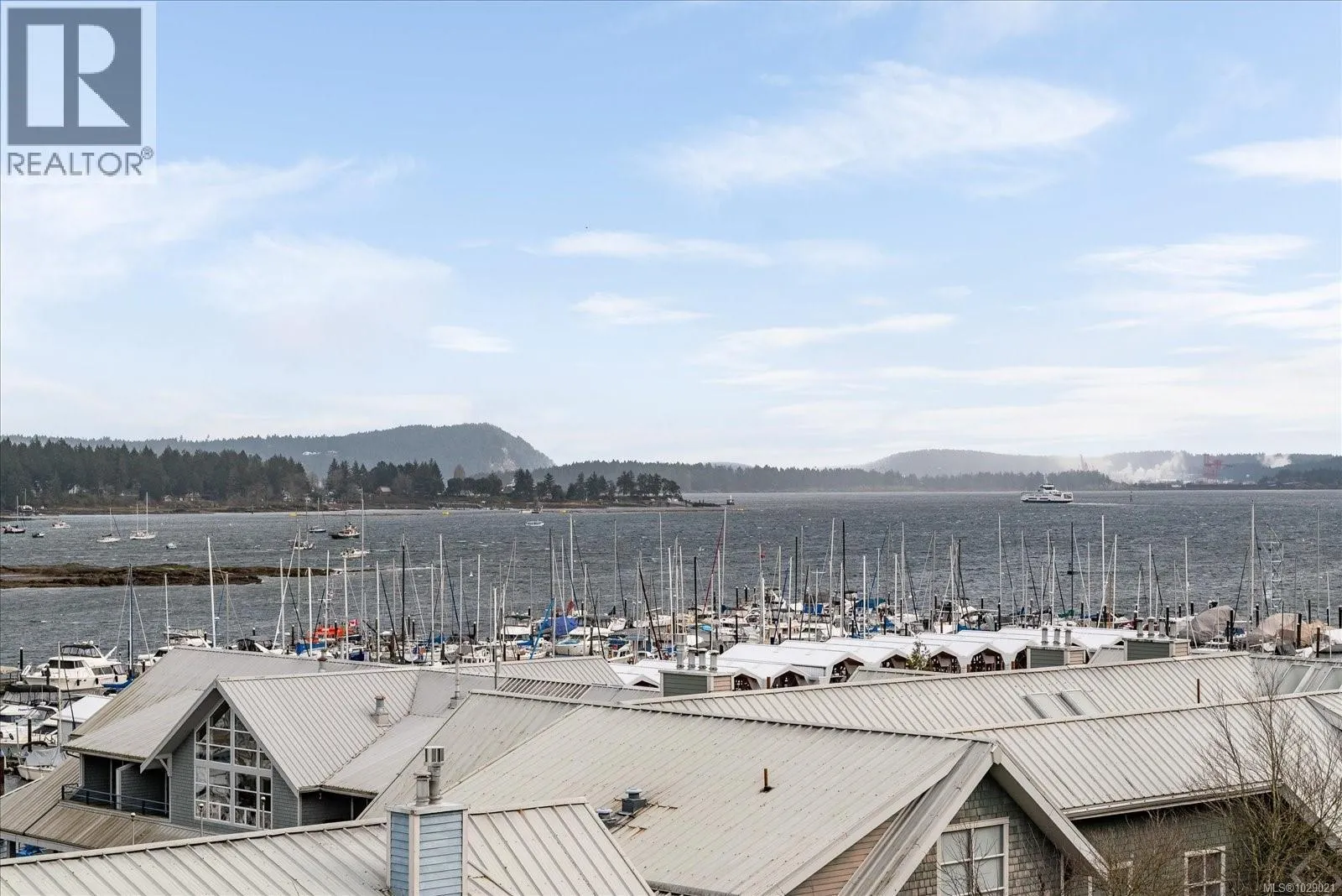 Perched on the top floor, this rare penthouse offers breathtaking 180° ocean views stretching across Nanaimo Harbour and Newcastle Channel. Fully renovated with meticulous attention to detail, this 2-bedroom plus den residence blends refined West Coast style with modern luxury and comfort. From the moment you enter through the grand arched foyer, the home impresses with soaring cathedral ceilings highlighted by exposed fir beams, creating a sense of warmth and architectural character. Expansive windows flood the open-concept living spaces with natural light while perfectly framing the ever-changing coastal scenery from nearly every main room. The chef-inspired kitchen has been thoughtfully designed for both entertaining and everyday living, featuring elegant quartz countertops, premium stainless appliances, custom millwork, and a spacious walk-in pantry. Convenient access to the deck invites seamless indoor-outdoor living, making it the perfect place to enjoy morning coffee or evening meals while taking in spectacular harbour views. The primary suite offers a true retreat, complete with a spa-like ensuite featuring a deep soaker tub, quartz vanity, dedicated makeup station, and beautifully crafted custom cabinetry. Throughout the home, rich acacia hardwood flooring adds warmth and durability, while a stone-accented gas fireplace with a solid fir mantel creates a stunning focal point in the living room. A high-efficiency ductless heat pump with air conditioning ensures year-round comfort in every season. Ideally located just steps from the waterfront walkway, marinas, and the vibrant charm of Nanaimo's coastal lifestyle, this exceptional penthouse combines luxury, location, and panoramic ocean views in one remarkable offering. Measurements are approximate; buyers should verify if important. (id:27476)