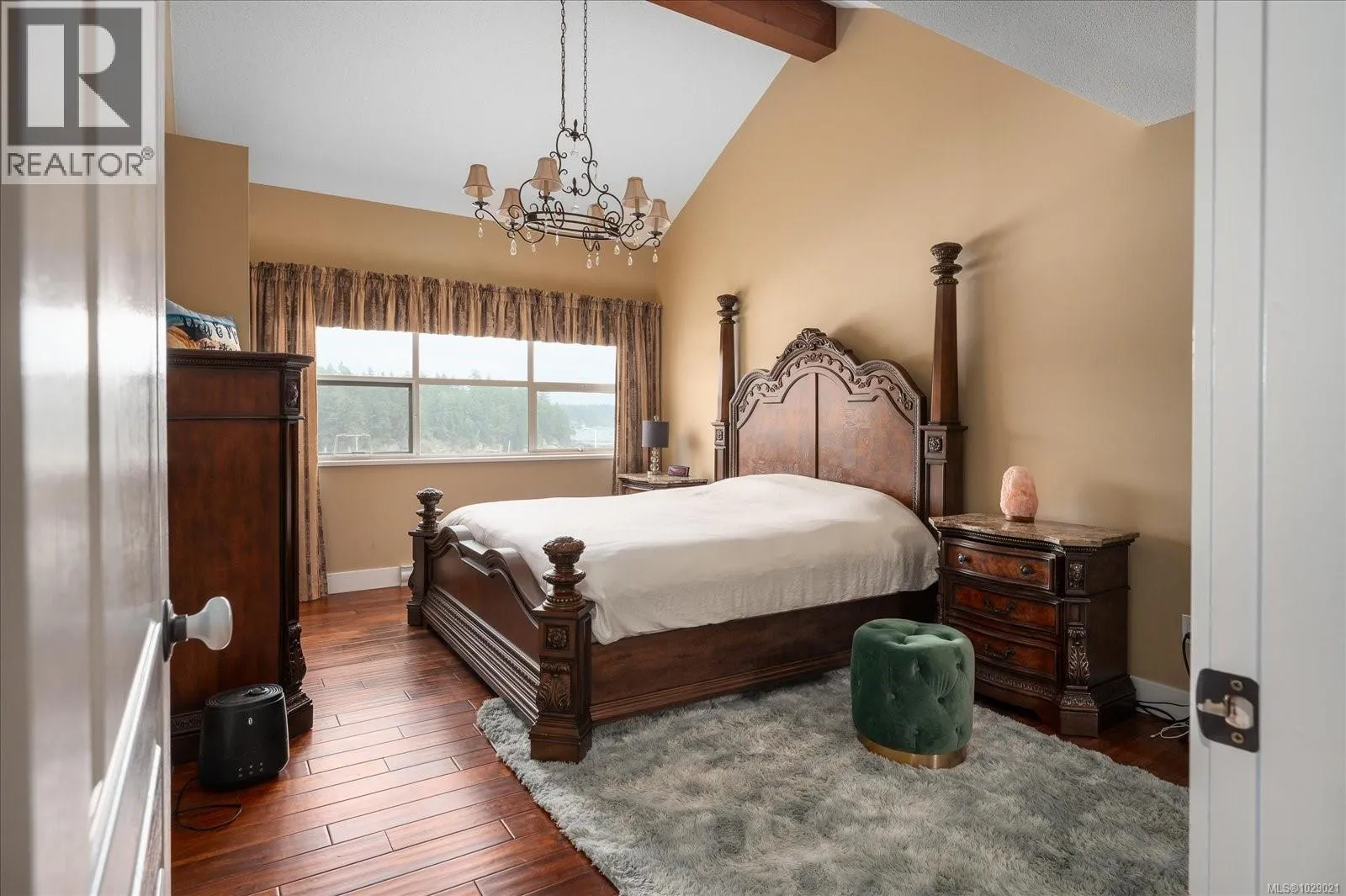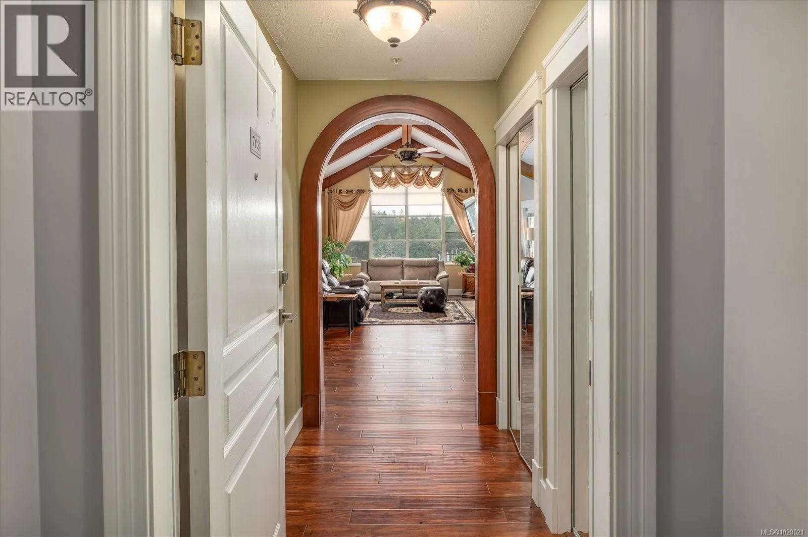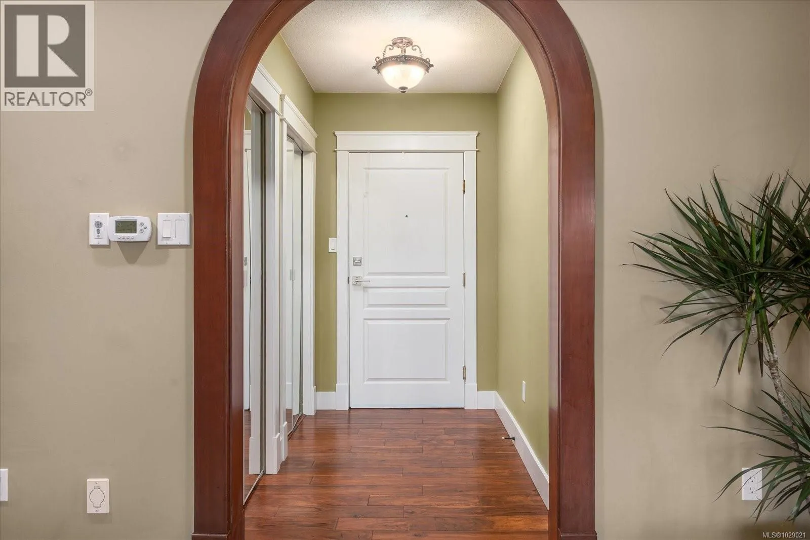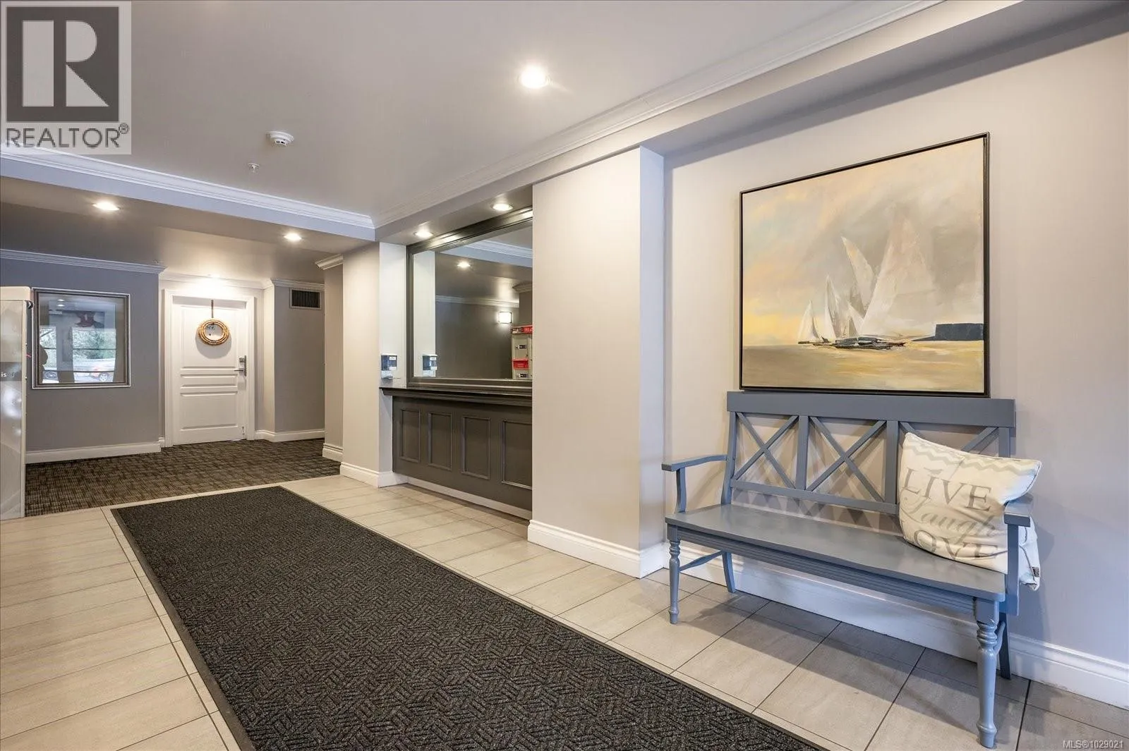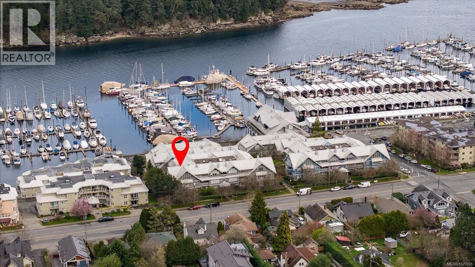 Perched on the top floor, this rare penthouse offers breathtaking 180° ocean views stretching across Nanaimo Harbour and Newcastle Channel. Fully renovated with meticulous attention to detail, this 2-bedroom plus den residence blends refined West Coast style with modern luxury and comfort. From the moment you enter through the grand arched foyer, the home impresses with soaring cathedral ceilings highlighted by exposed fir beams, creating a sense of warmth and architectural character. Expansive windows flood the open-concept living spaces with natural light while perfectly framing the ever-changing coastal scenery from nearly every main room. The chef-inspired kitchen has been thoughtfully designed for both entertaining and everyday living, featuring elegant quartz countertops, premium stainless appliances, custom millwork, and a spacious walk-in pantry. Convenient access to the deck invites seamless indoor-outdoor living, making it the perfect place to enjoy morning coffee or evening meals while taking in spectacular harbour views. The primary suite offers a true retreat, complete with a spa-like ensuite featuring a deep soaker tub, quartz vanity, dedicated makeup station, and beautifully crafted custom cabinetry. Throughout the home, rich acacia hardwood flooring adds warmth and durability, while a stone-accented gas fireplace with a solid fir mantel creates a stunning focal point in the living room. A high-efficiency ductless heat pump with air conditioning ensures year-round comfort in every season. Ideally located just steps from the waterfront walkway, marinas, and the vibrant charm of Nanaimo's coastal lifestyle, this exceptional penthouse combines luxury, location, and panoramic ocean views in one remarkable offering. Measurements are approximate; buyers should verify if important. (id:27476)