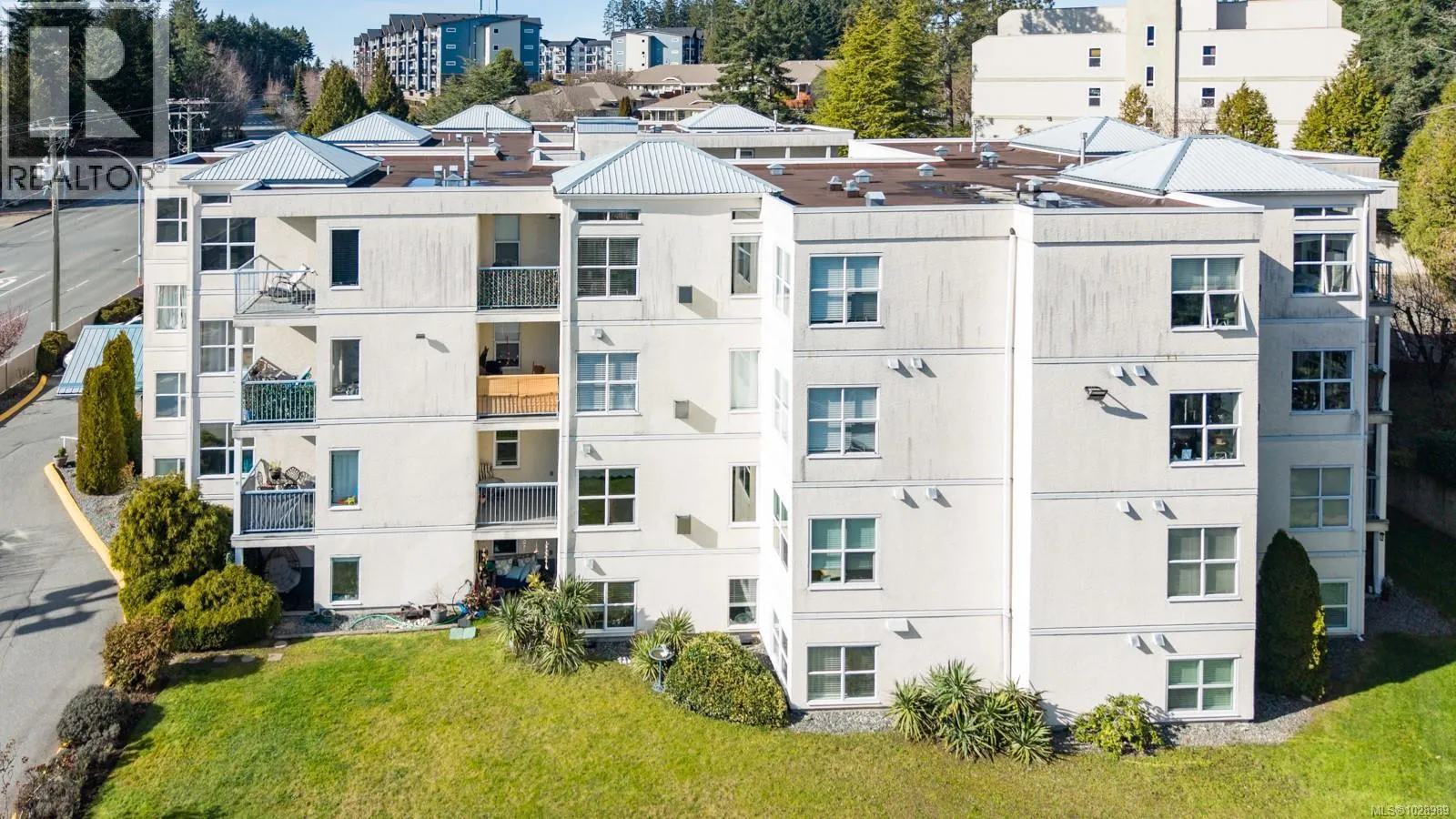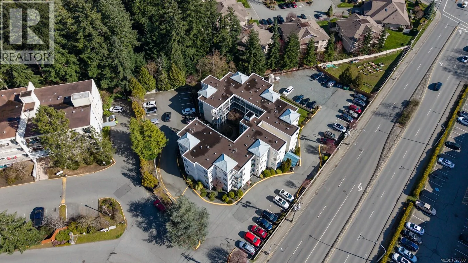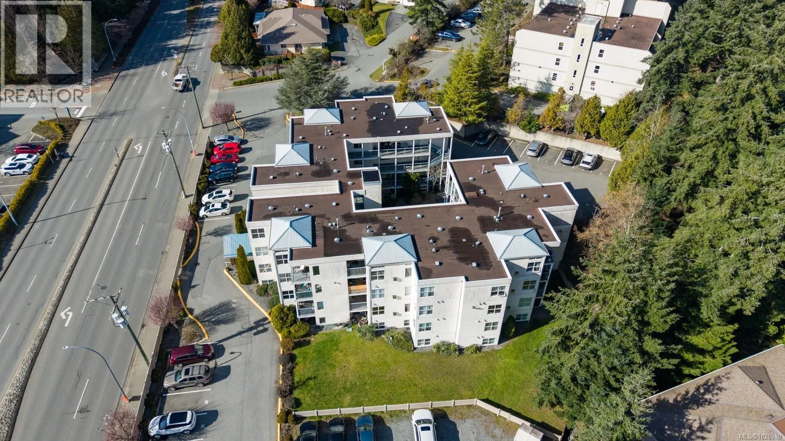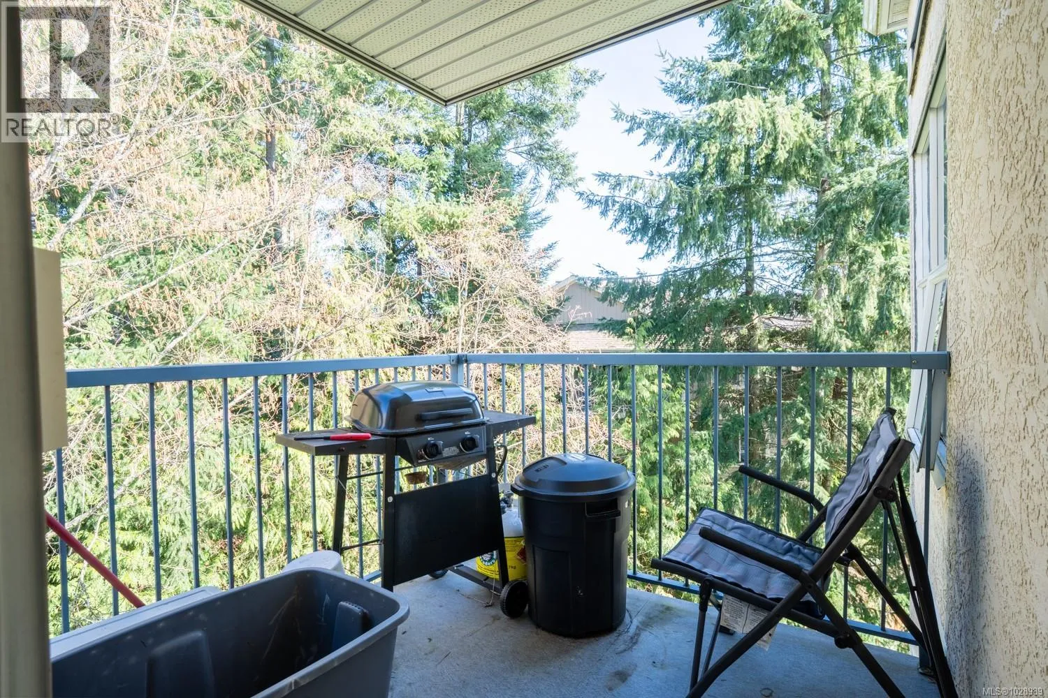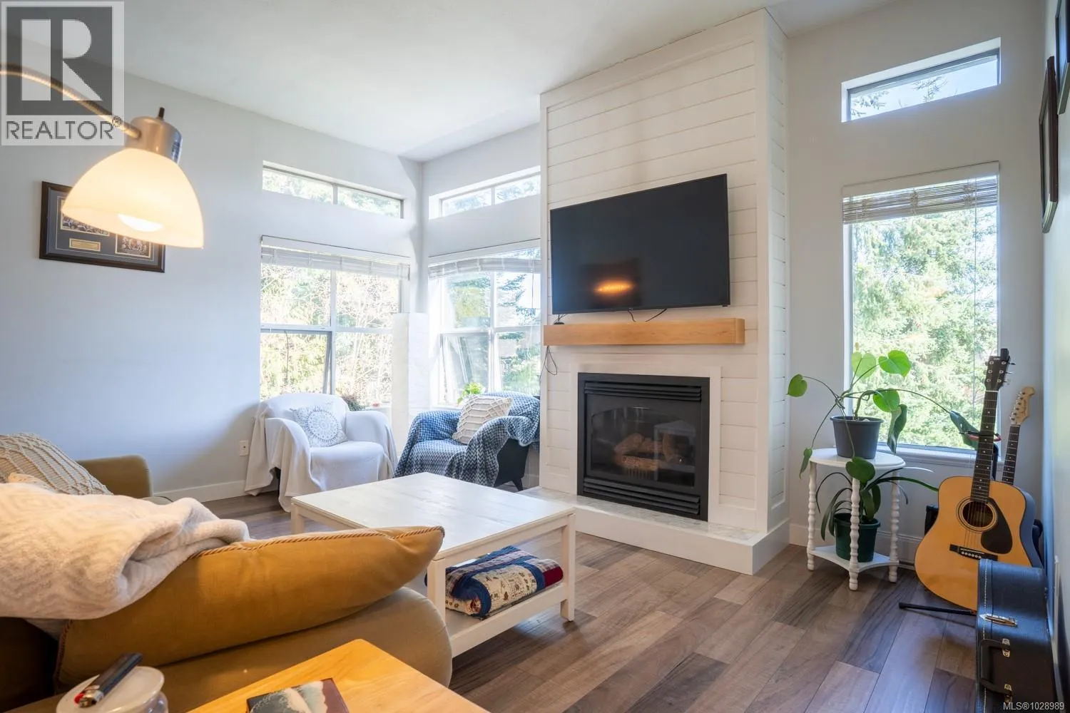 Stylish and sophisticated 2 bed, 2 bath condo in desirable North Nanaimo. This well-appointed 964 sq ft home is ideally located close to restaurants, shopping, schools, parks, and scenic nature trails. The open-concept layout connects the kitchen, dining, and living areas, creating a comfortable space for everyday living and entertaining. The beautifully renovated kitchen features custom cabinetry and modern finishes. The bright living room offers peaceful forest views and is anchored by a cozy natural gas fireplace with a marble mantle. Updated flooring and unique light fixtures add a modern touch throughout. The main 4-piece bathroom includes quartz countertops, a custom vanity, and updated tile work. The spacious primary bedroom features a walk-in closet and a private 3-piece ensuite. Enjoy the private balcony overlooking the trees, perfect for relaxing outdoors. In-unit laundry, a dedicated parking stall, and visitor parking are included. This pet-friendly building allows rentals and has no age restrictions, making it a great opportunity for homeowners or investors alike. Data and measurements are approximate and should be verified if important. (id:27476)