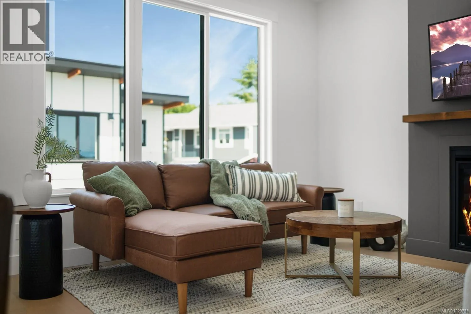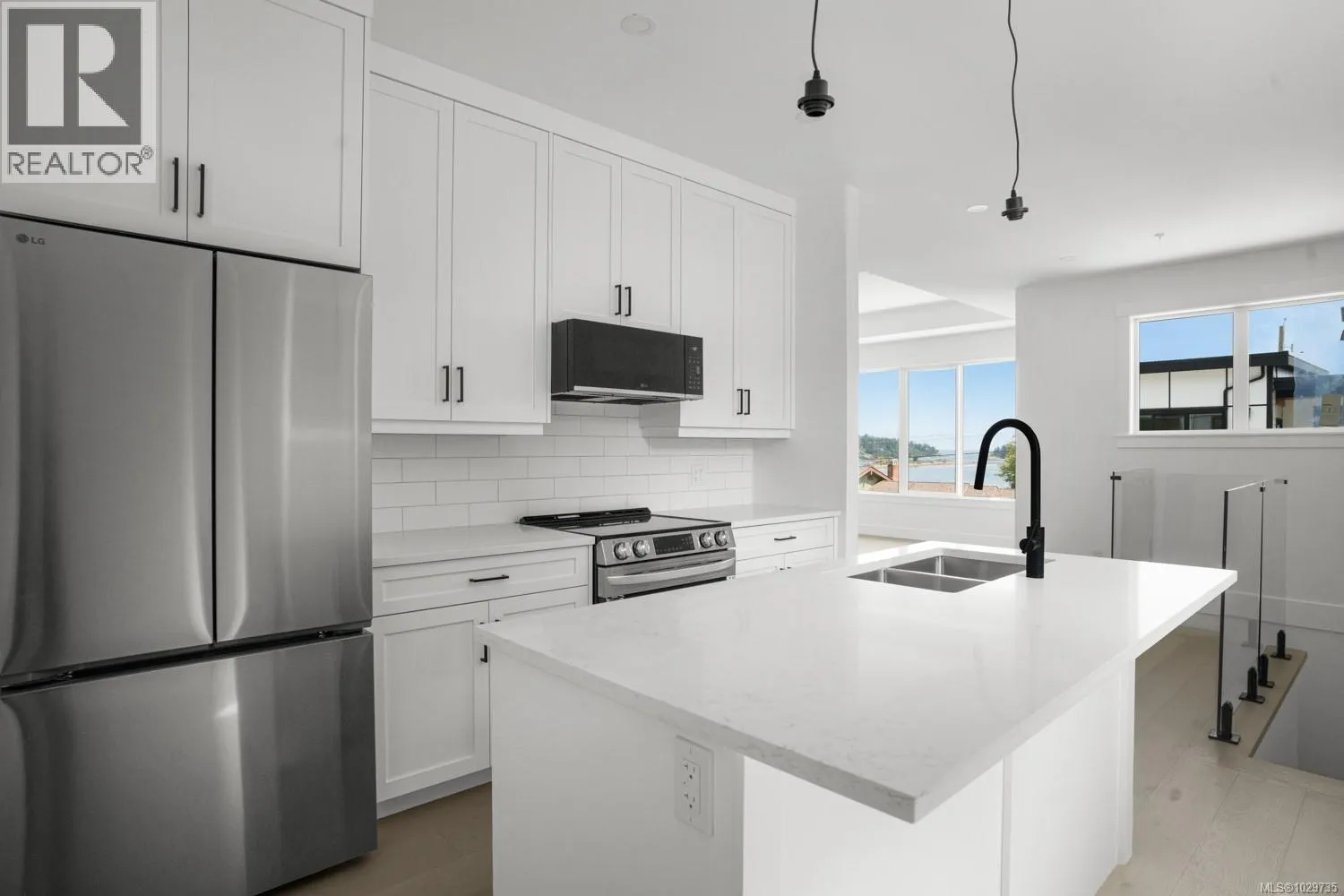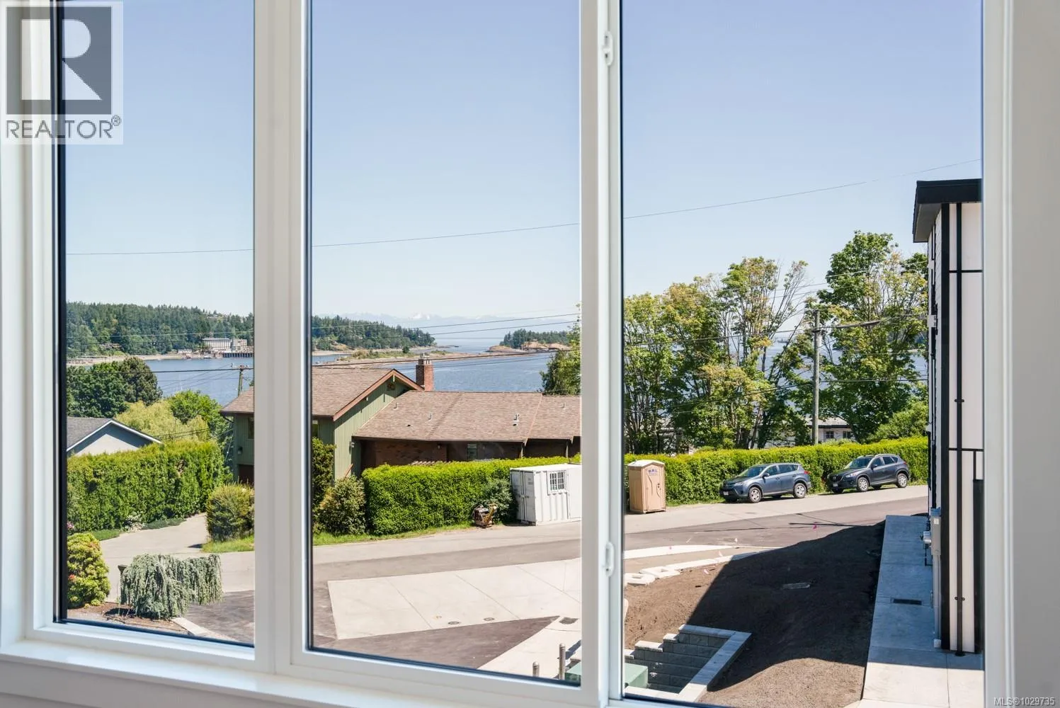 Welcome to Doctors Rd in beautiful Departure Bayâhome to this stunning new 5-unit luxury townhome complex with sweeping ocean and mountain views. This standalone unit is the crown jewel of the development. Upstairs, the main living space is bright and open, featuring engineered hardwood floors, a modern kitchen with stainless steel appliances, stone countertops, custom wood cabinetry, a cozy dining nook, and a welcoming living room with an electric fireplace and access to a covered private patio with gas BBQ hook up and a convenient 2-piece powder room. The spacious primary bedroom has its own second balcony overlooking Departure Bay, a walk-in closet with custom shelving, and a sleek 4-piece ensuite boasting heated tile floors, a custom tiled shower and high end fixtures. The entry floor offers two additional bedrooms, a stylish 4-piece bathroom, a laundry/storage room, and an attached 11'x25' garage w roughed in EV charger. Each unit additionally has: high efficiency gas furnace, A/C, high end closet organizers, hardi plank exterior, full landscaping. Price plus GST. (id:27476)