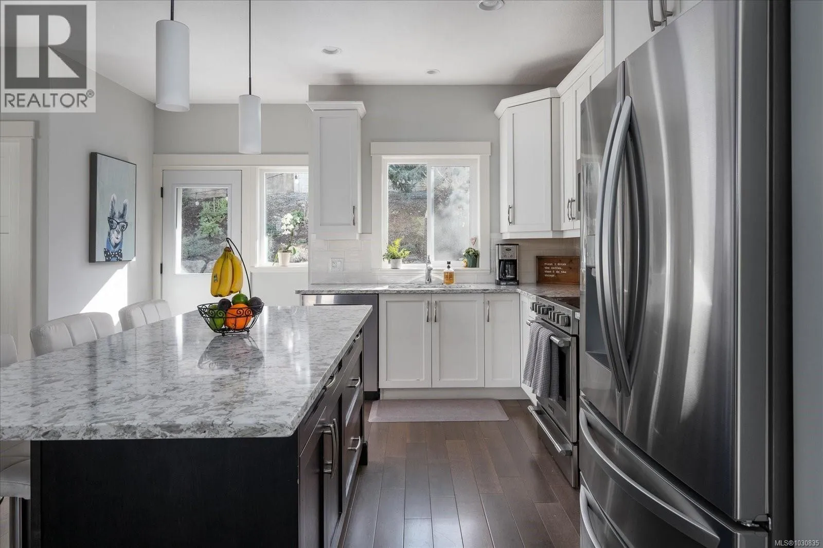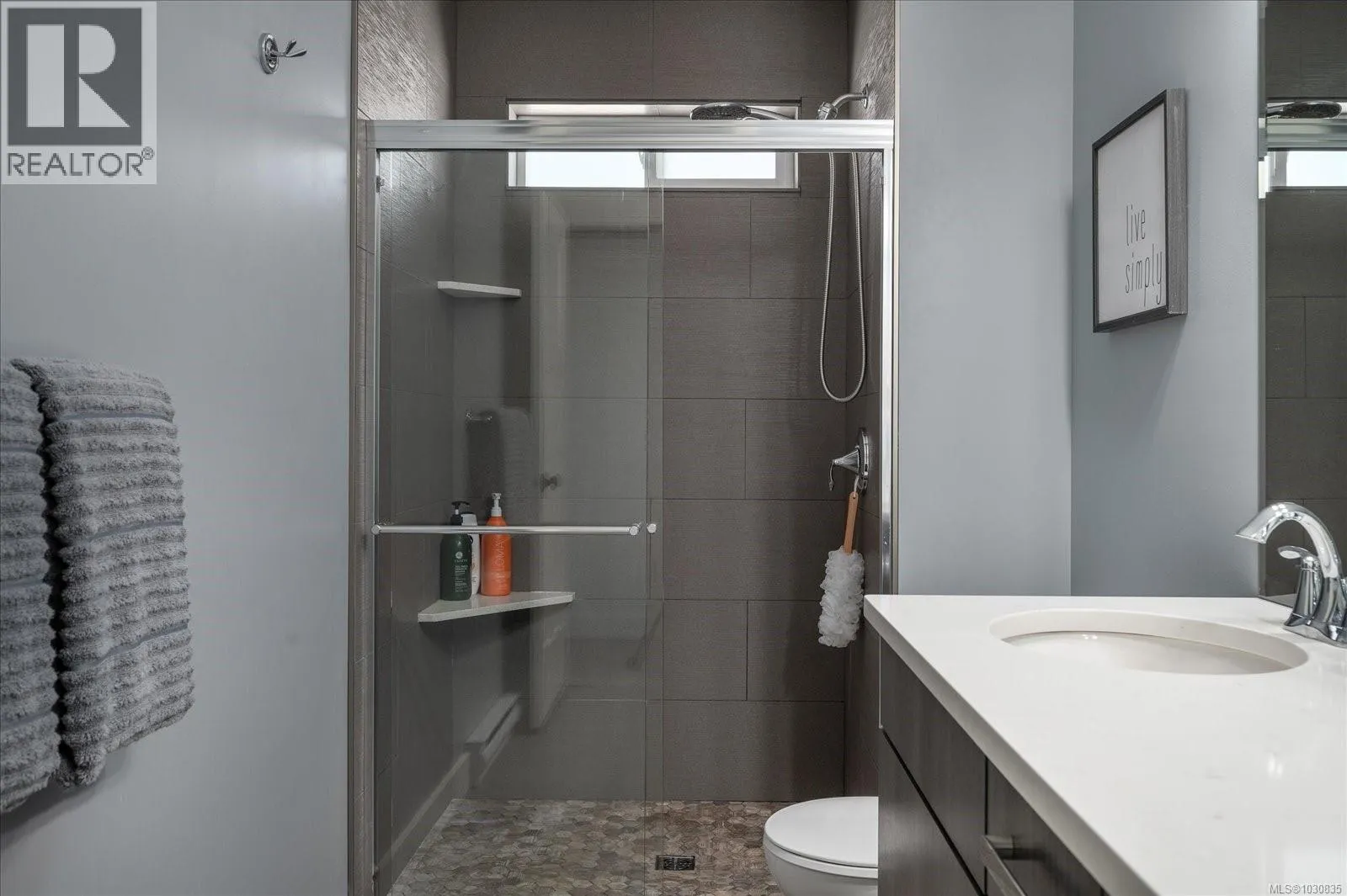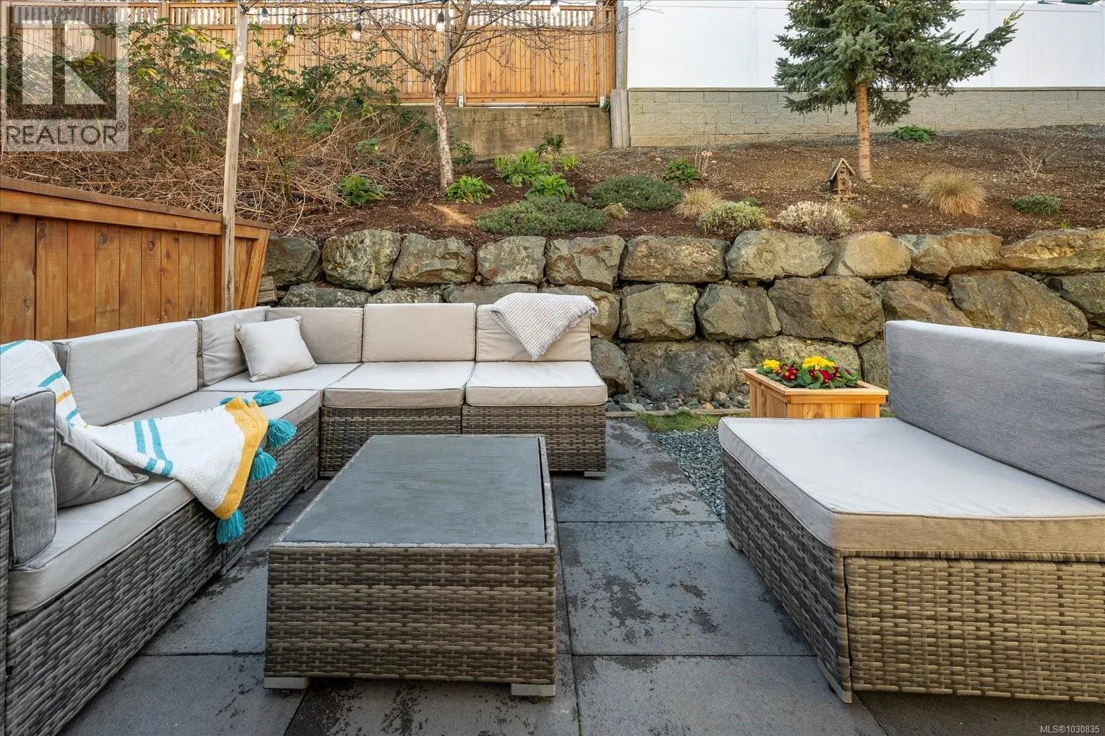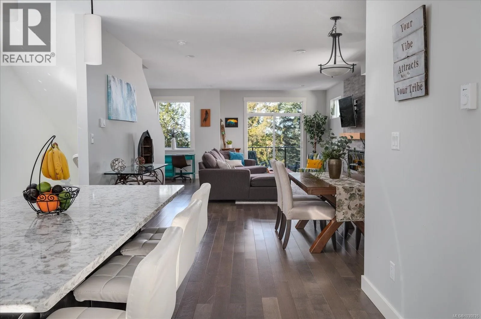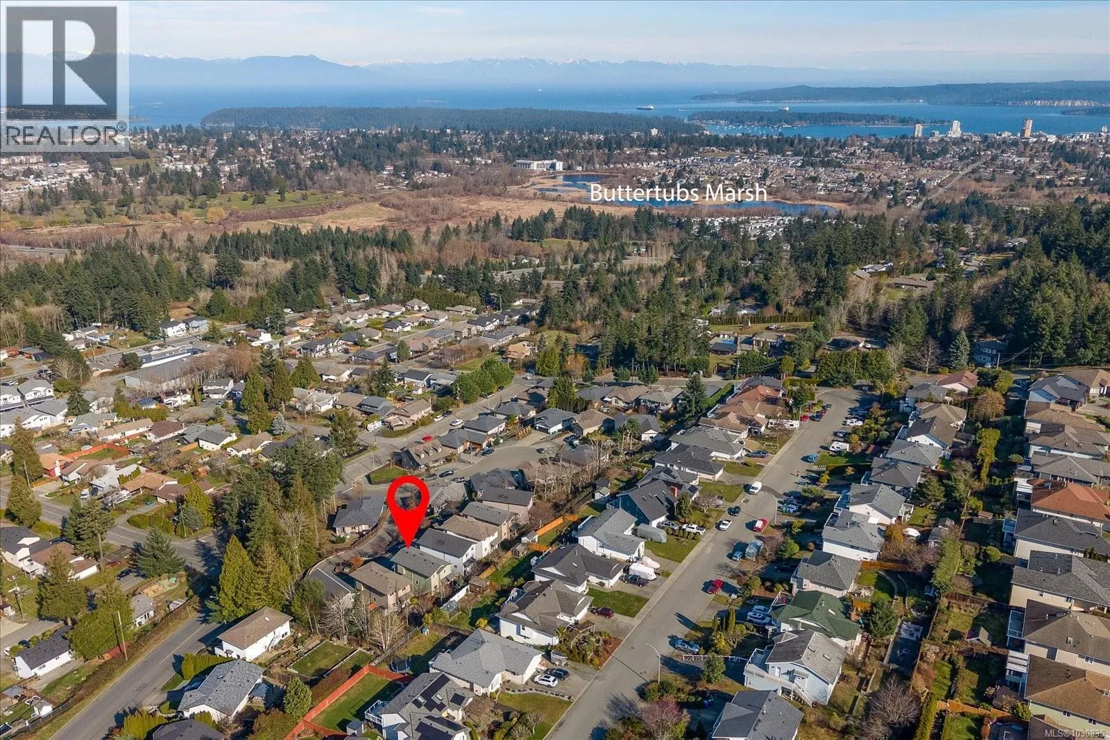 Fabulous detached and updated 3 level newer townhome! Like living in a single family home without any of the home owner hassles. The strata takes care of all exterior maintenance except your yard. Offering almost 2300 Sq.Ft. of living on 3 levels with no shared walls. The main floor offers a bright and airy great room with a large kitchen with quartz counters and a generous pantry. There is also a lovely living/dining room with beautiful fireplace and ocean views. From this level you can also enjoy a deck and fully fenced yard area with patio. Perfect for pets. The lower level features a large bedroom and full bath while the top floor has 3 more bedrooms including a stunning primary and 2 more bathrooms. The floor plan is ideal for a young family or students attending VIU. This small quiet strata community is perfectly situated for convenience to amenities and is a easy walk to Westwood Lake and restaurants. There is also an oversized single garage and lots of parking. Well managed and pets are welcome too! (id:27476)
