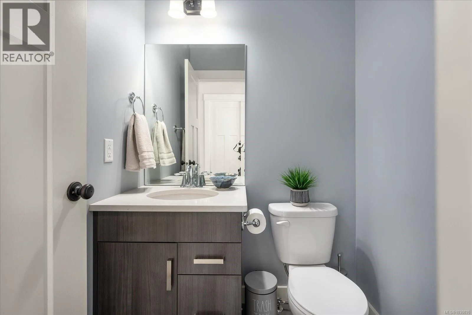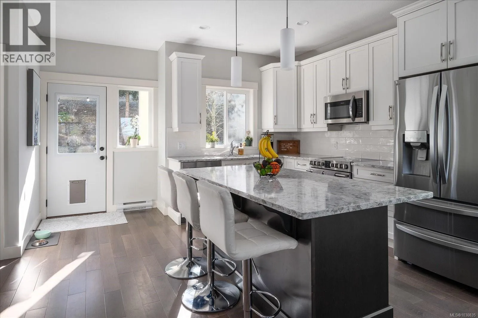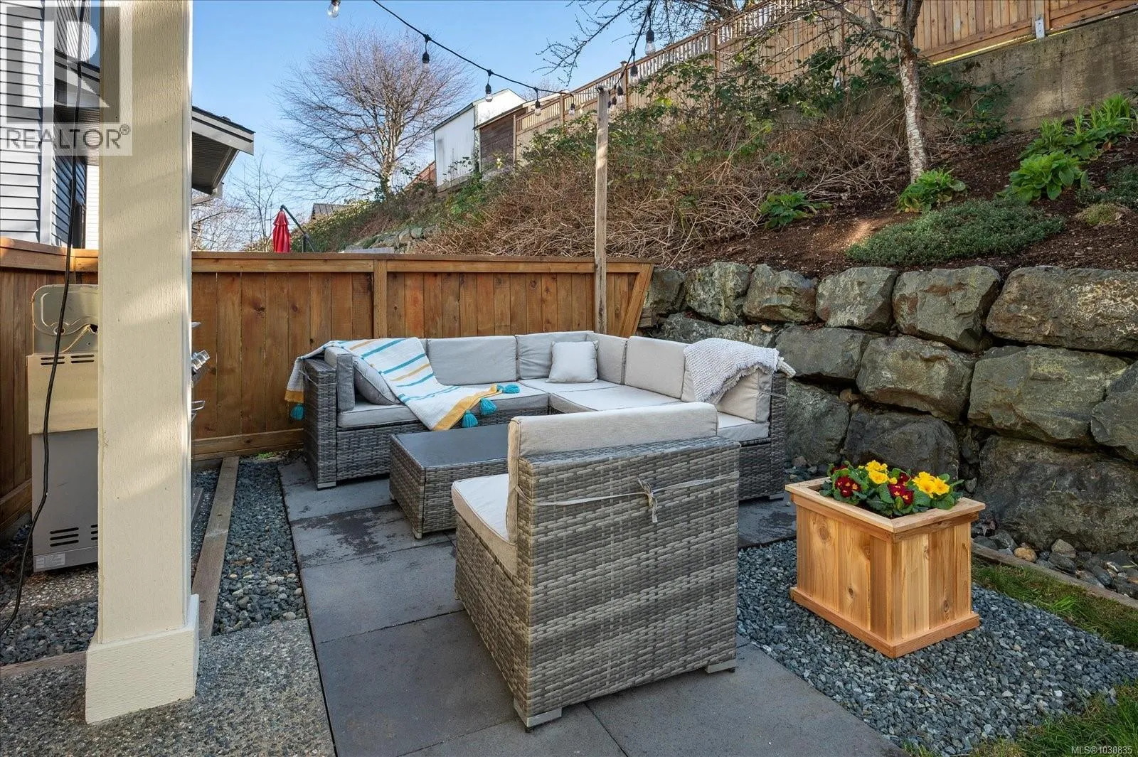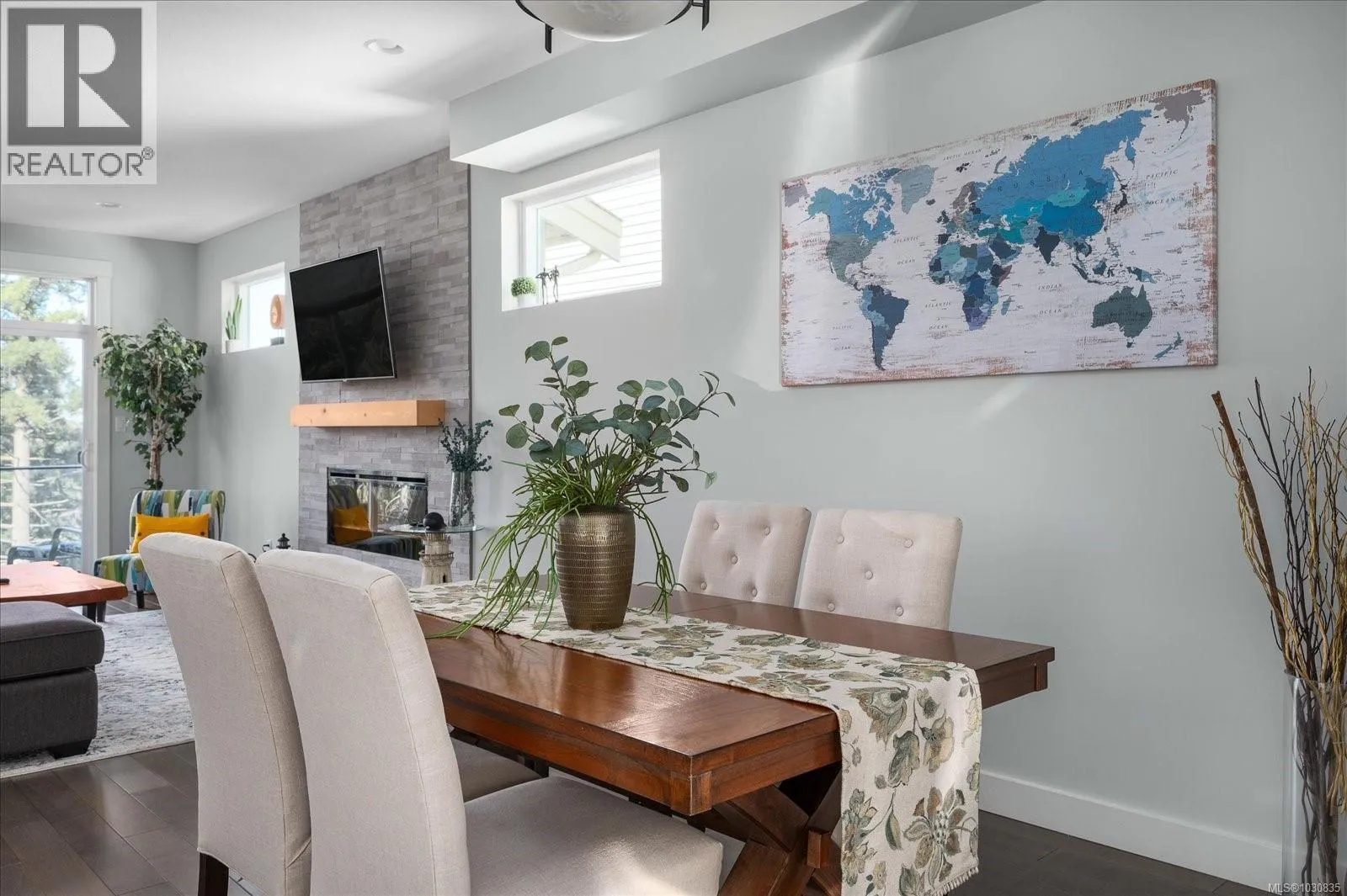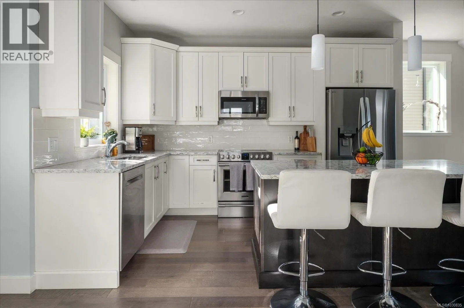 Fabulous detached and updated 3 level newer townhome! Like living in a single family home without any of the home owner hassles. The strata takes care of all exterior maintenance except your yard. Offering almost 2300 Sq.Ft. of living on 3 levels with no shared walls. The main floor offers a bright and airy great room with a large kitchen with quartz counters and a generous pantry. There is also a lovely living/dining room with beautiful fireplace and ocean views. From this level you can also enjoy a deck and fully fenced yard area with patio. Perfect for pets. The lower level features a large bedroom and full bath while the top floor has 3 more bedrooms including a stunning primary and 2 more bathrooms. The floor plan is ideal for a young family or students attending VIU. This small quiet strata community is perfectly situated for convenience to amenities and is a easy walk to Westwood Lake and restaurants. There is also an oversized single garage and lots of parking. Well managed and pets are welcome too! (id:27476)