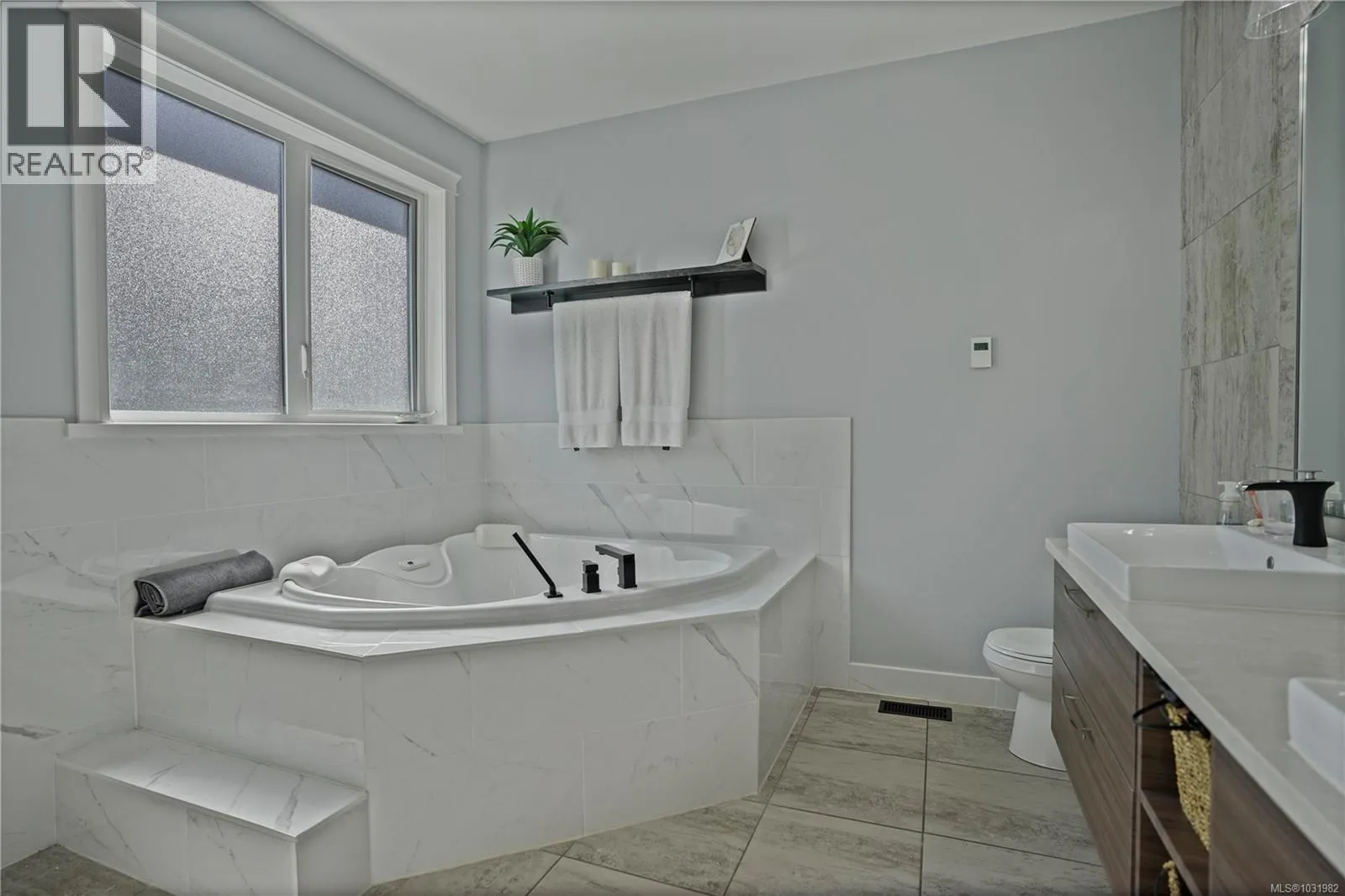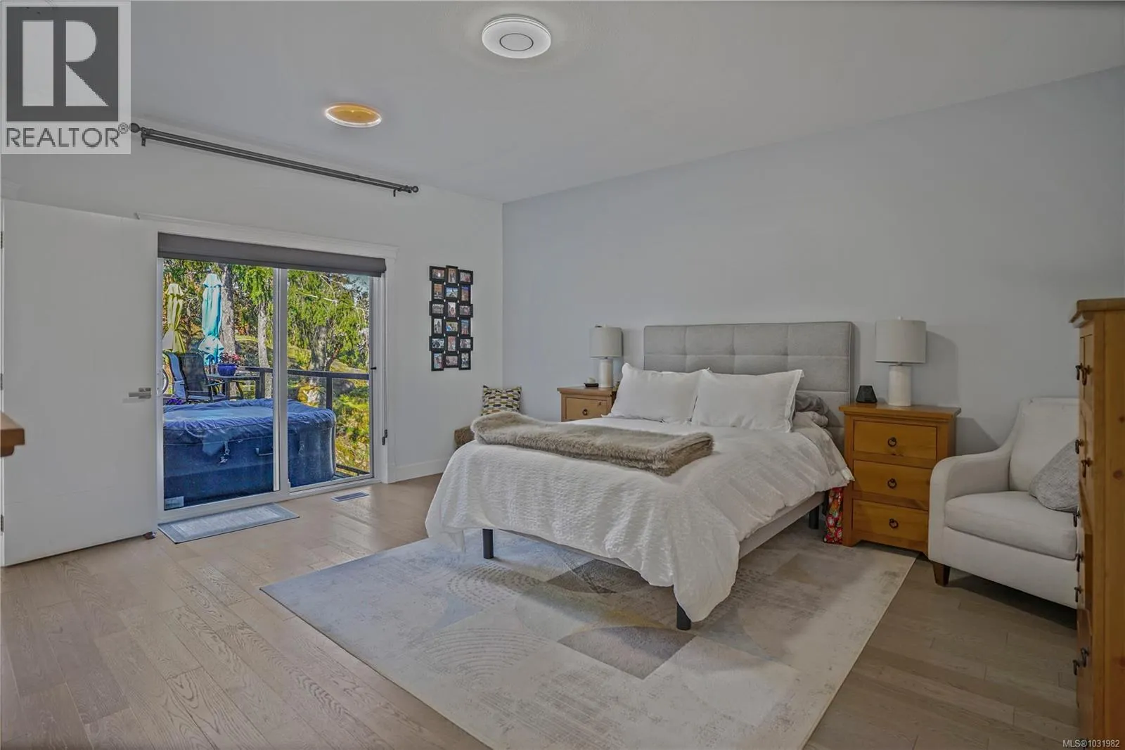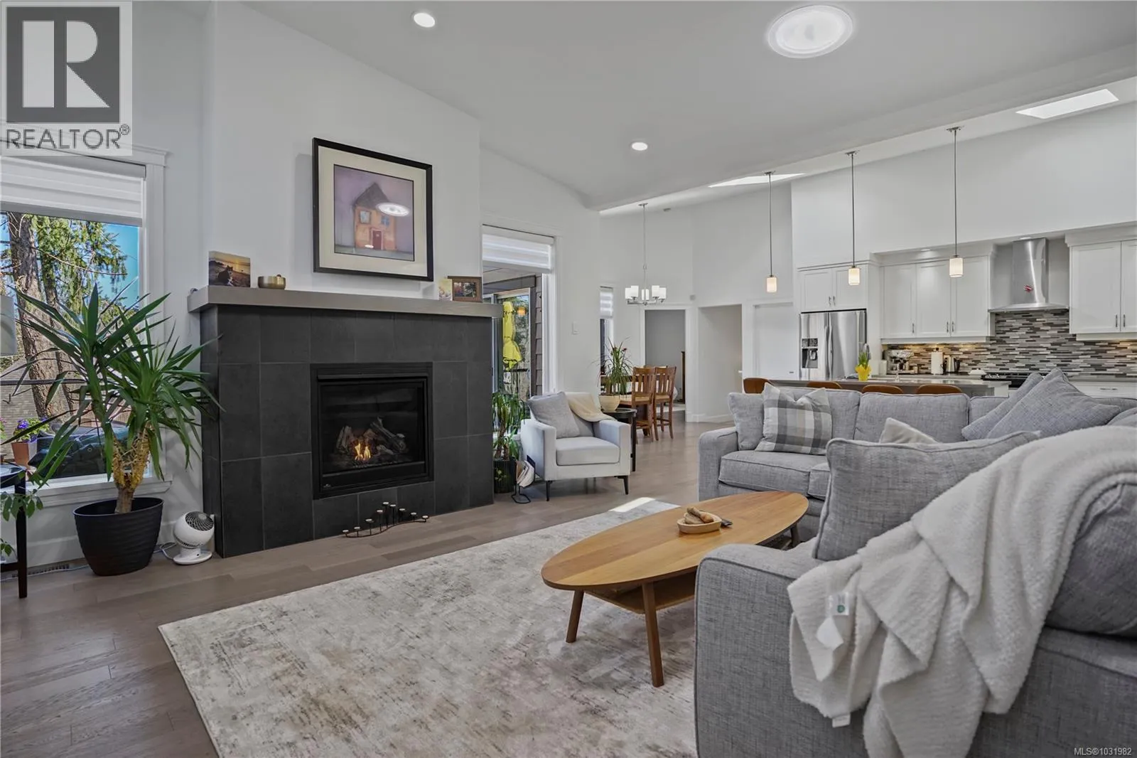 This stunning home is perfectly placed near the end of a quiet no-thru road in the sought-after Rockwood Heights of Departure Bay. Surrounded by mature cedar and arbutus trees, this private, sun-filled property blends natural beauty with contemporary West Coast style in a central, convenient location. This thoughtfully crafted 3 bed/3 bath home features an 1800 sqft main level of open-concept, single level living and is complemented by a versatile lower-level flex space, ideal for a media room or gym. Vaulted ceilings with skylights and expansive windows create a bright, airy interior. The modern kitchen includes a large island and sleek cabinetry, perfect for entertaining. Quality finishes include engineered hardwood, heated tile floors, natural gas fireplace and an efficient heat pump for year round comfort. Exterior highlights include Hardie Plank siding, cedar and stone accents, membrane roof, and hidden gutters, plus ample storage and crawl space. Showings by appointment only. (id:27476)